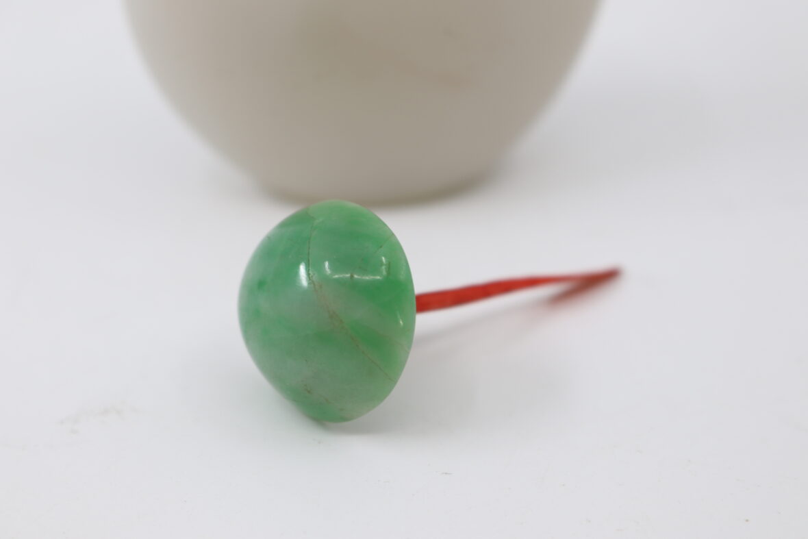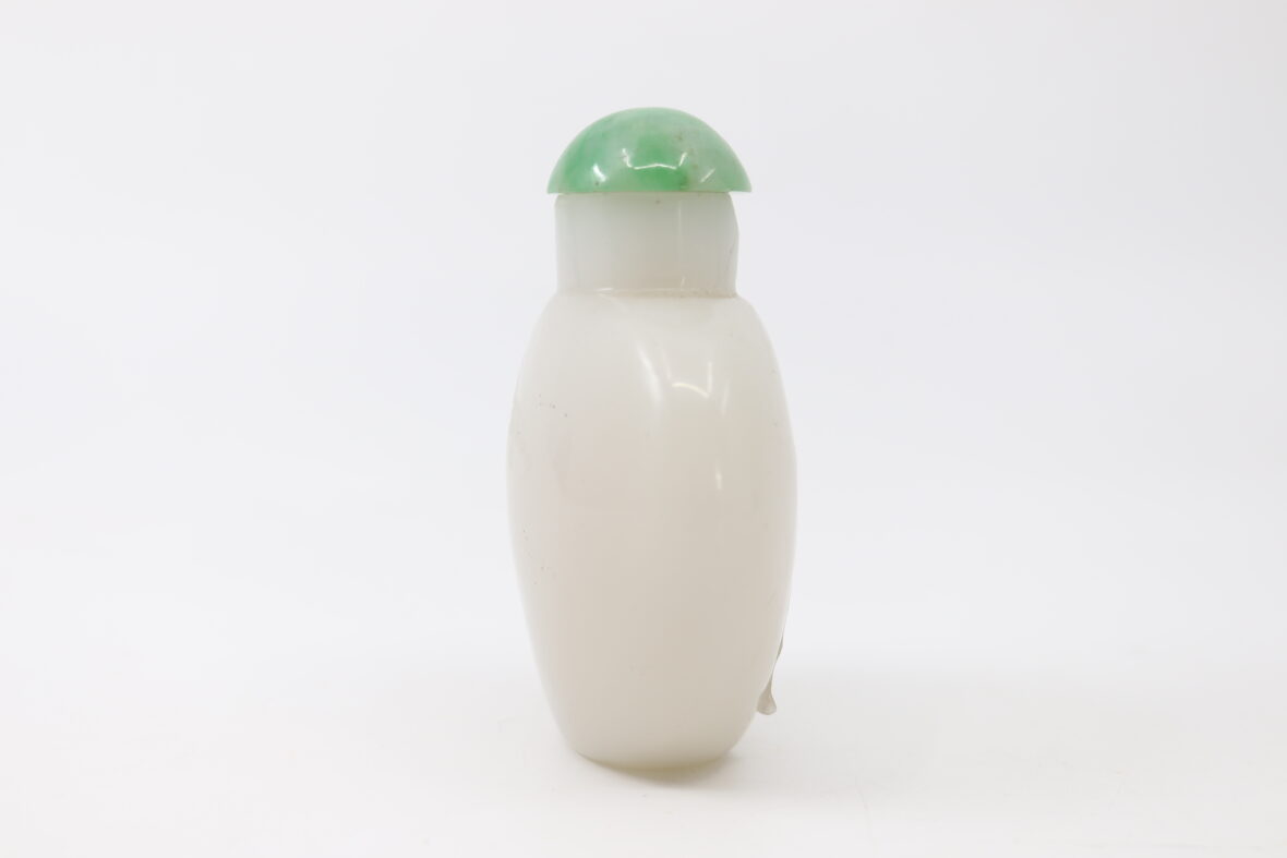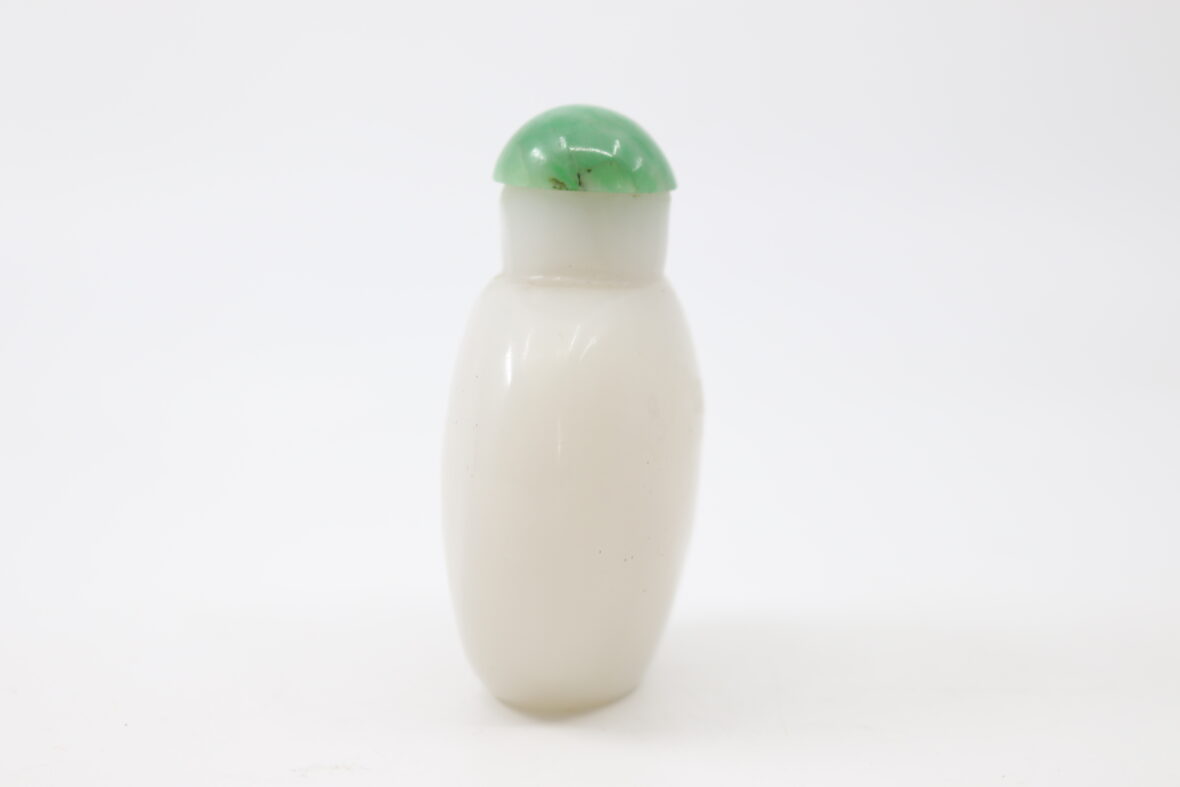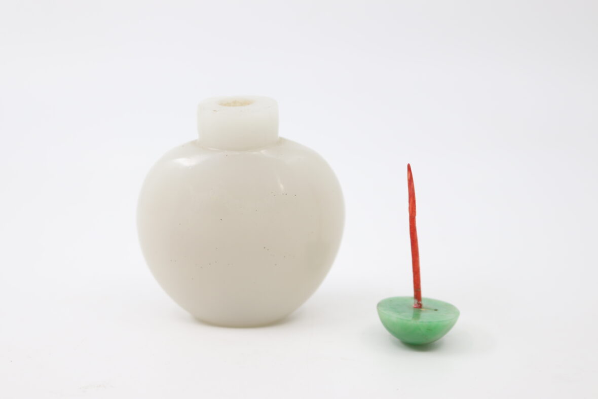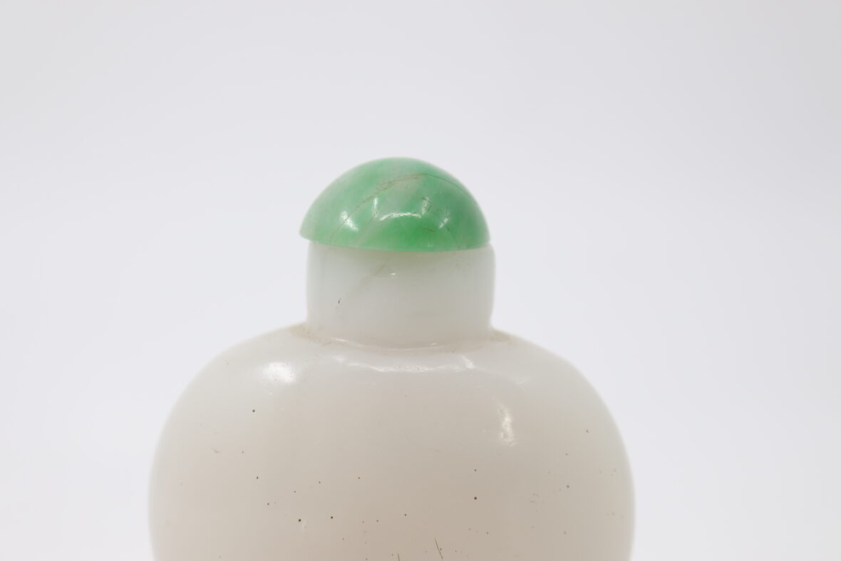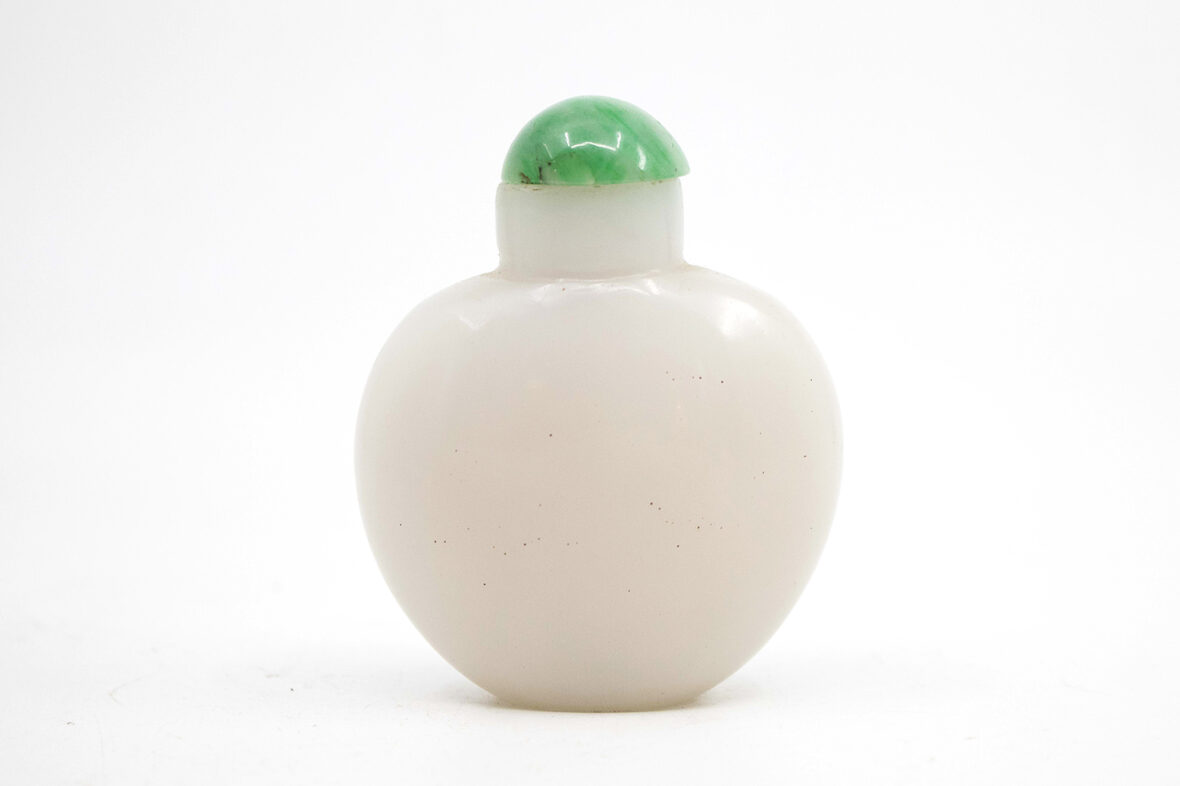 Tabatière en verre opalin, le bouchon en cabochon de pierre dure.