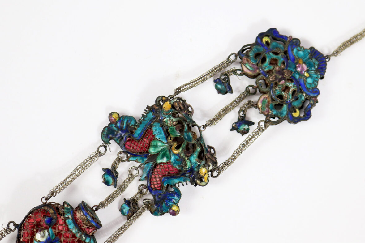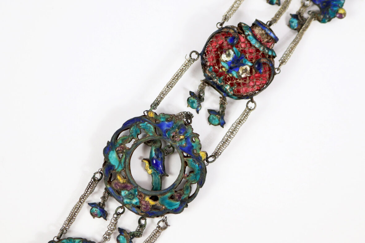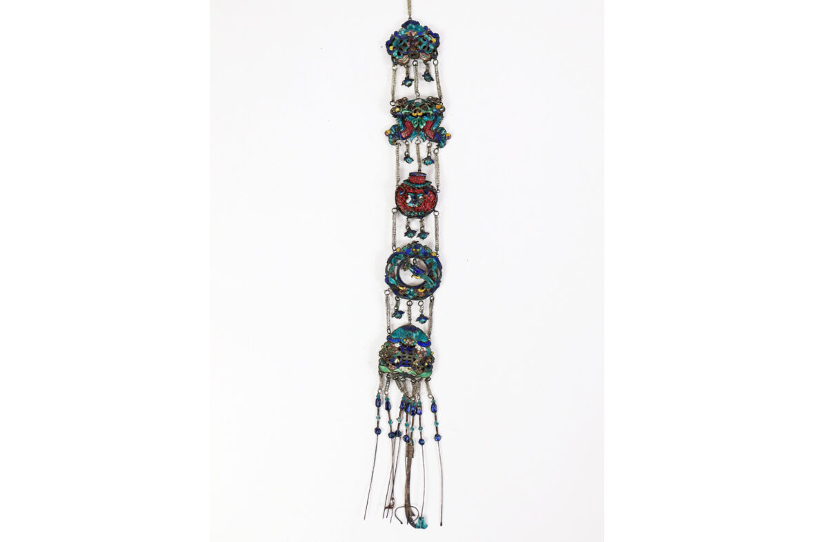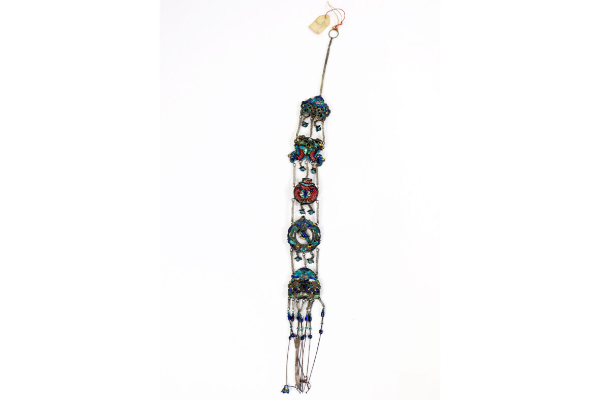 Très belle châtelaine à opium en métal à décor émaillé polychrome.