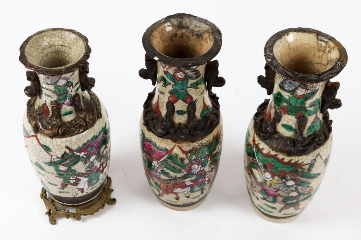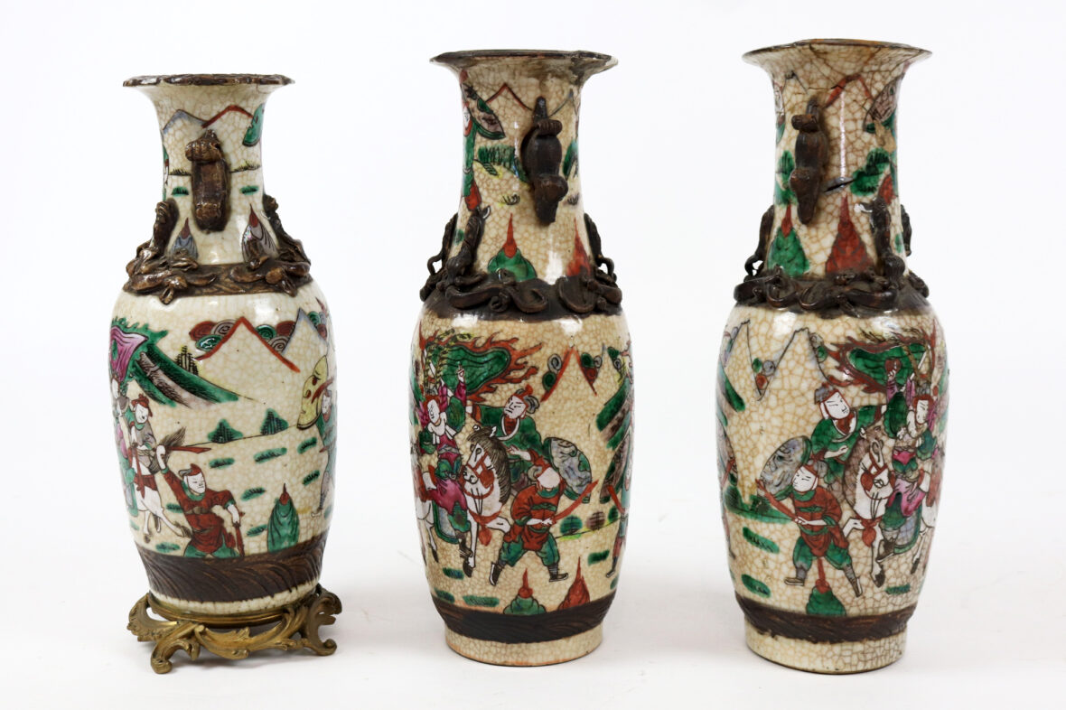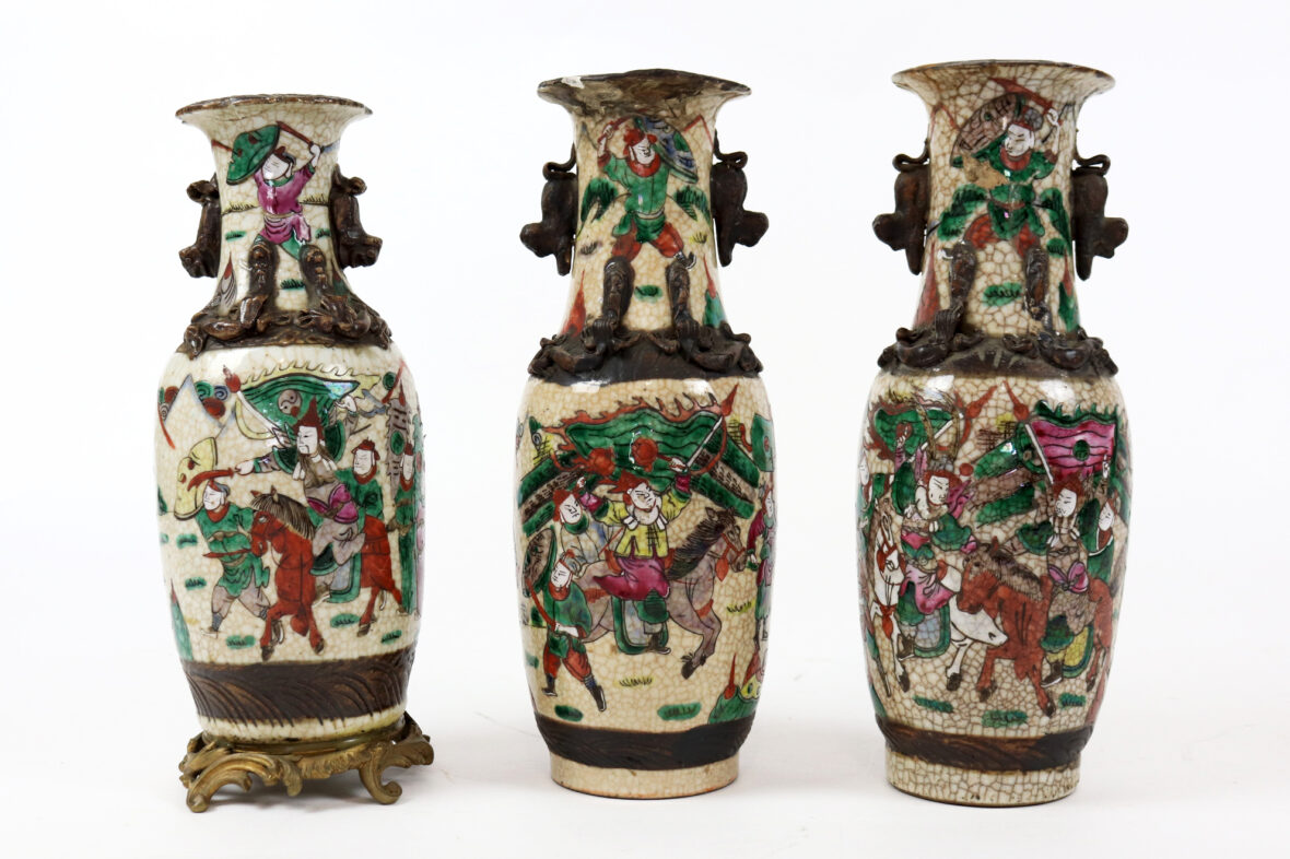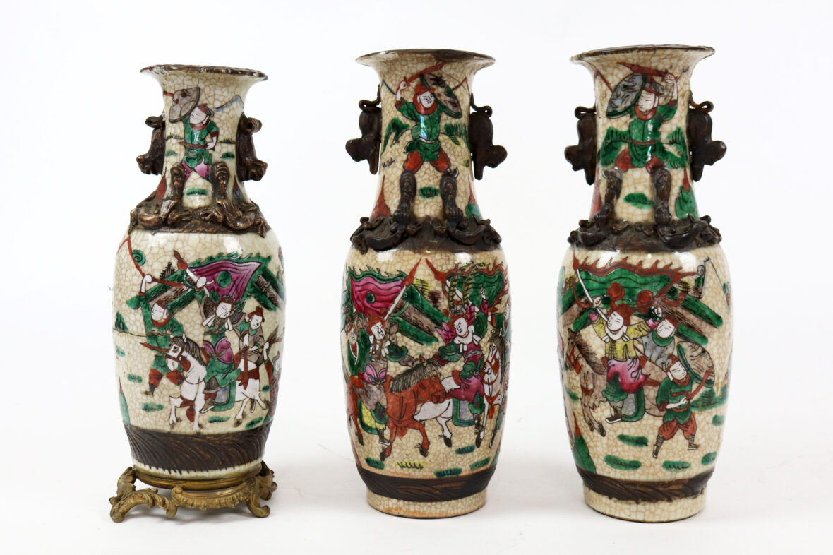 Ensemble de 3 vases en céramique à décor de scène de bataille.