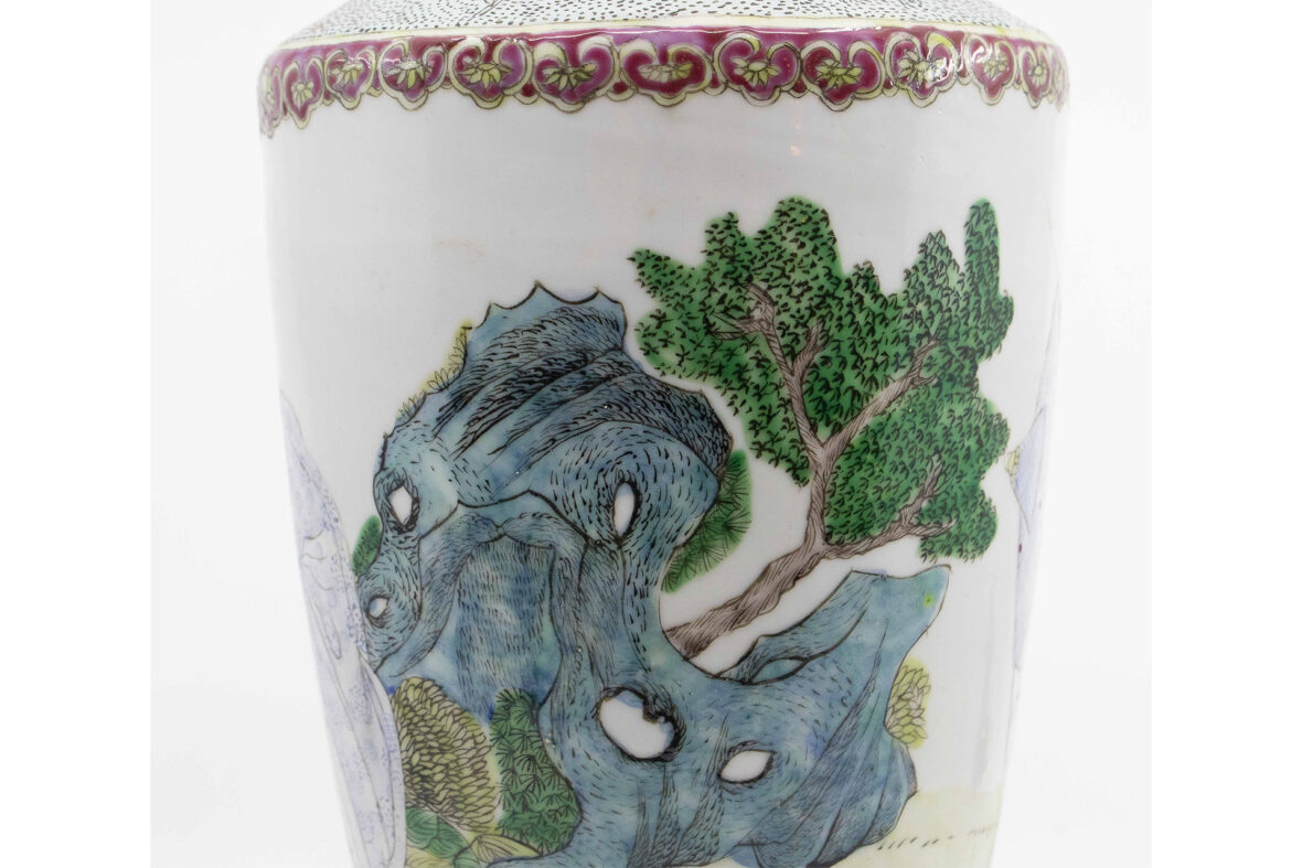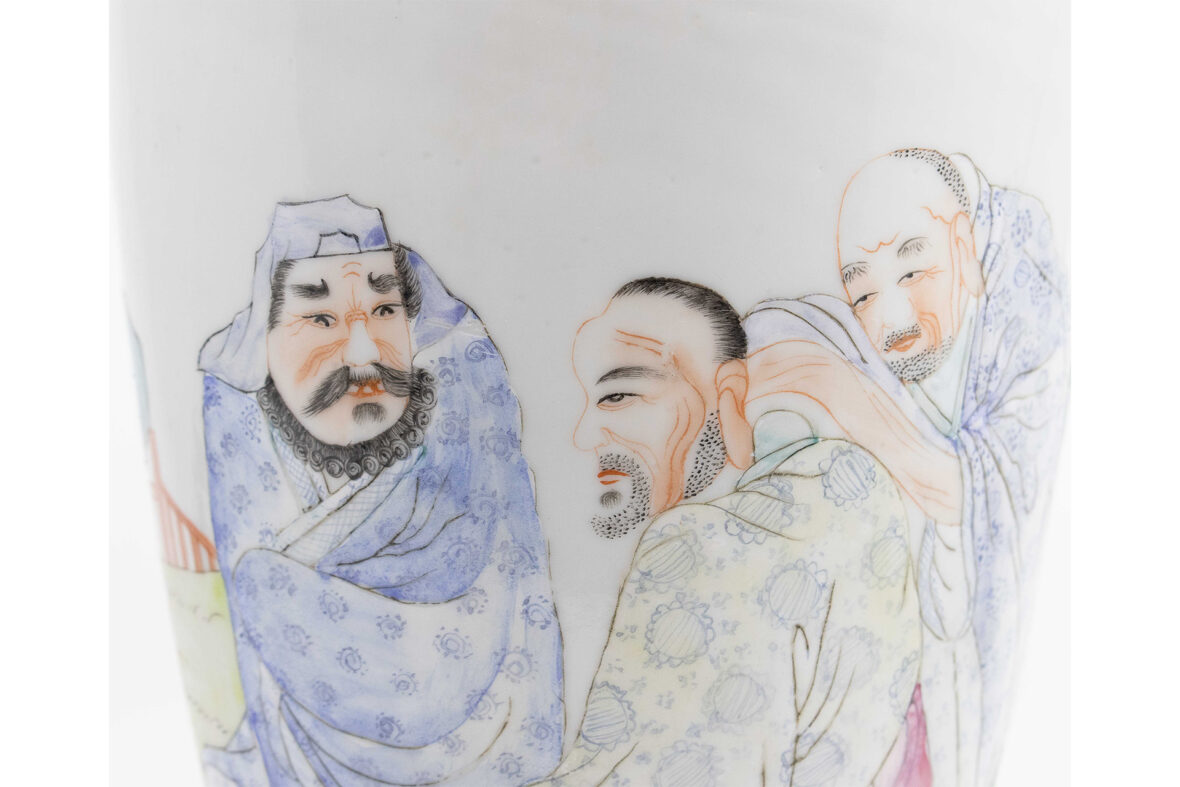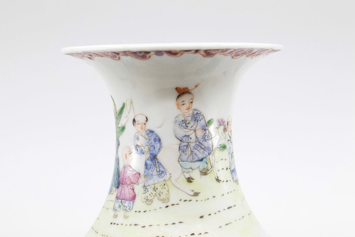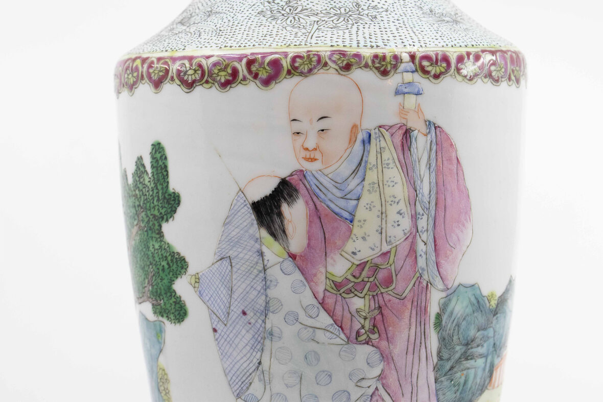 Vase balustre en porcelaine et émaux polychromes, à décor d’érudits. Le pourtour du col et le haut de la panse ornés d’un frise de têtes de ruyi.