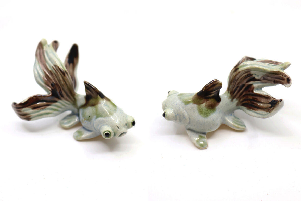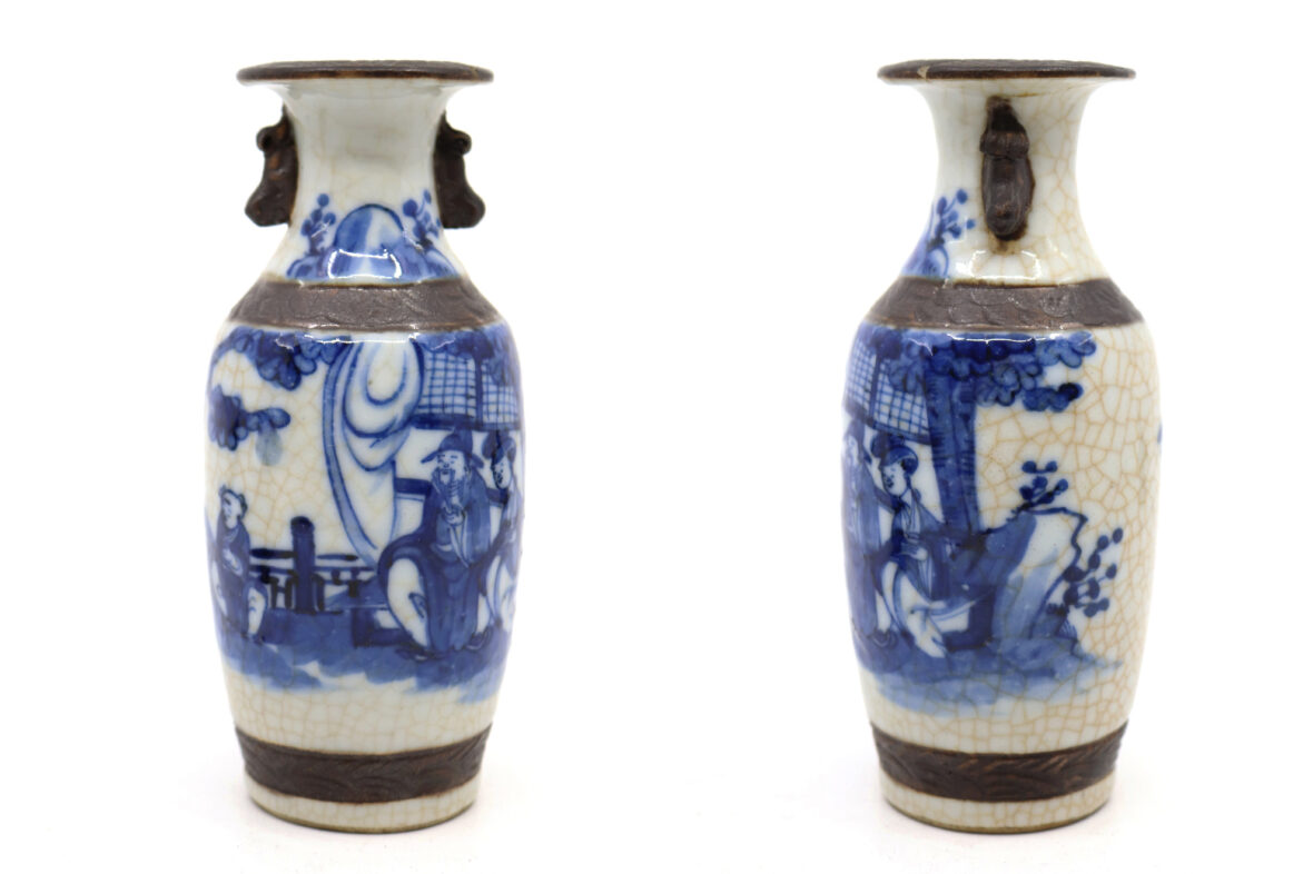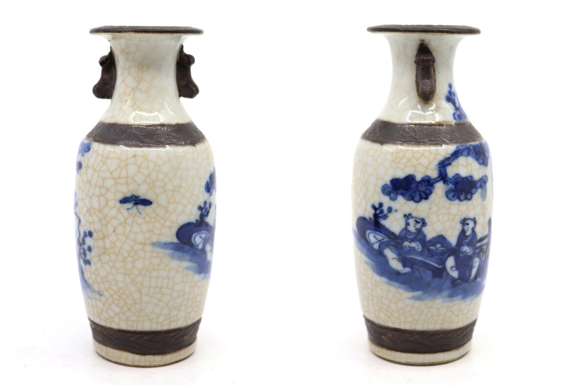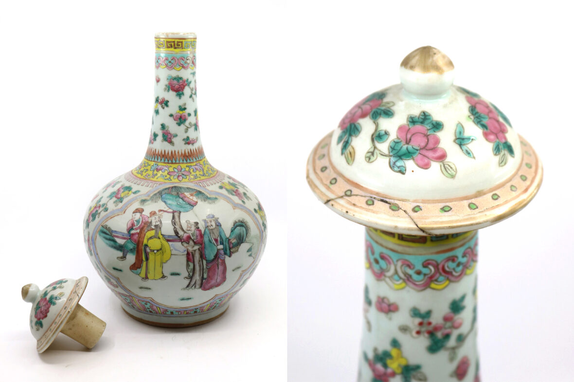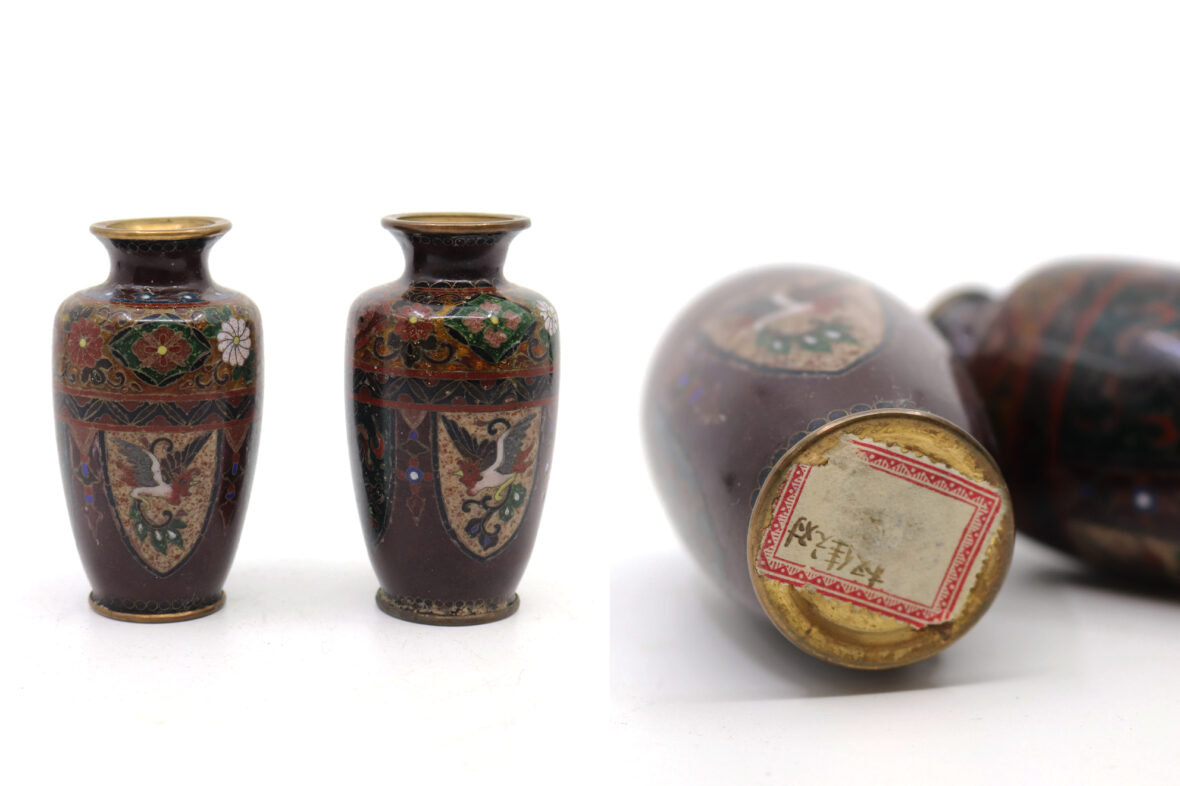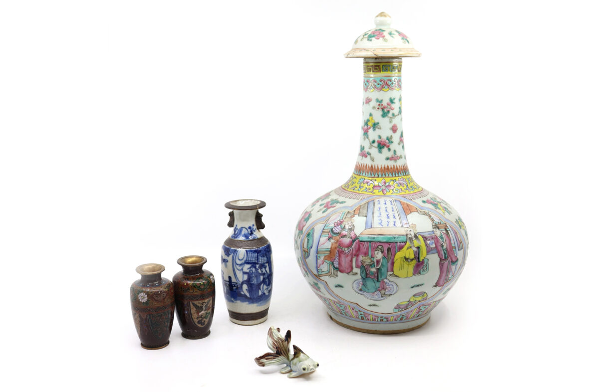 On y joint une paire de petits vases en cloisonné (Haut. : 9 cm), un petit vase à décor blanc bleu (Haut. : 15 cm ) et une carpe chinoise en porcelaine (Long. : 6,5 cm).