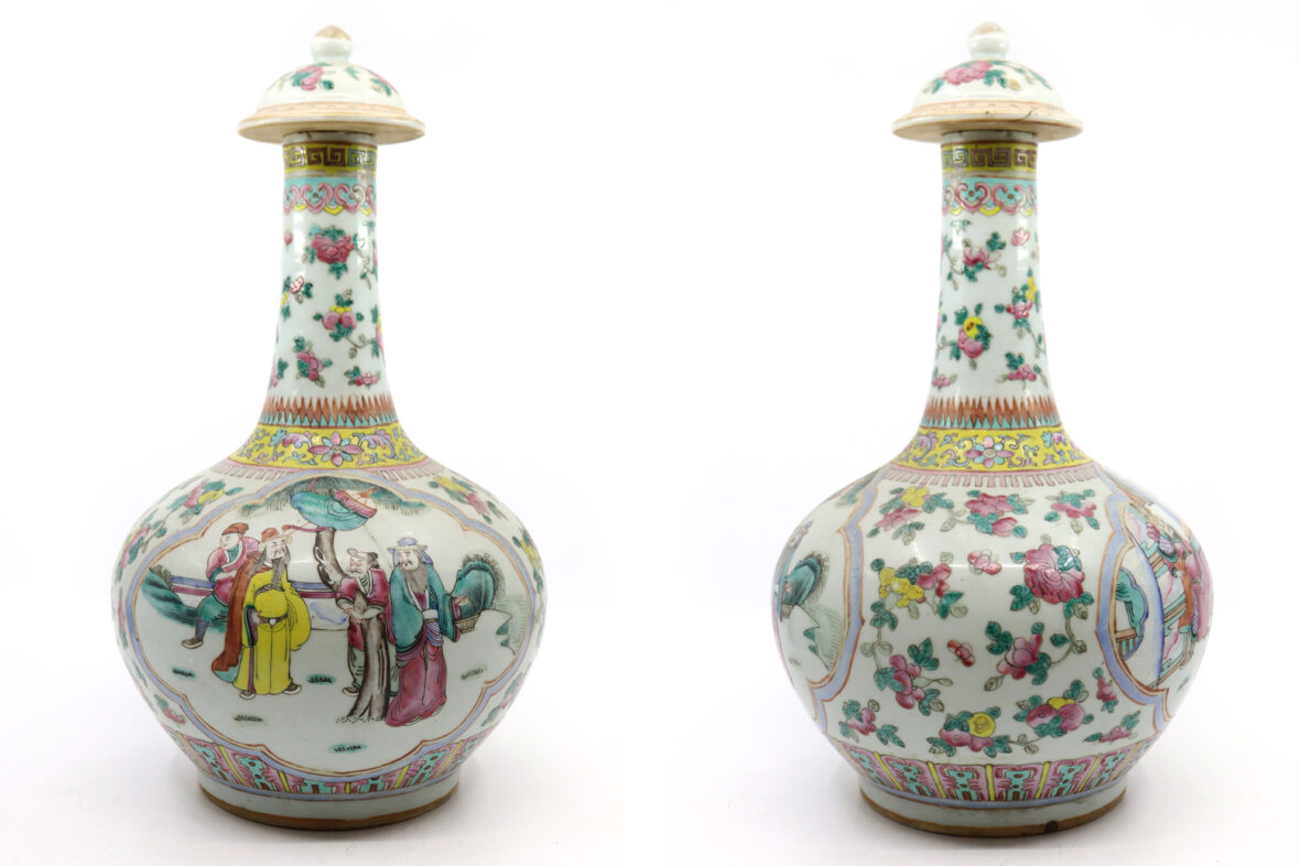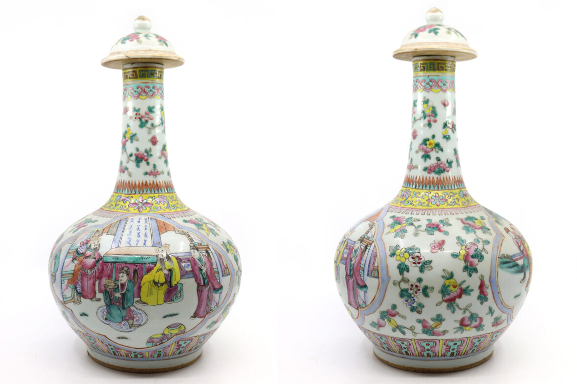 Grand vase gourde en porcelaine émaillée à décor polychrome de scènes animées en réserves. Le couvercle rapporté.