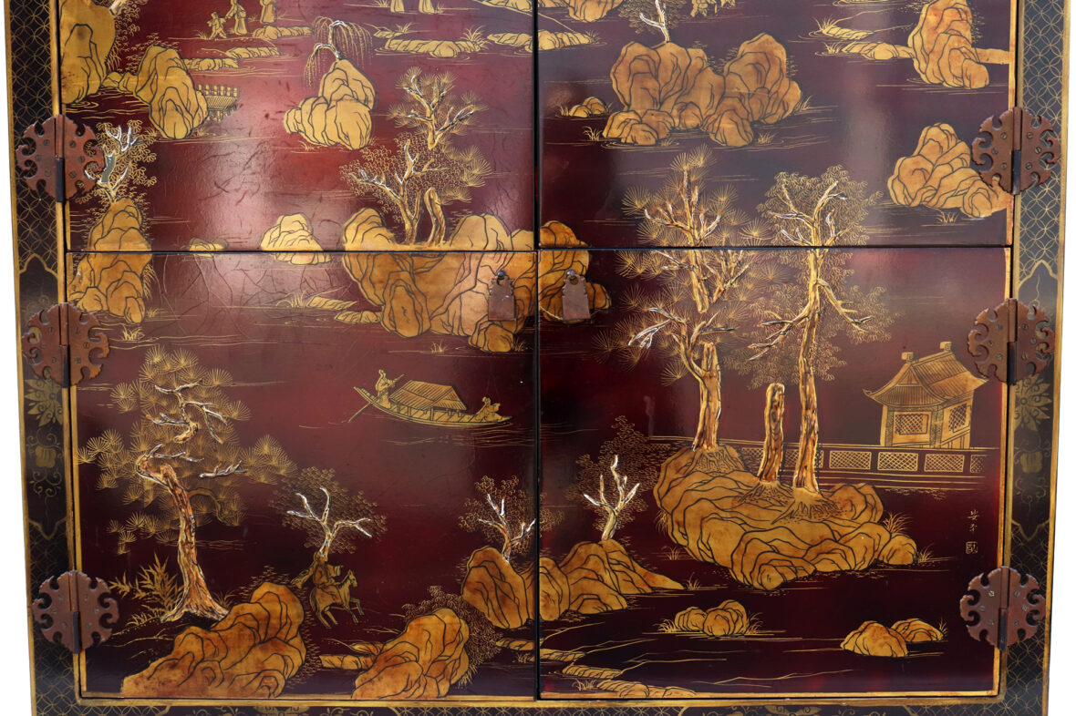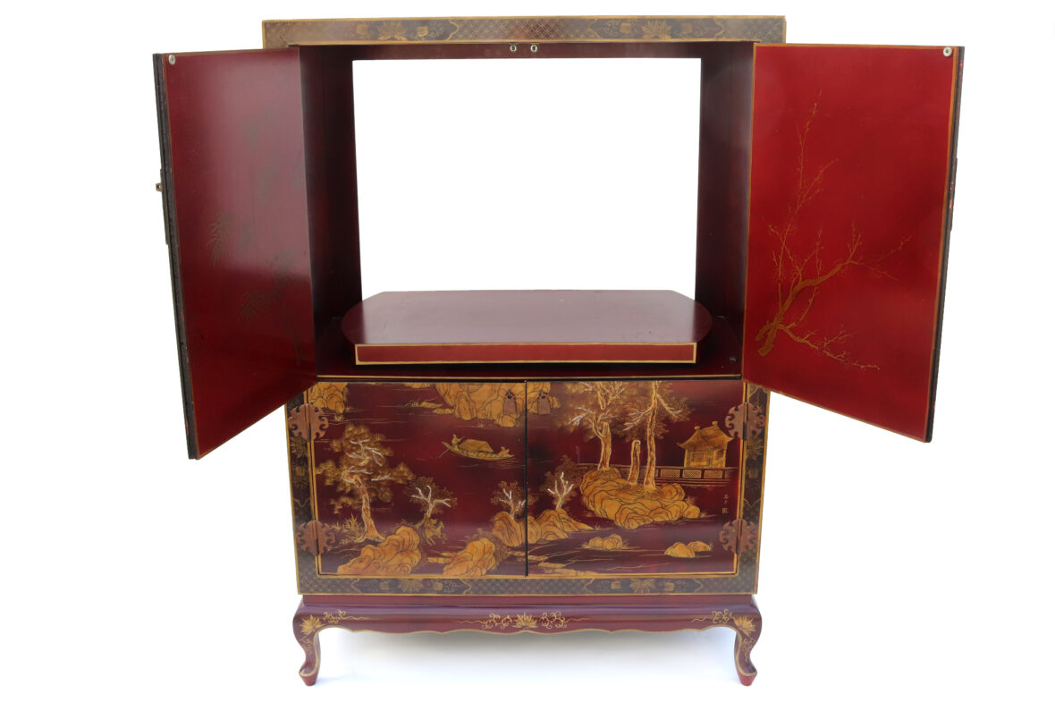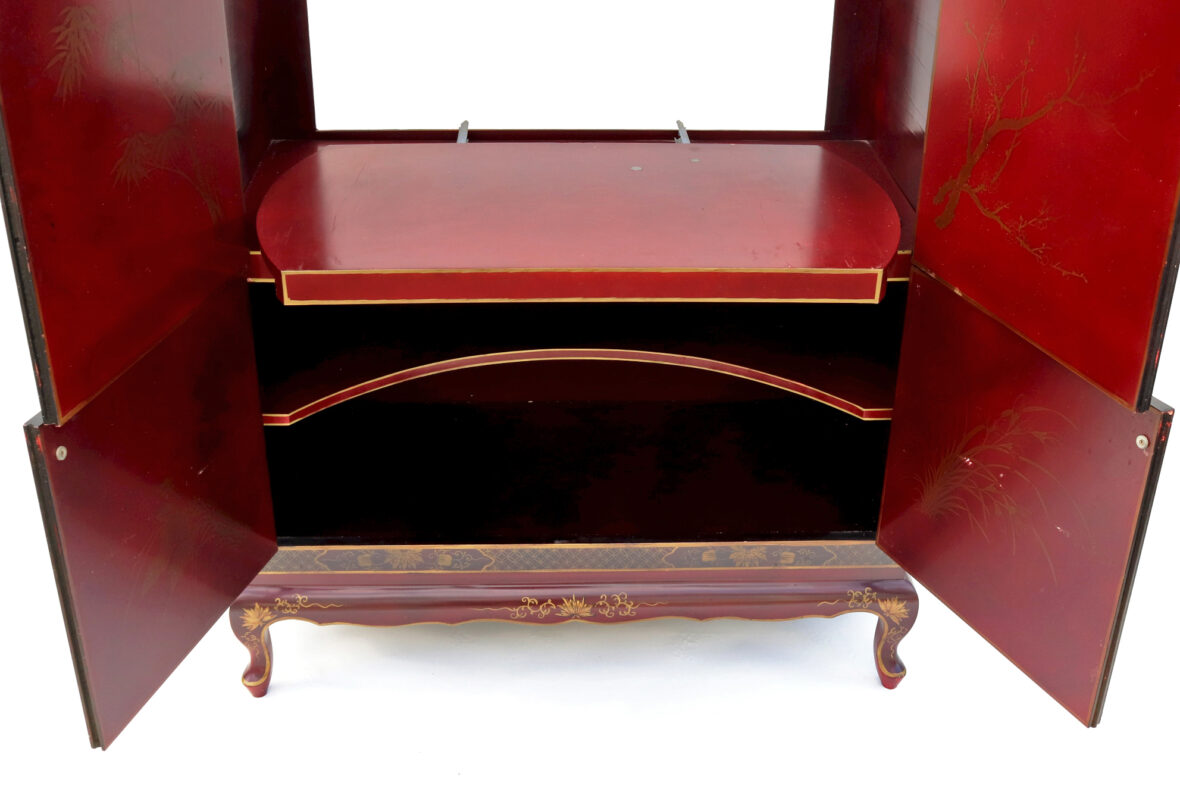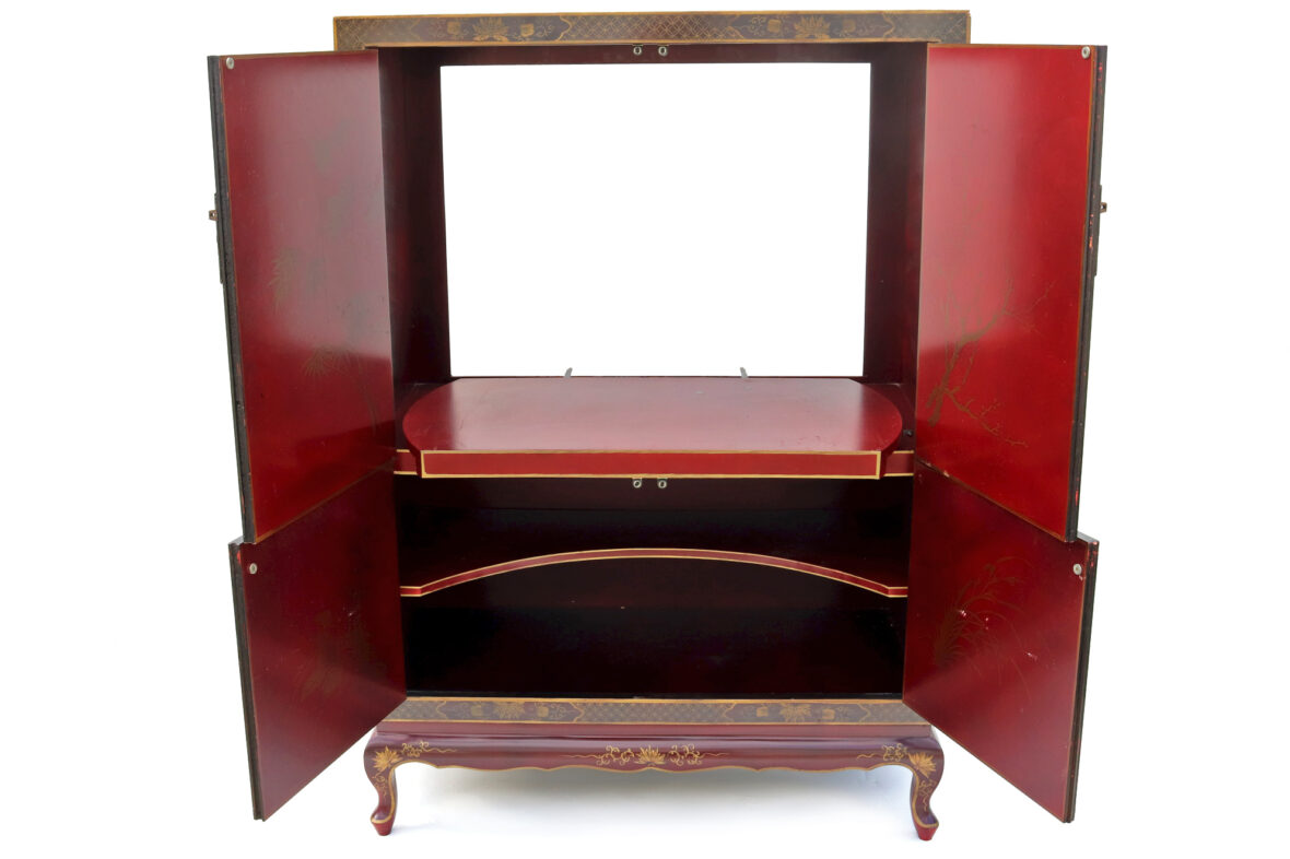 Armoire formant meuble de télévision en bois laqué rouge à décor doré de scènes animées dans des paysages et d’oiseaux branchés. Ouvre par quatre vantaux en façade.