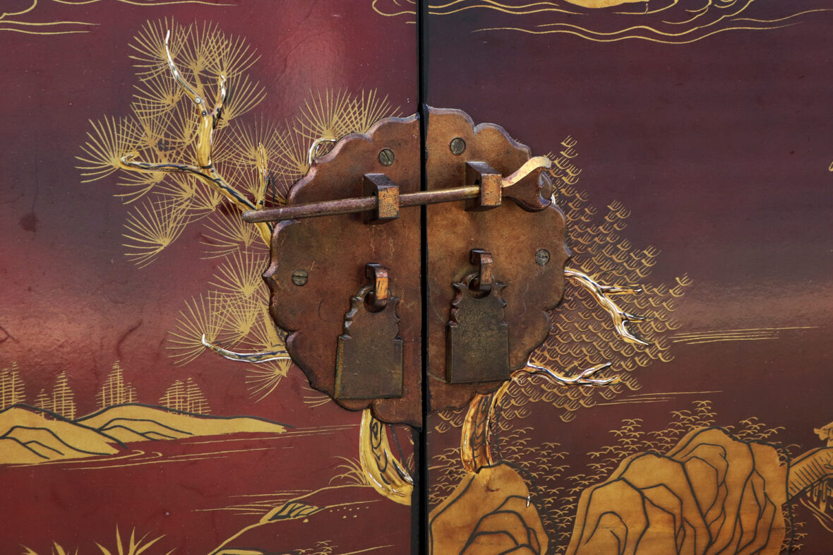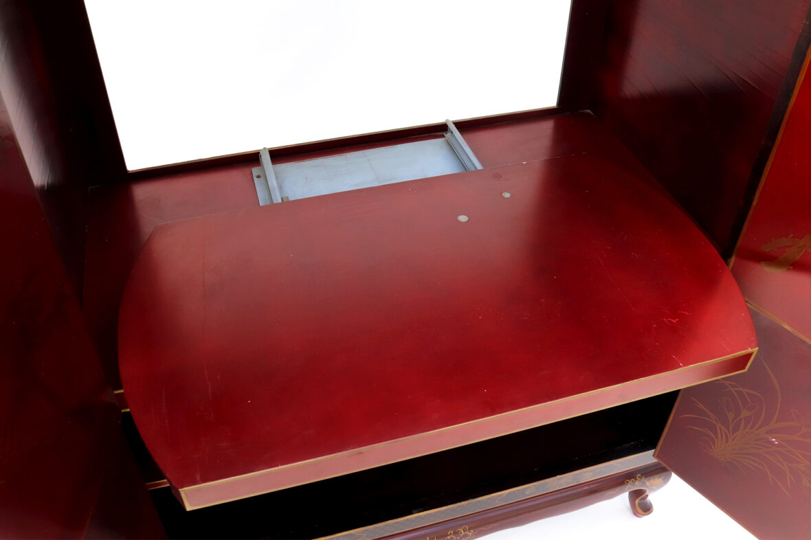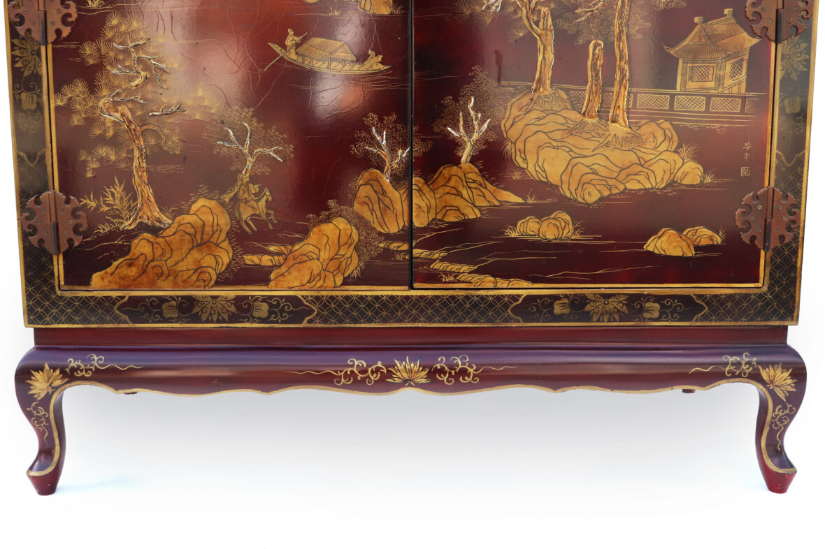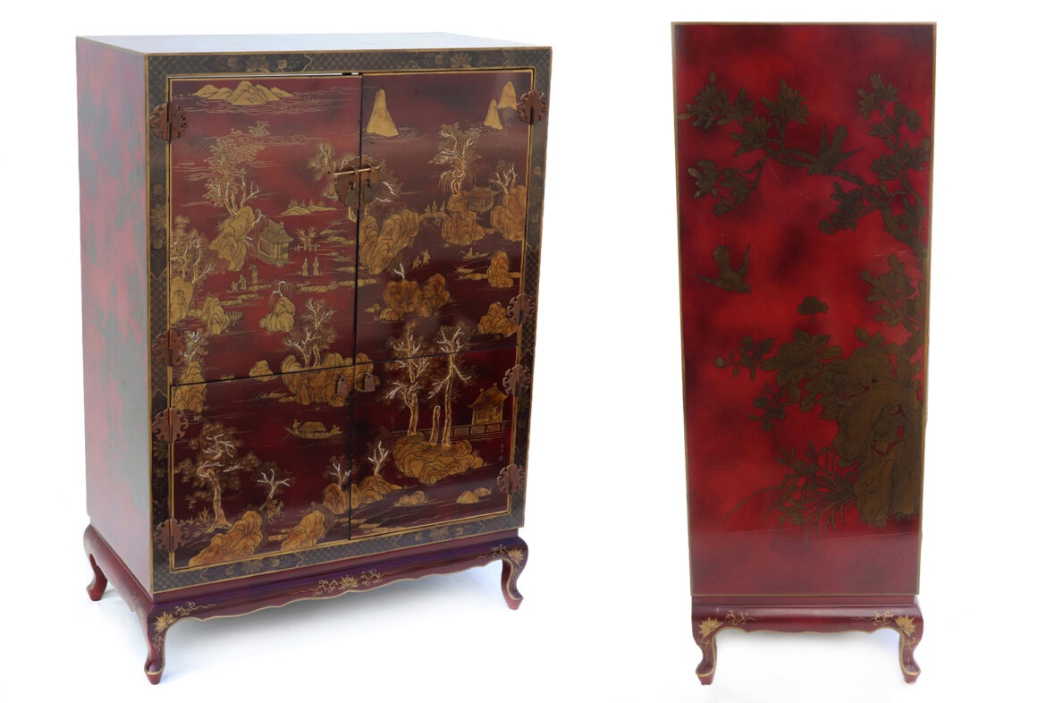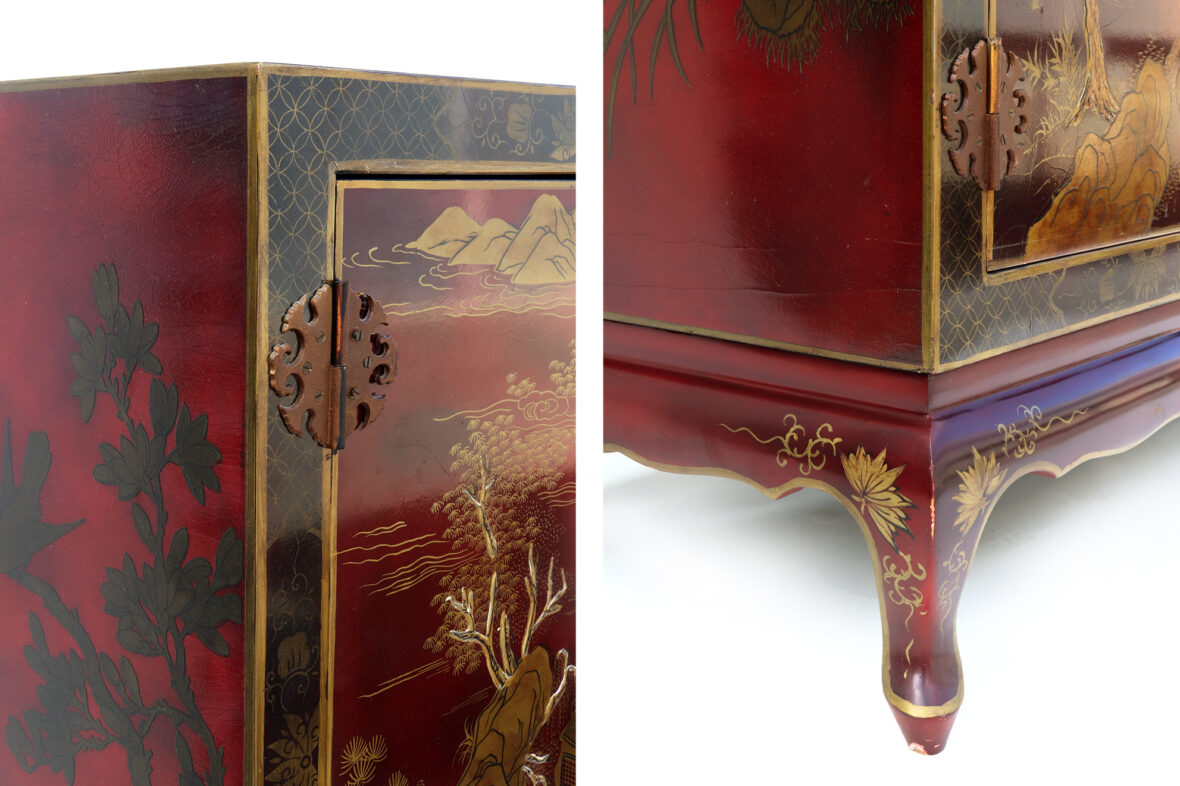 Armoire formant meuble de télévision en bois laqué rouge à décor doré de scènes animées dans des paysages et d’oiseaux branchés. Ouvre par quatre vantaux en façade.