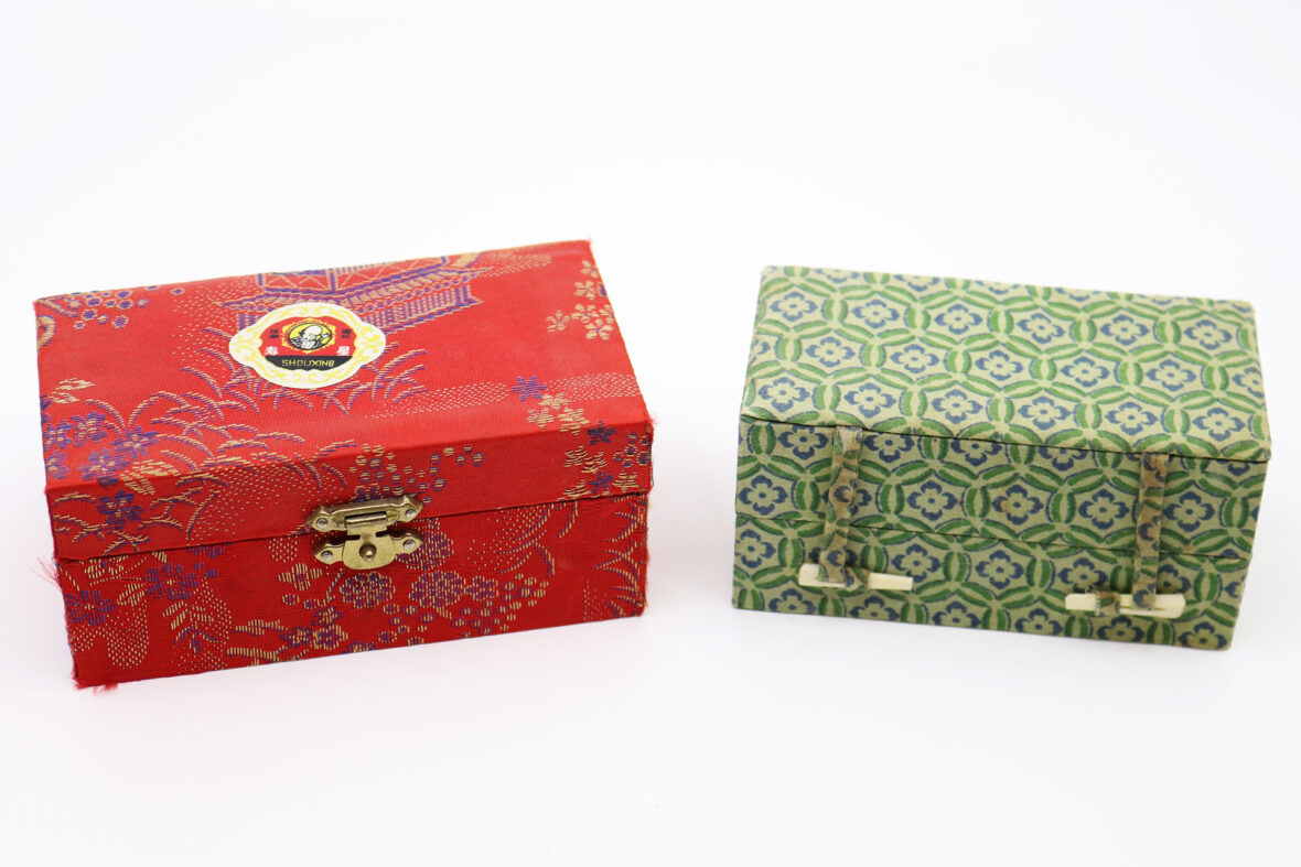 Deux paires de boules de santé chinoises ou Qi-Gong en bronze à décor cloisonné de phoenix et de yin yang. Dans leur coffret d’origine.