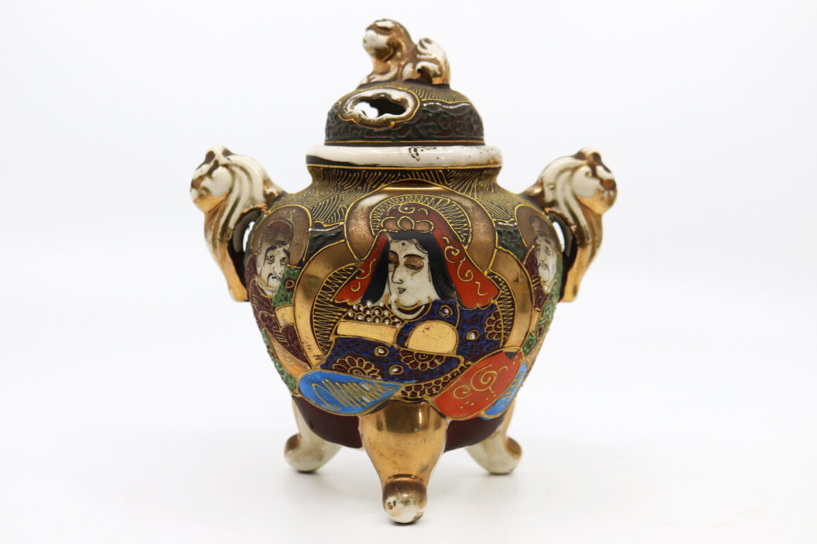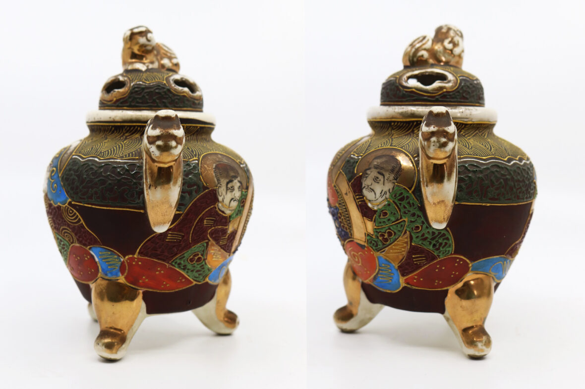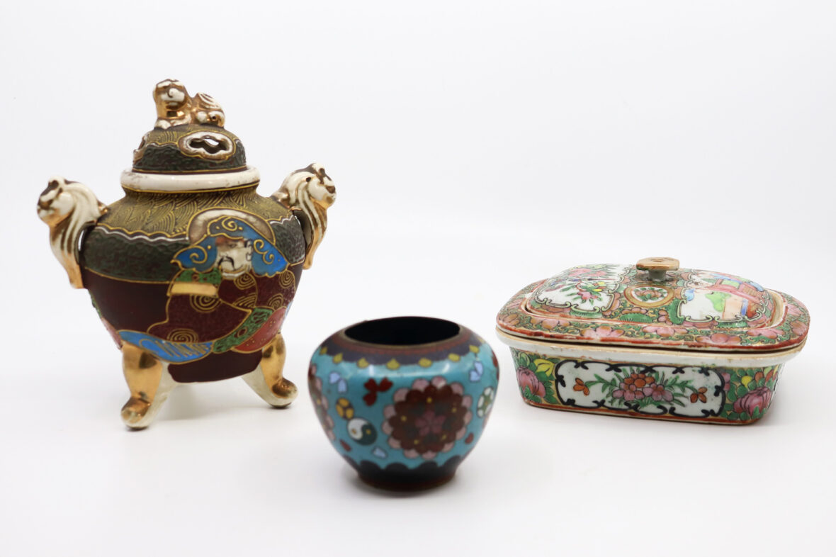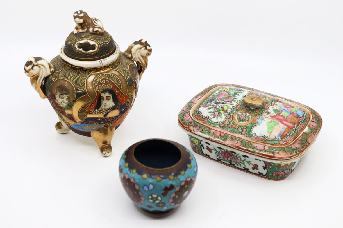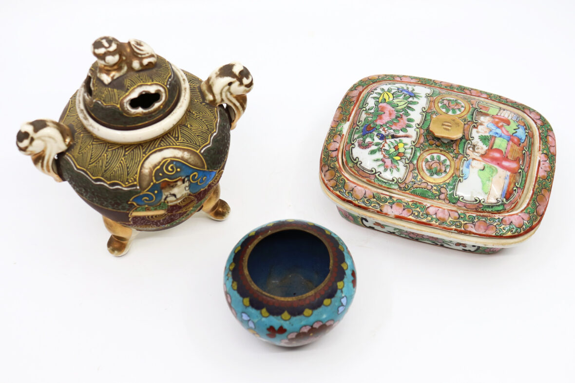 Ensemble comprenant un petit vase en émail cloisonné, une boîte à savon en porcelaine et un brûle parfum en faïence de Satzuma.