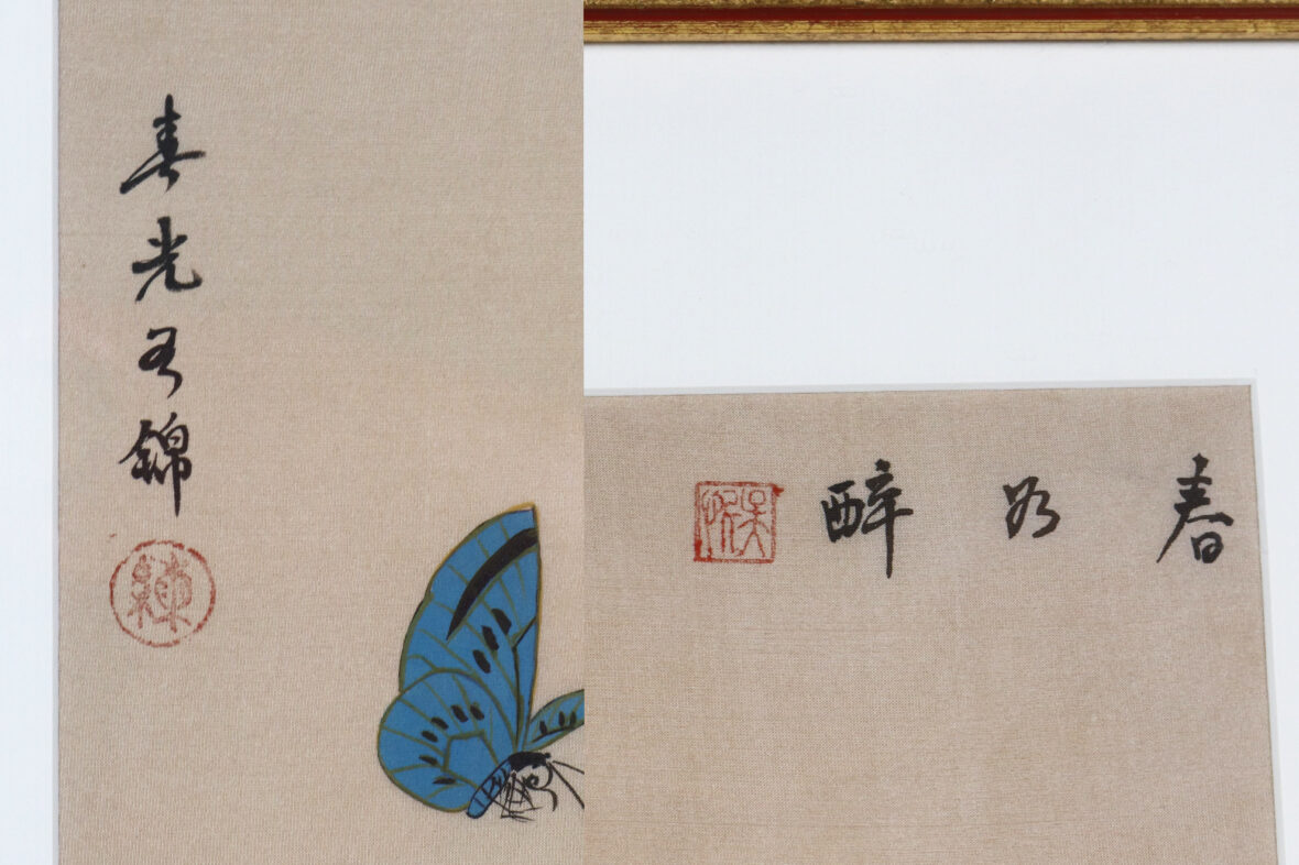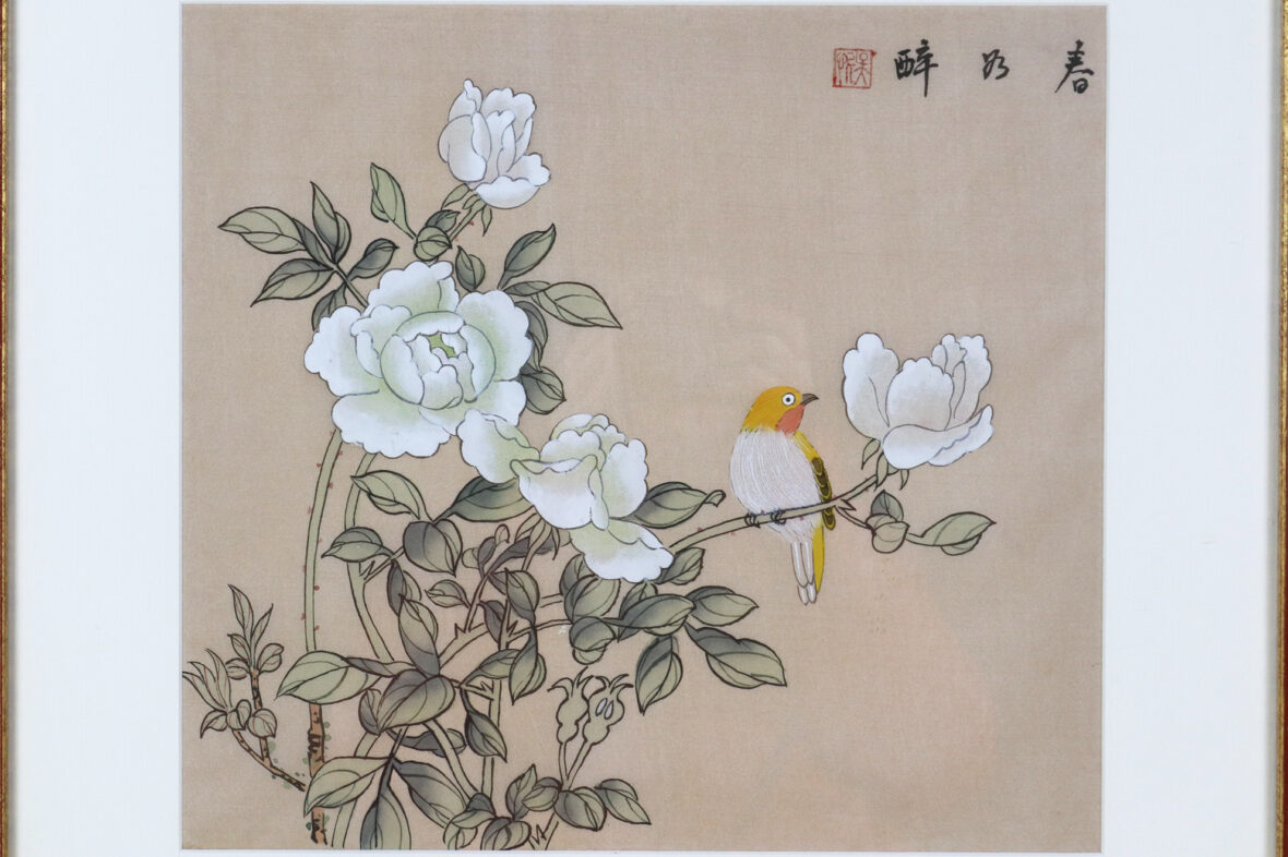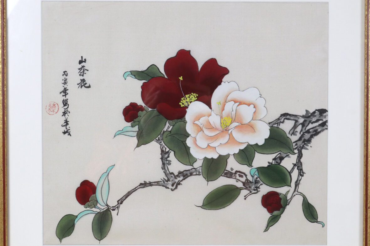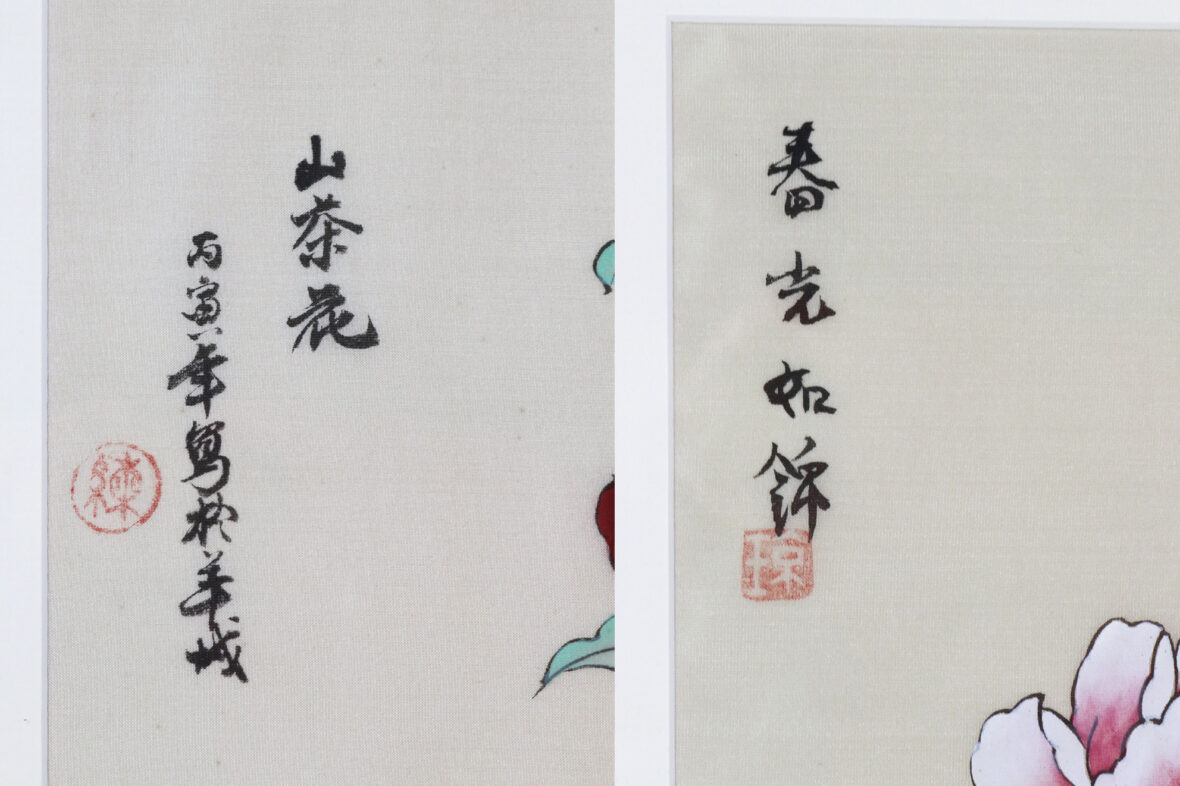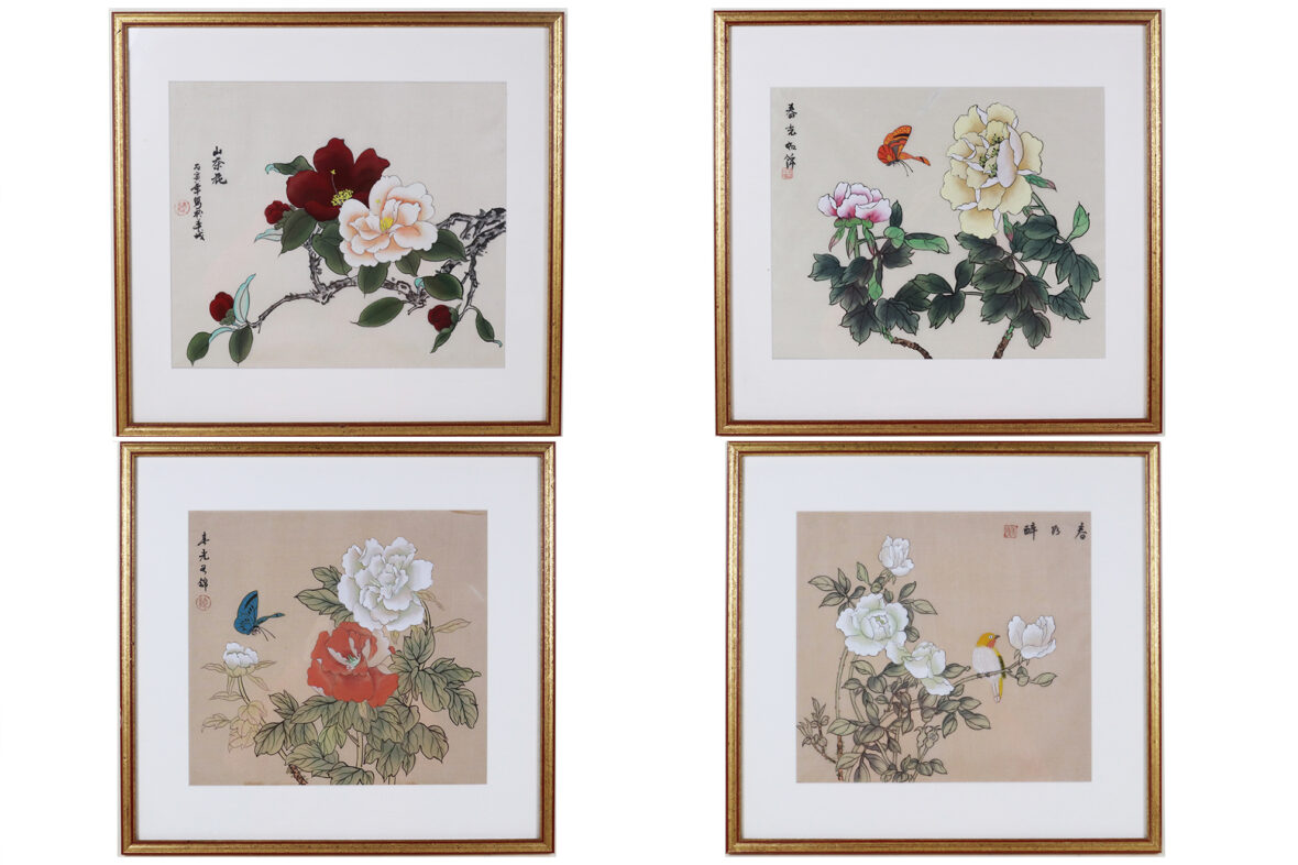 Ensemble de quatre peintures sur soie encadrées à décor de branches fleuries. Signatures et tampon rouge.