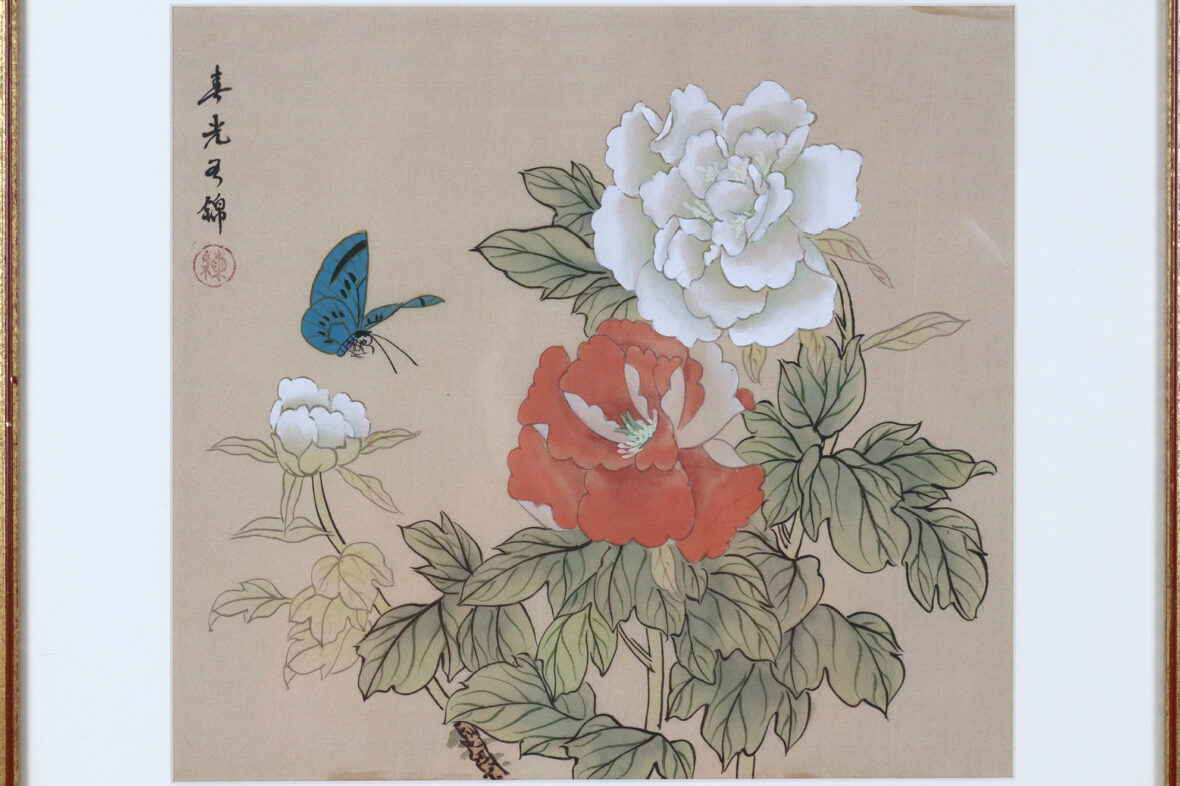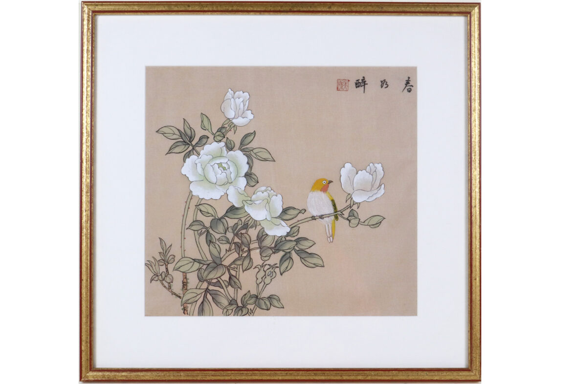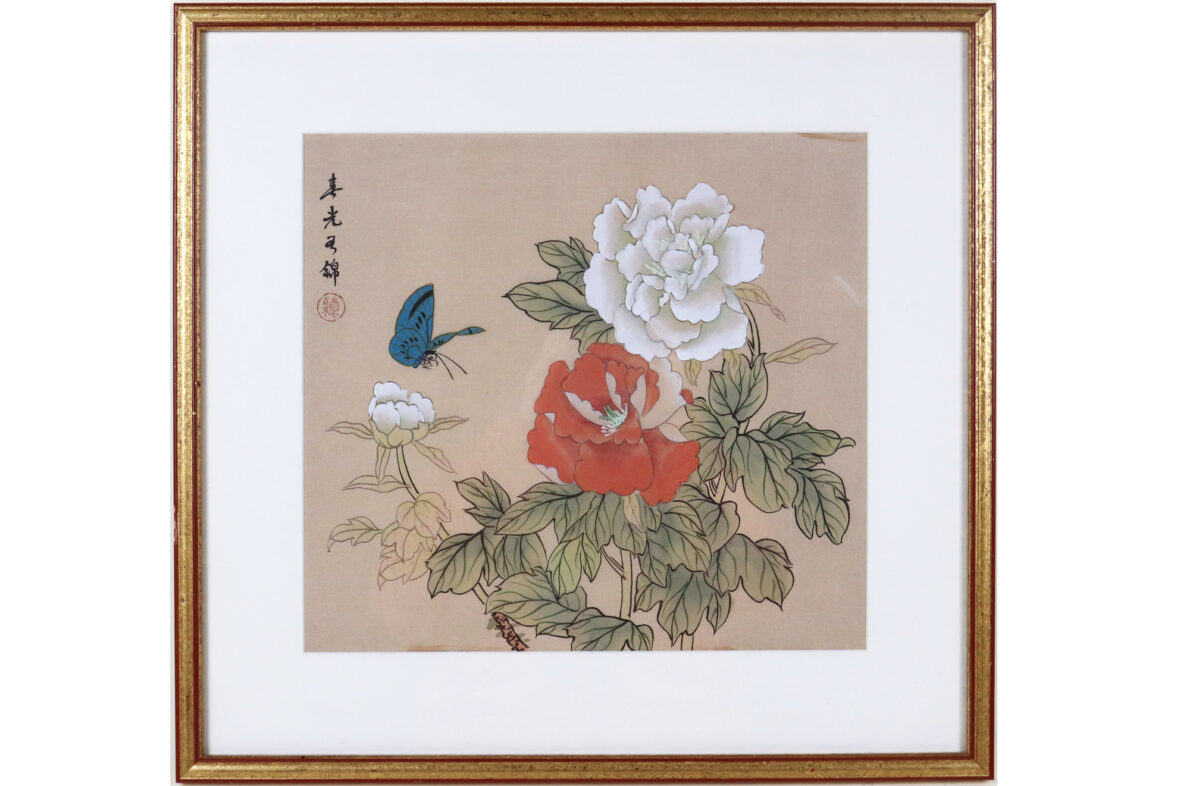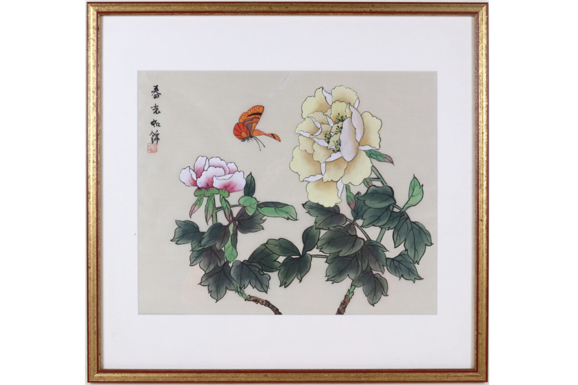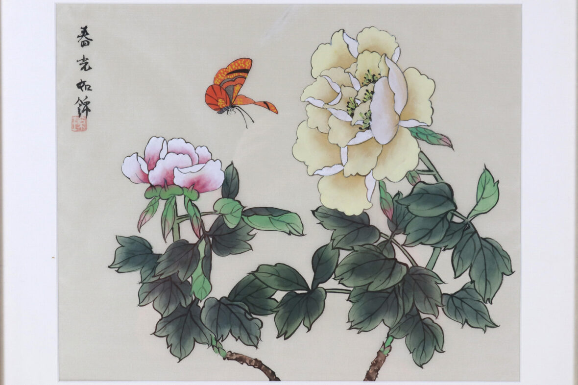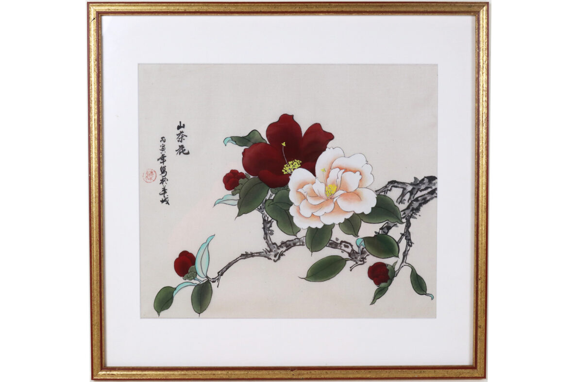 Ensemble de quatre peintures sur soie encadrées à décor de branches fleuries. Signatures et tampon rouge.