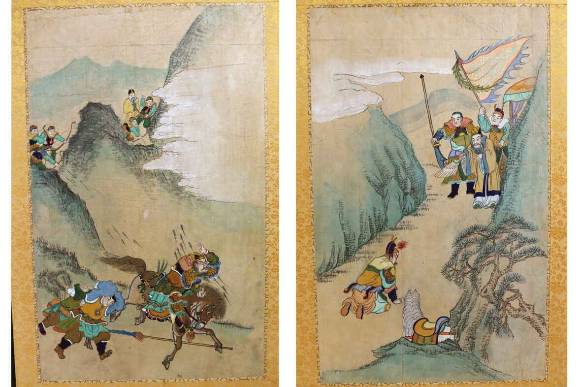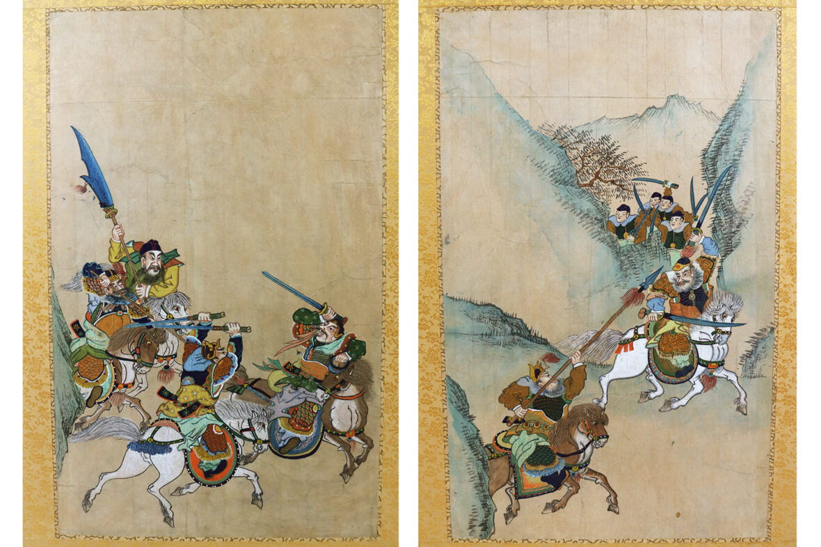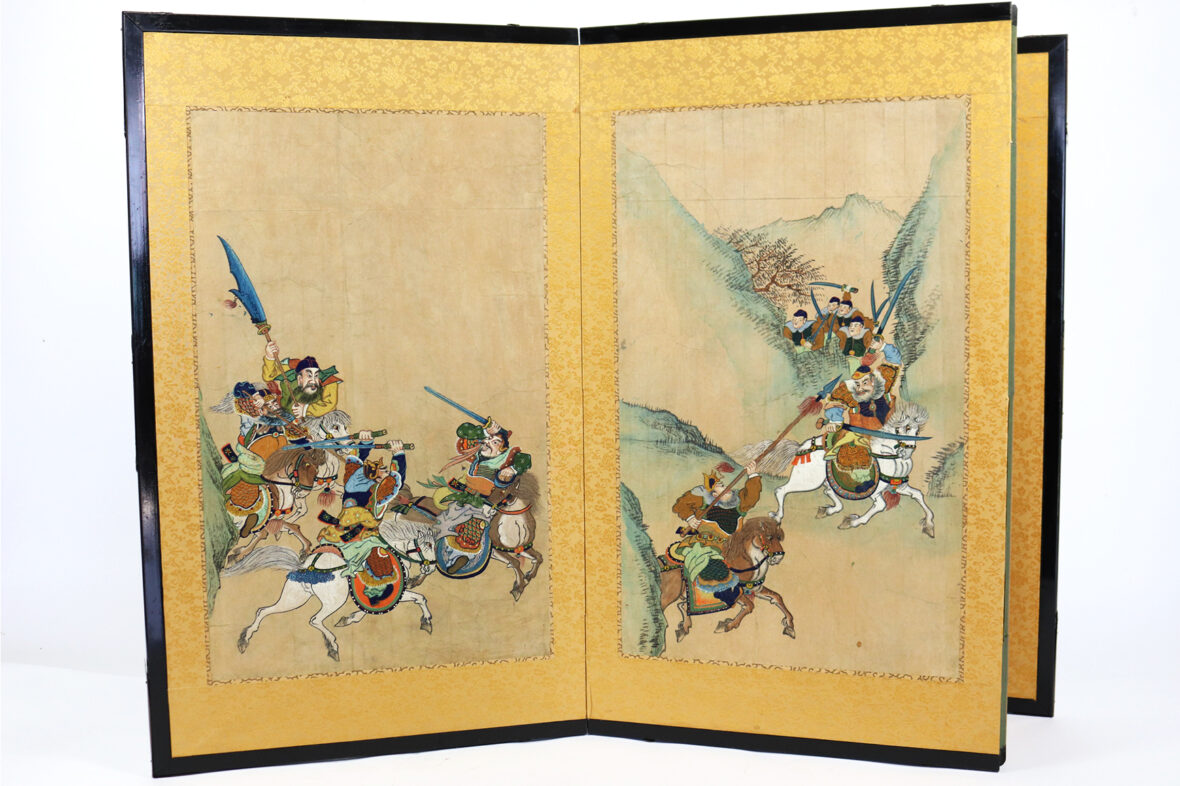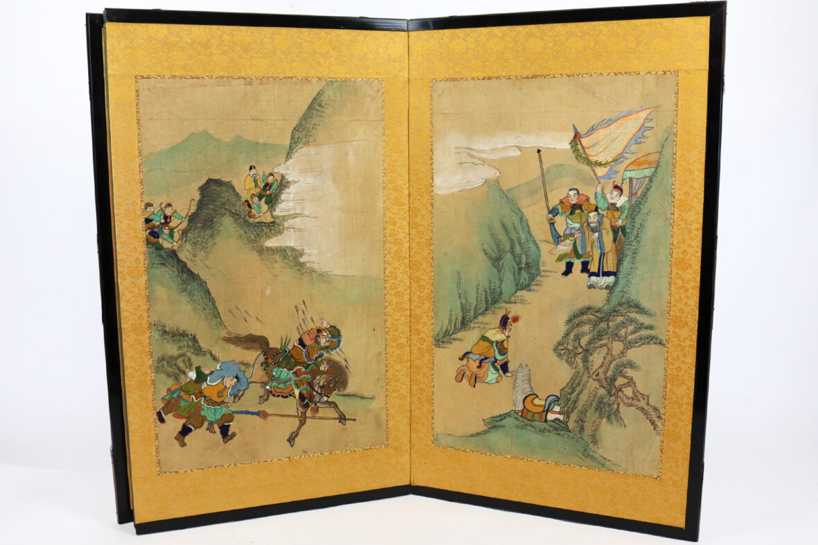 CHINE, XXe Paravent à quatre feuilles à décor de scène de batailles. Chaque feuille…
