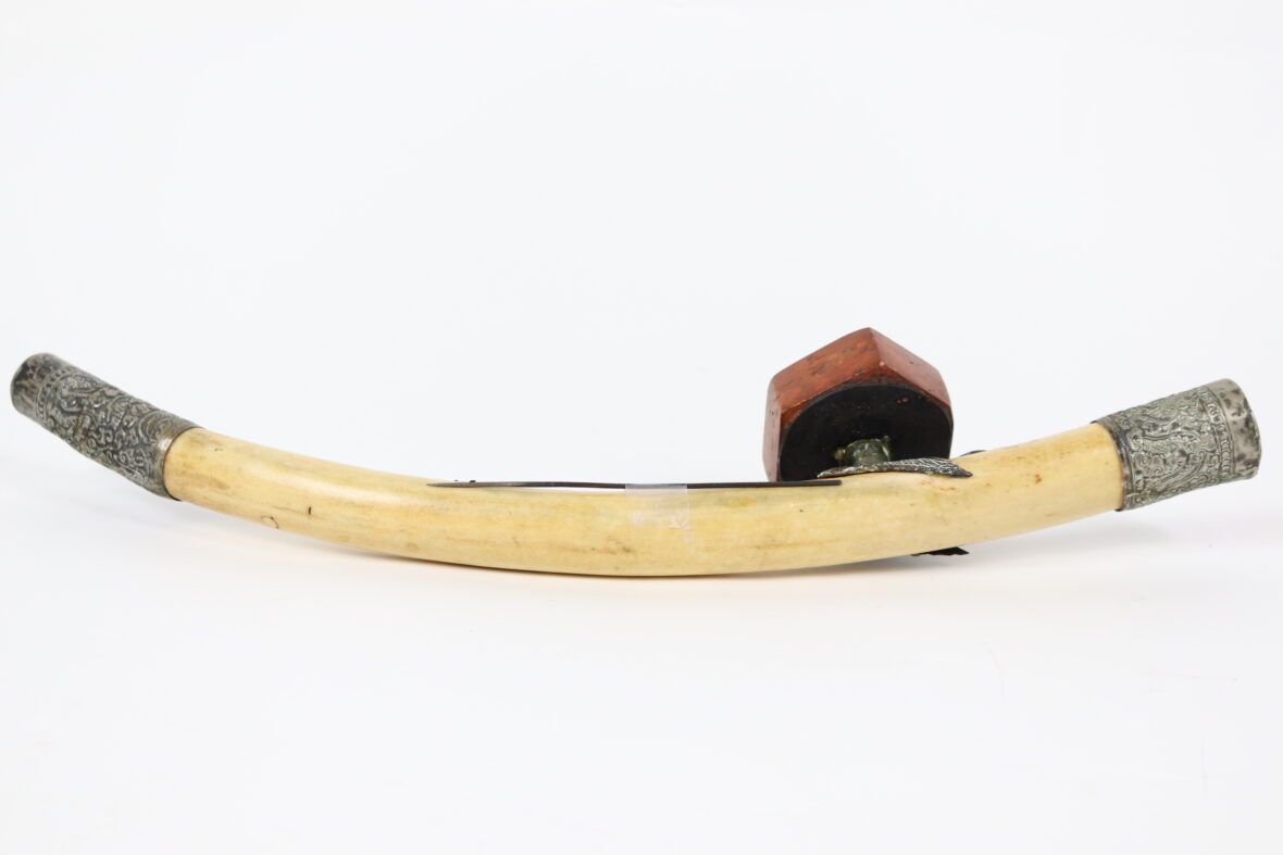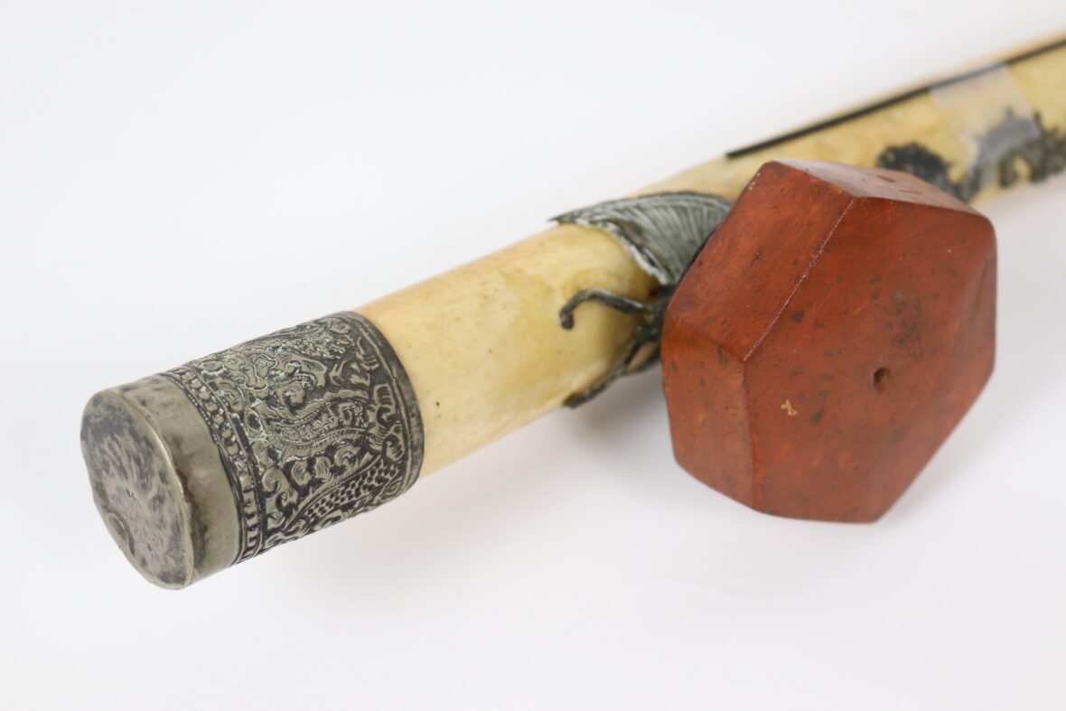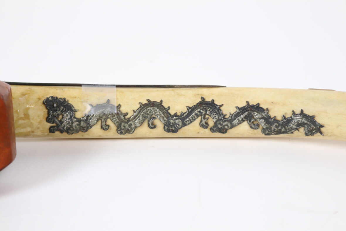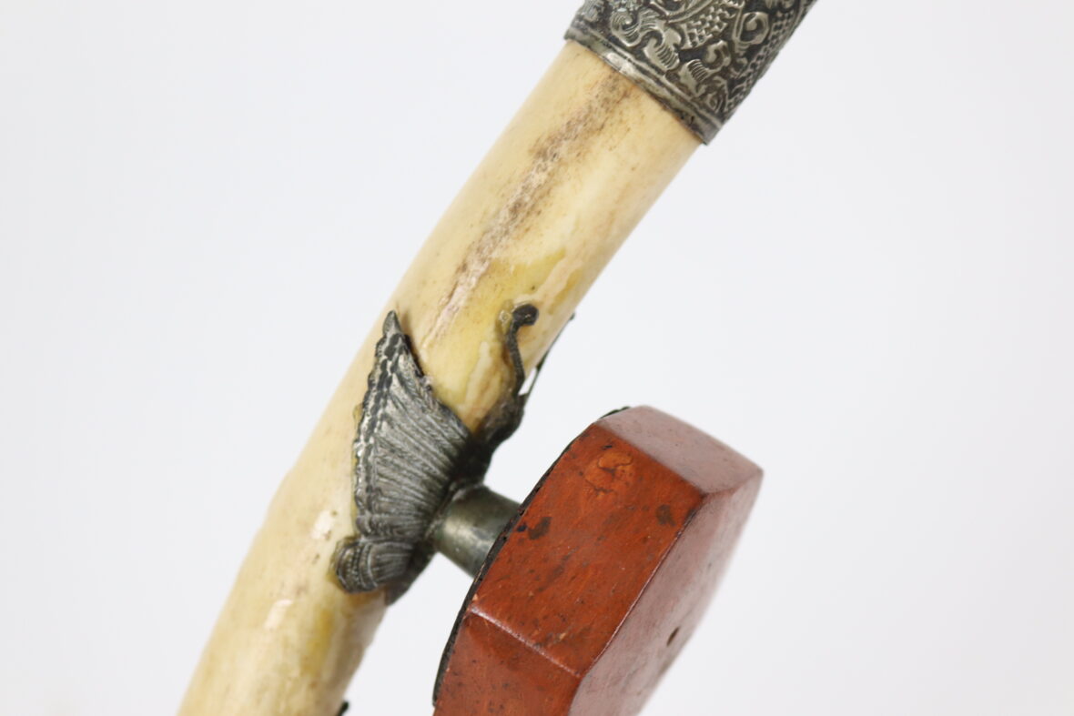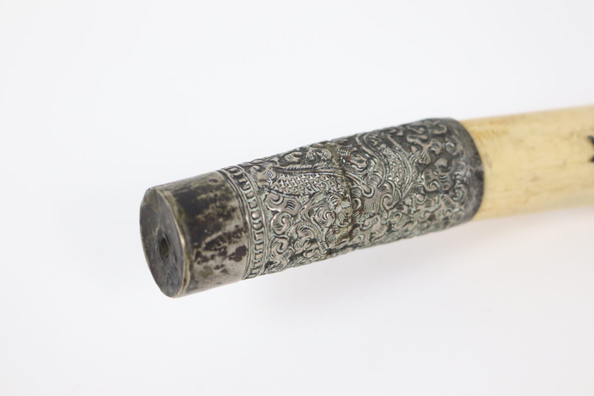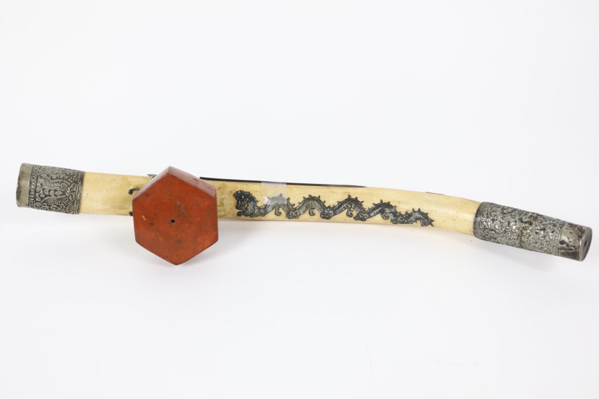 Pipe à opium en os et parement en métal argenté à décor de dragon et papillon.