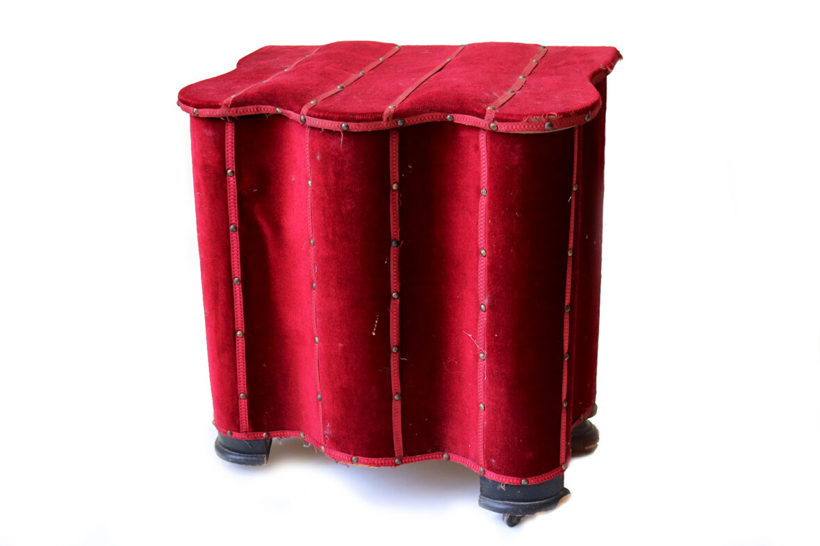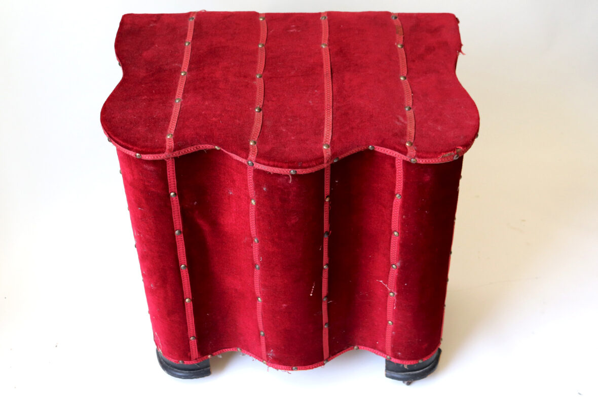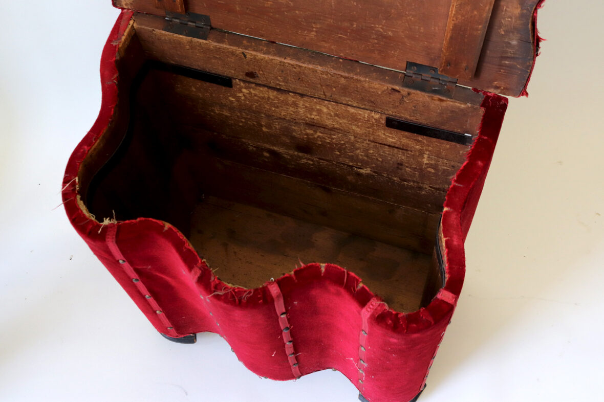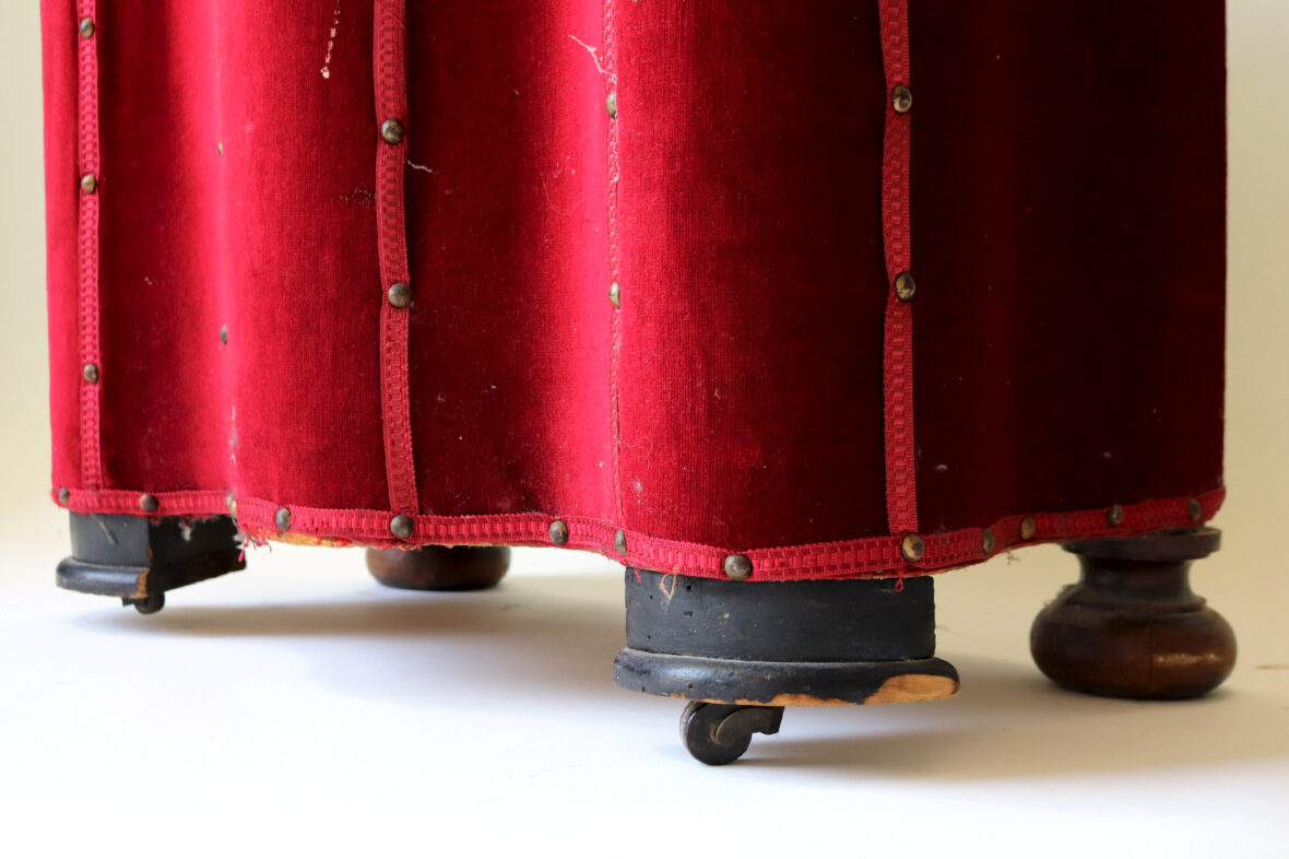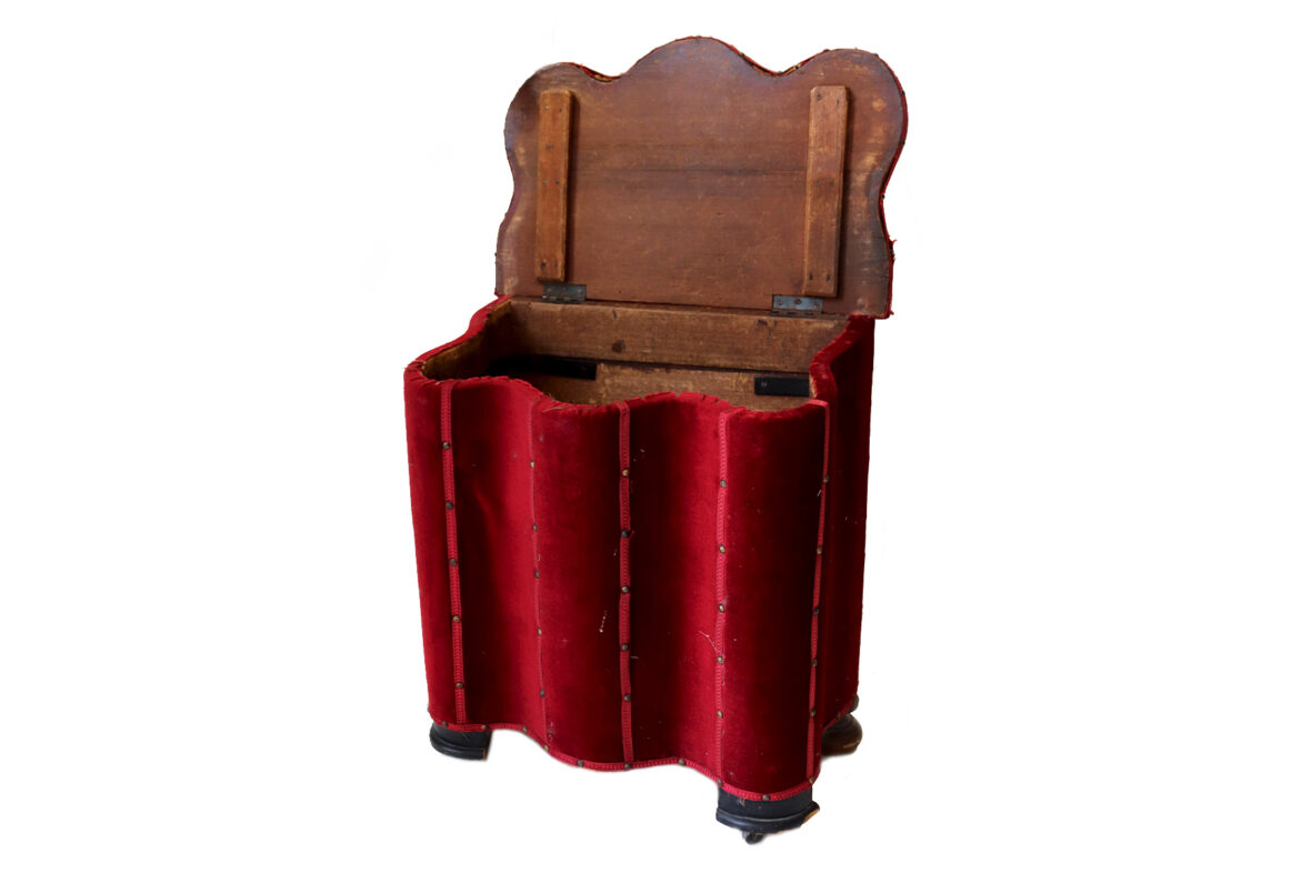 Coffre à bûches galbé sur trois faces en bois naturel gainé de velours rouge reposant sur quatre pieds, dont 2 à roulettes (manque une roulette).