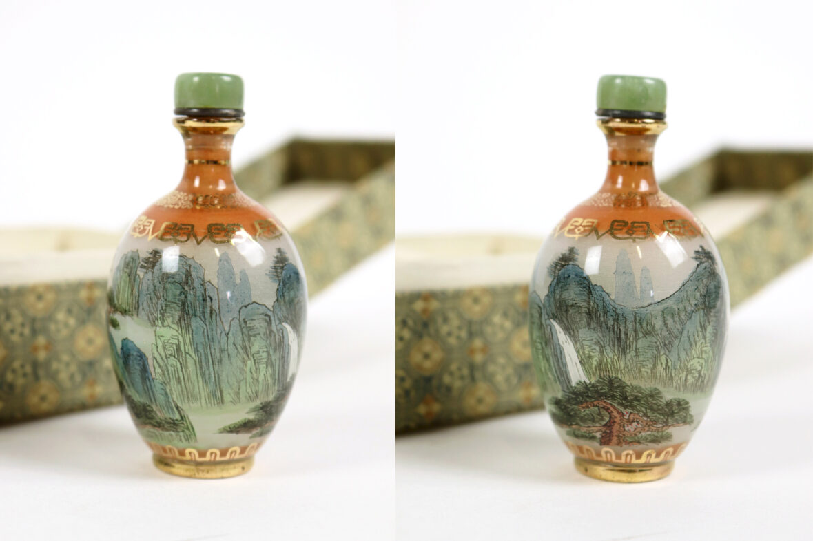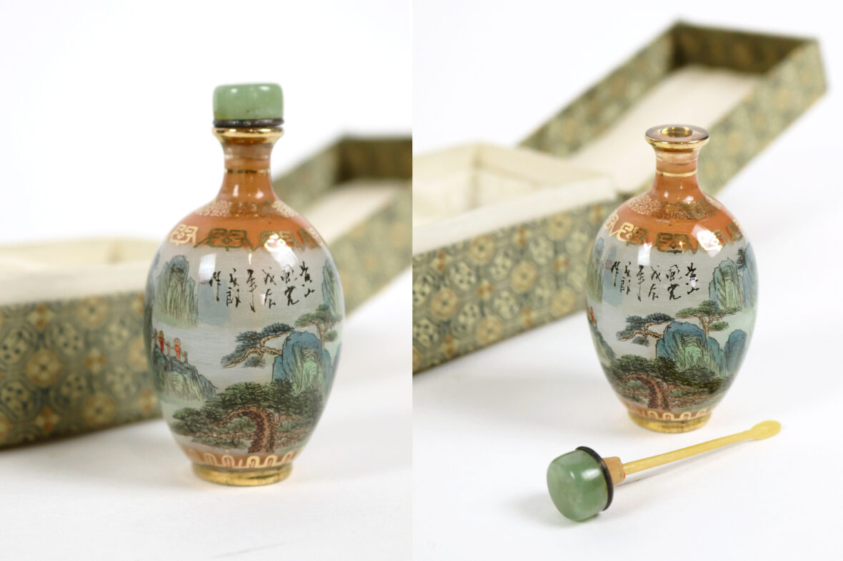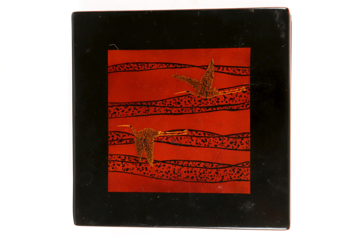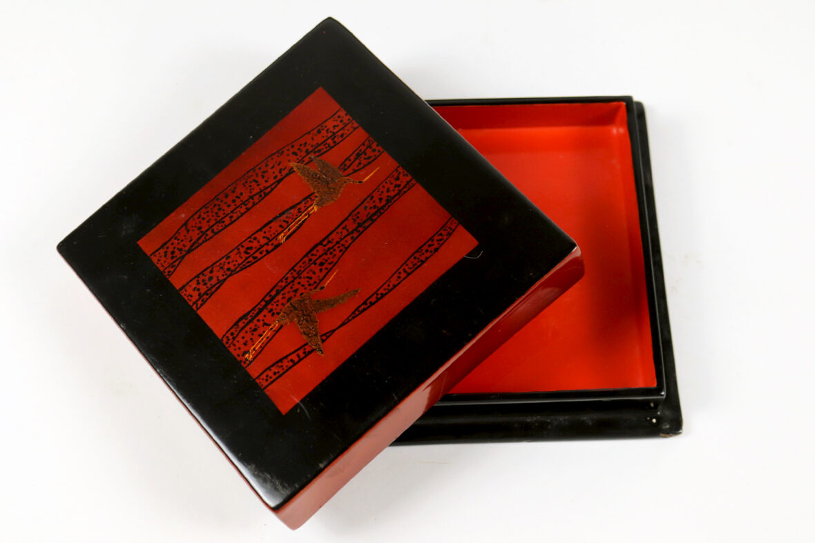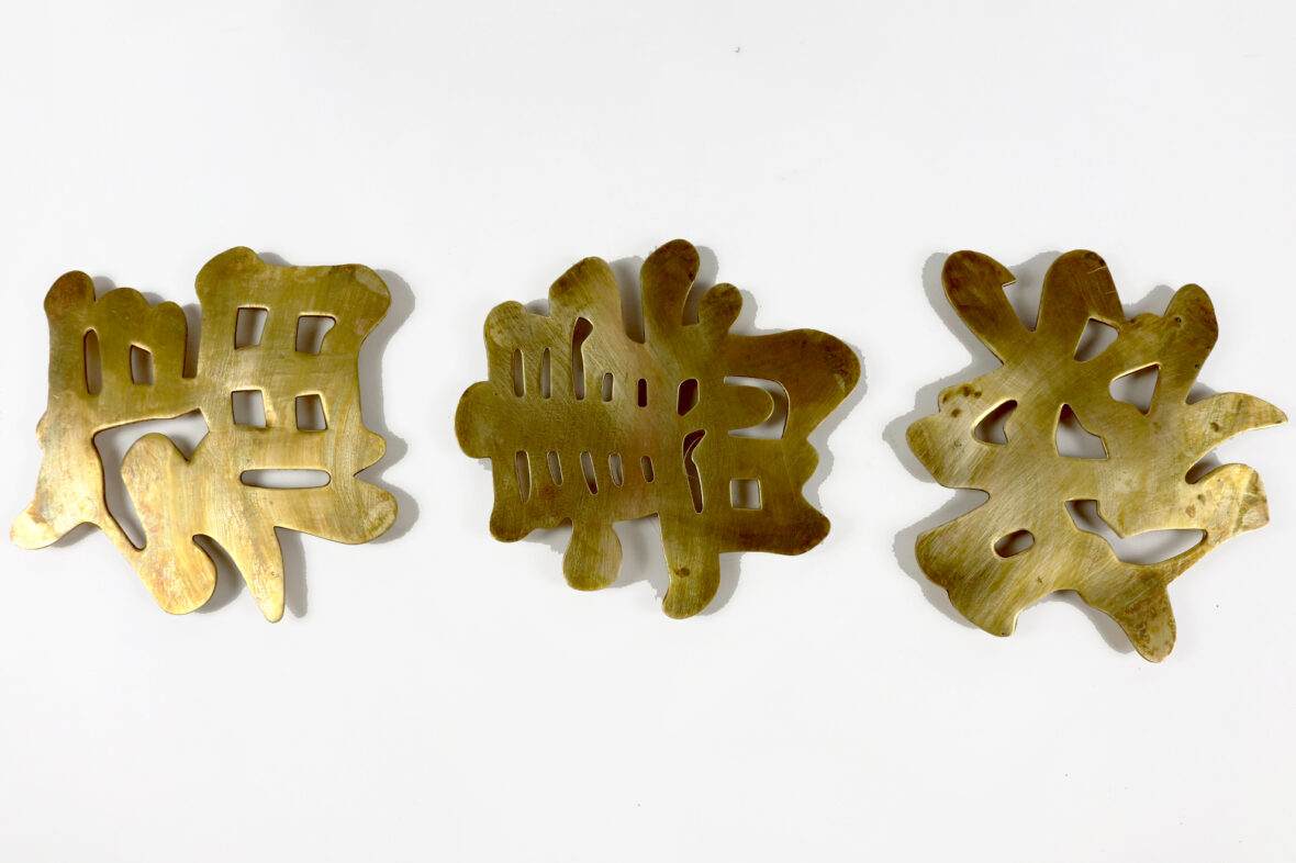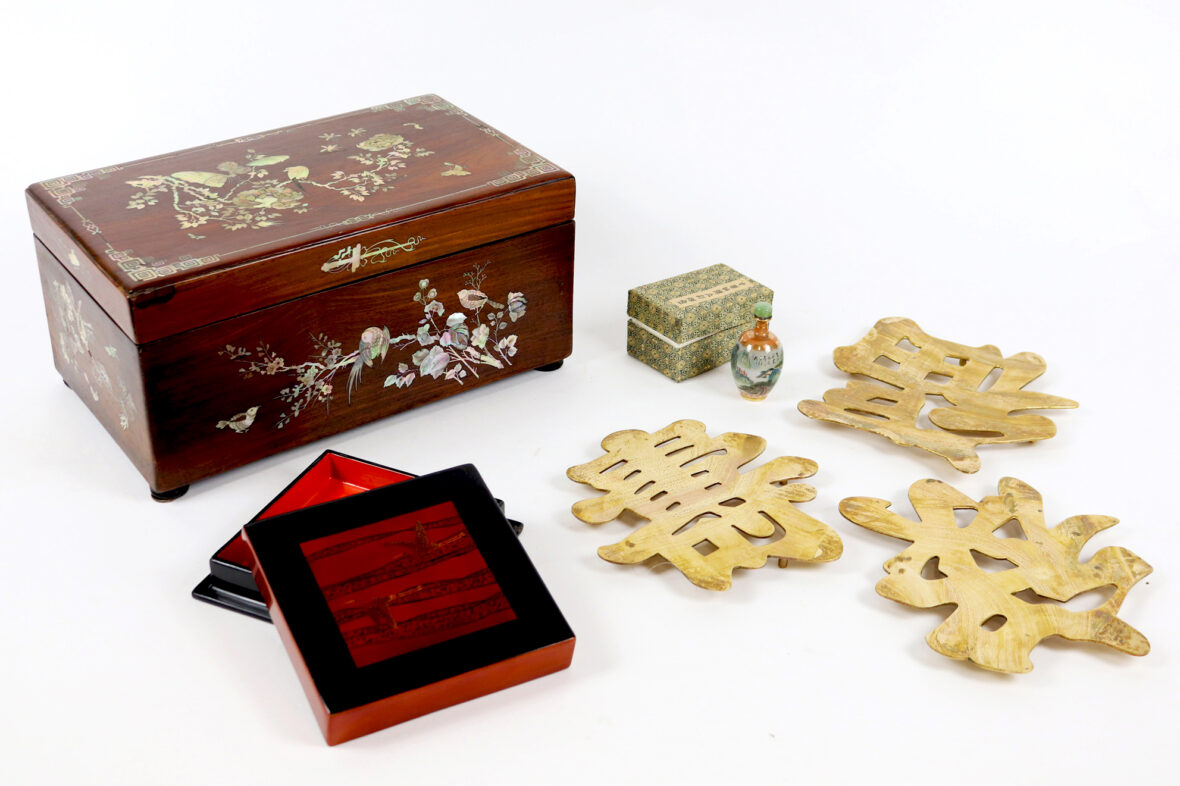 Ony joint un petit flacon en verre peint dans son coffret, une boîte laquée à décor de grues et trois dessous de plat en laiton en forme de calligraphie « Bonne santé, Longue vie, Prospérité.