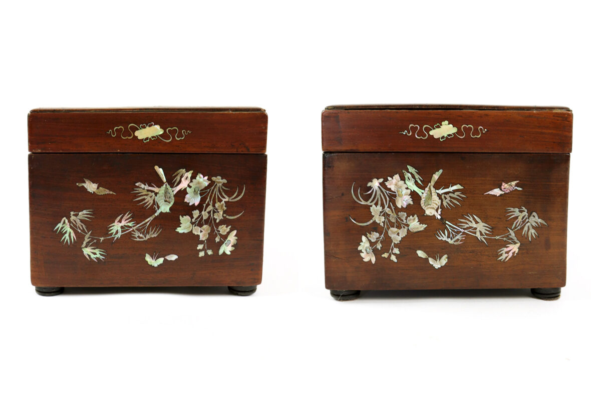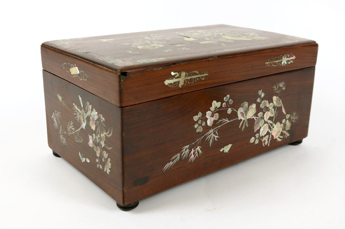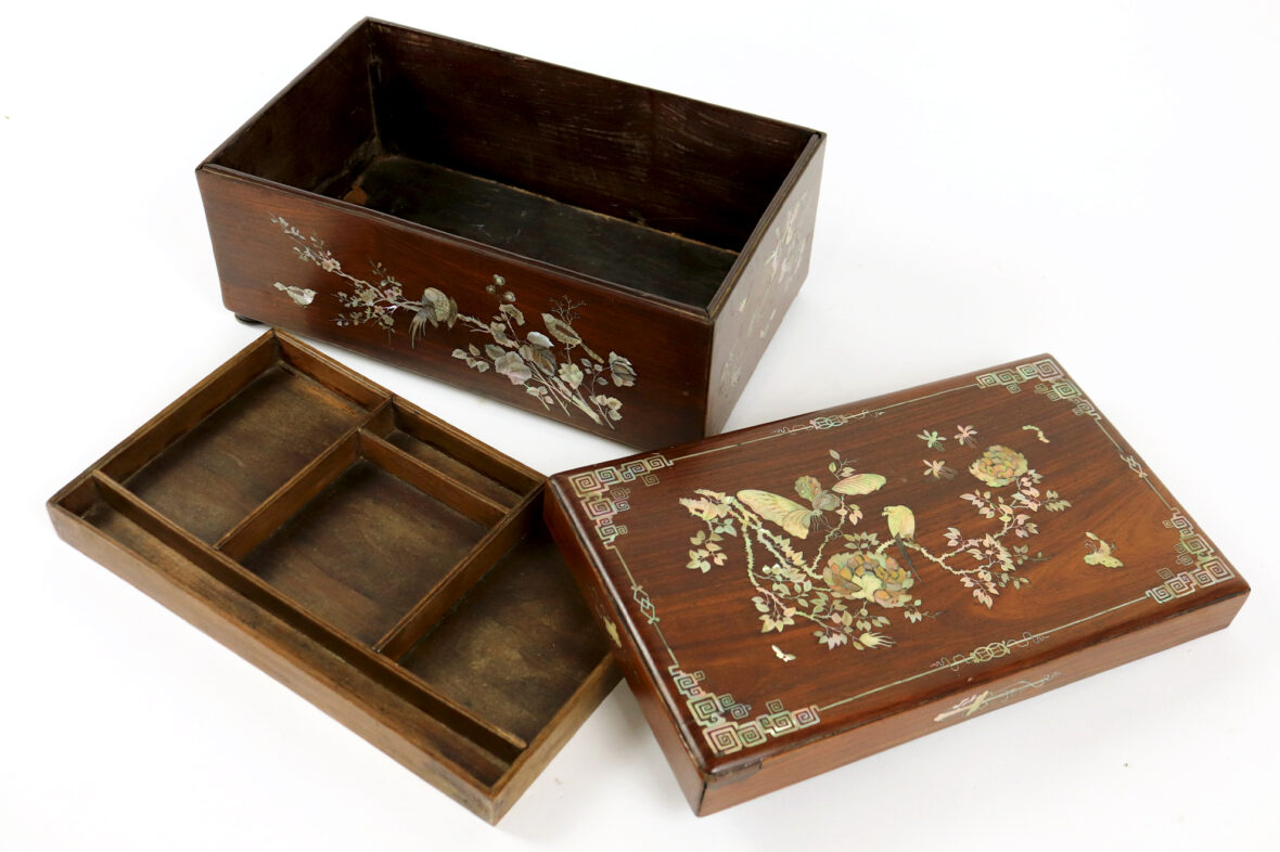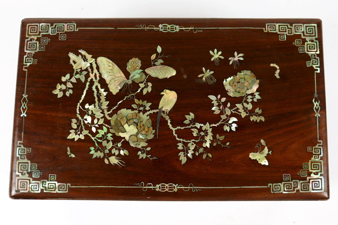 Coffret rectangulaire en bois et bois de placage incrusté de nacre à décor de papillons et oiseaux branchés.
