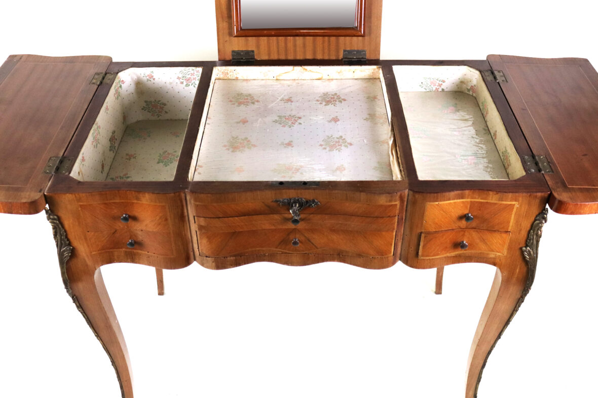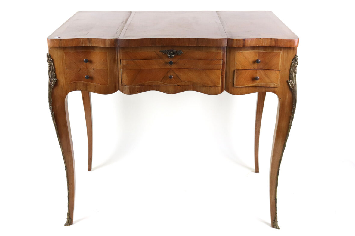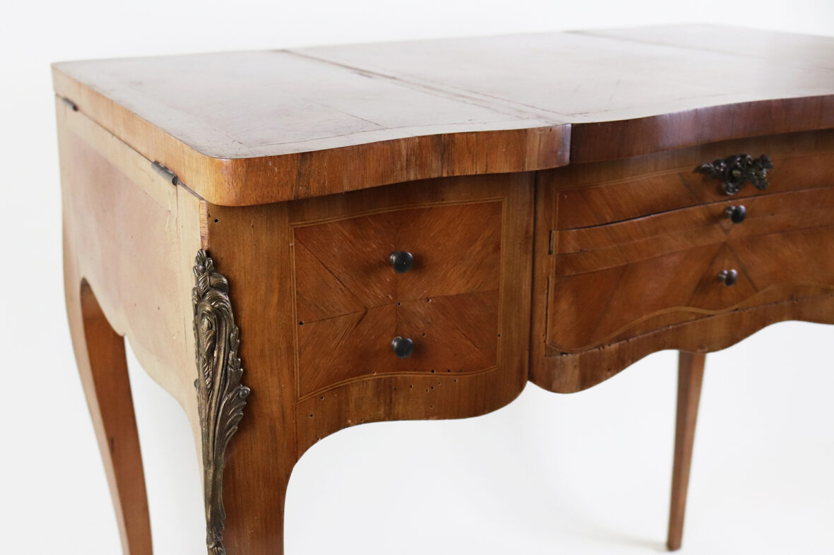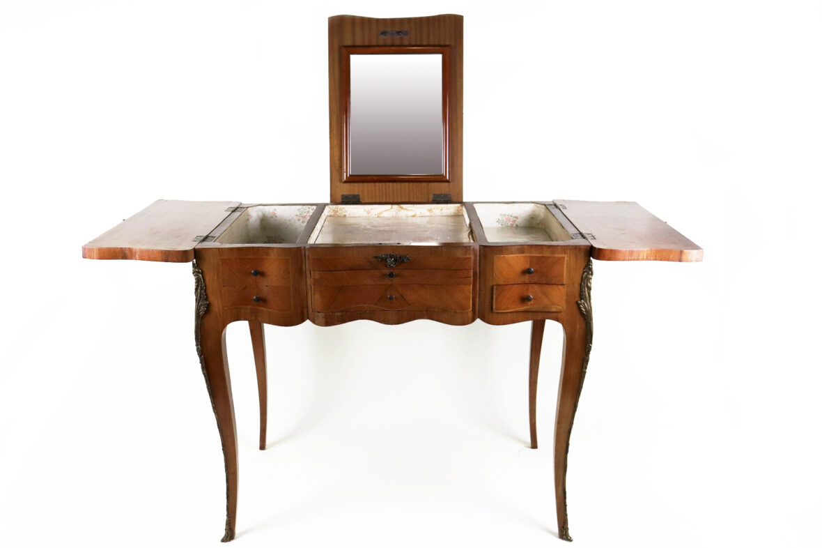 Coiffeuse en bois naturel et bois de placage, ouvrant par deux tiroirs en ceinture. De style Louis XV.