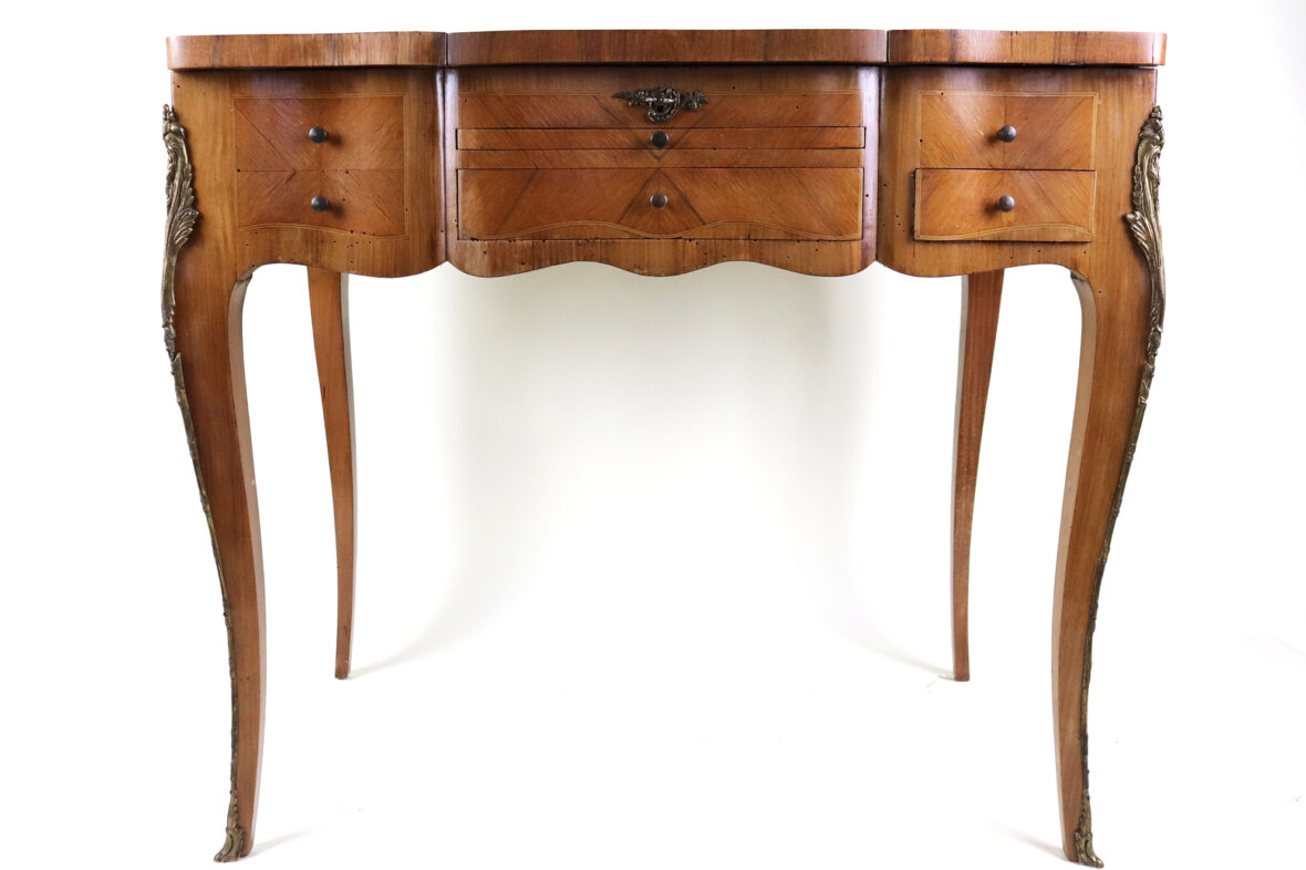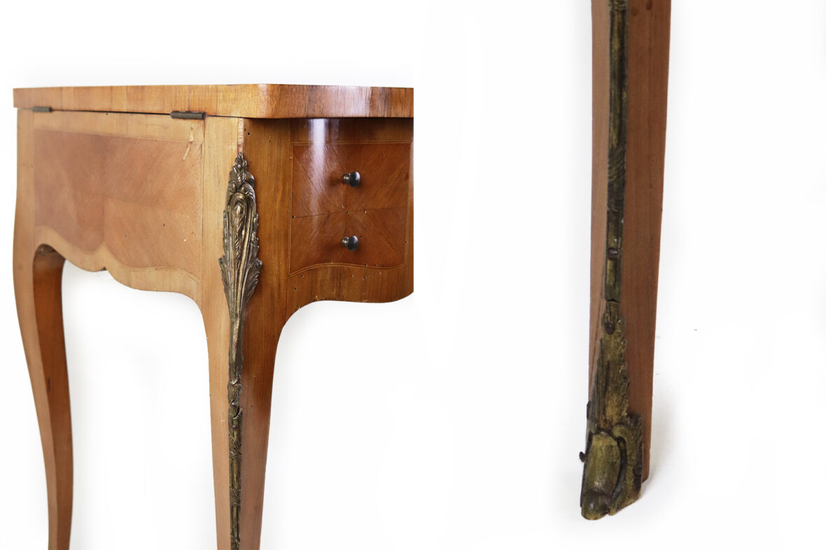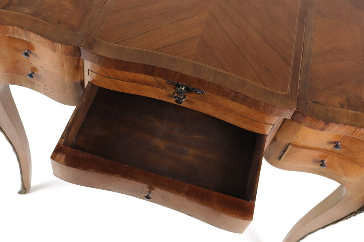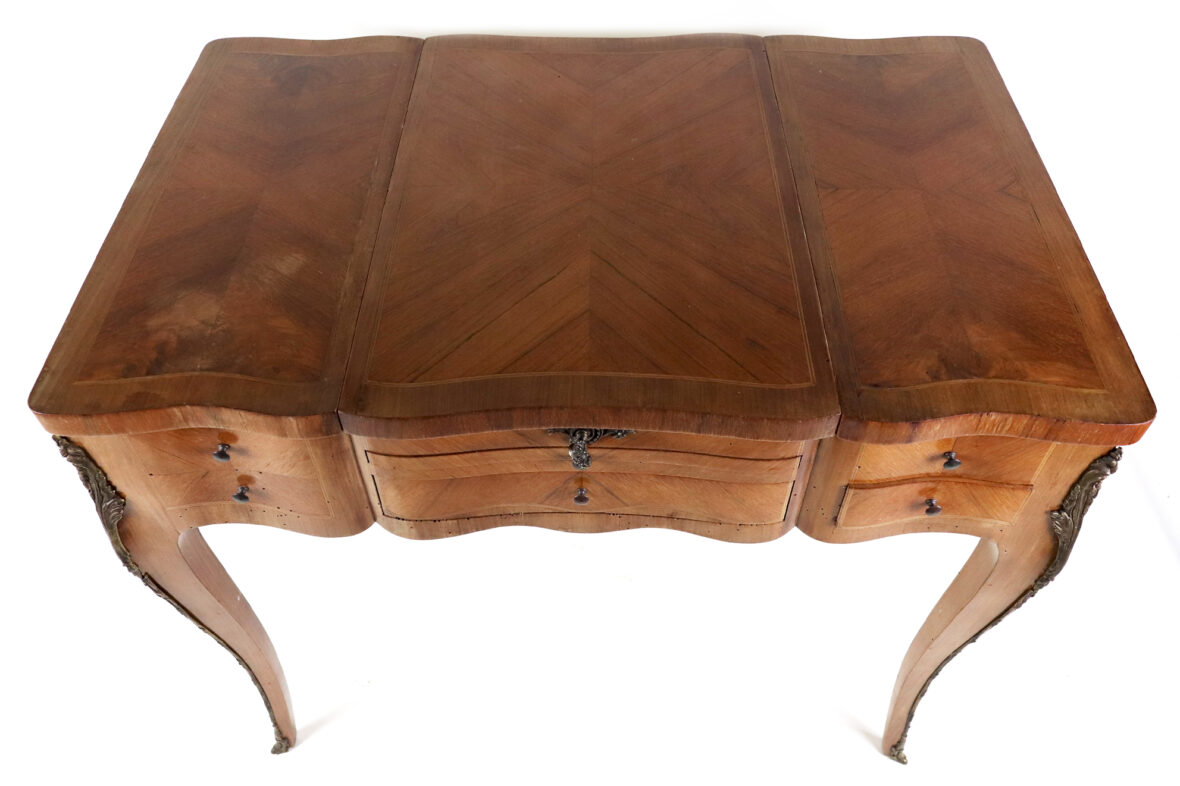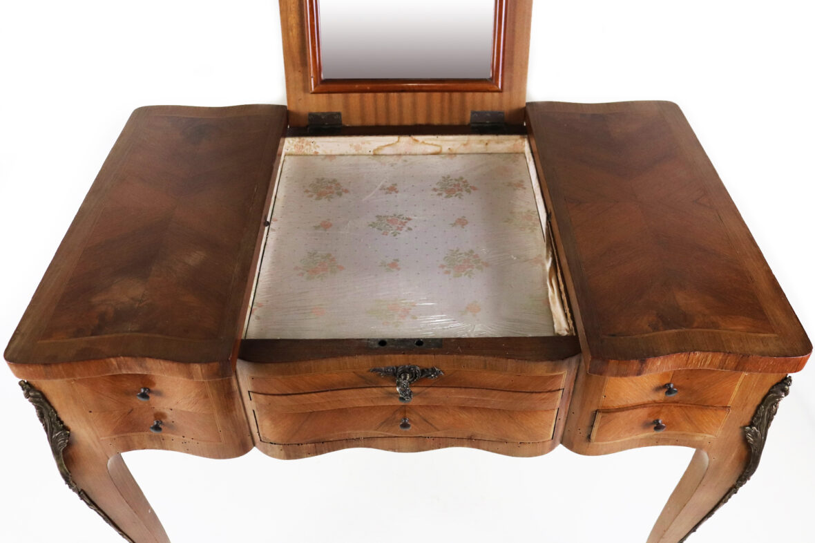 Coiffeuse en bois naturel et bois de placage, ouvrant par deux tiroirs en ceinture. De style Louis XV.