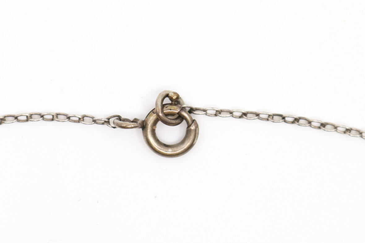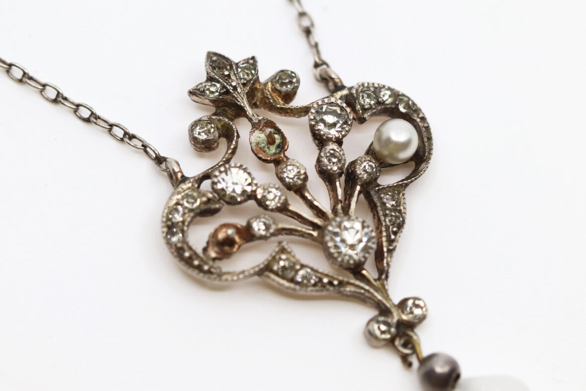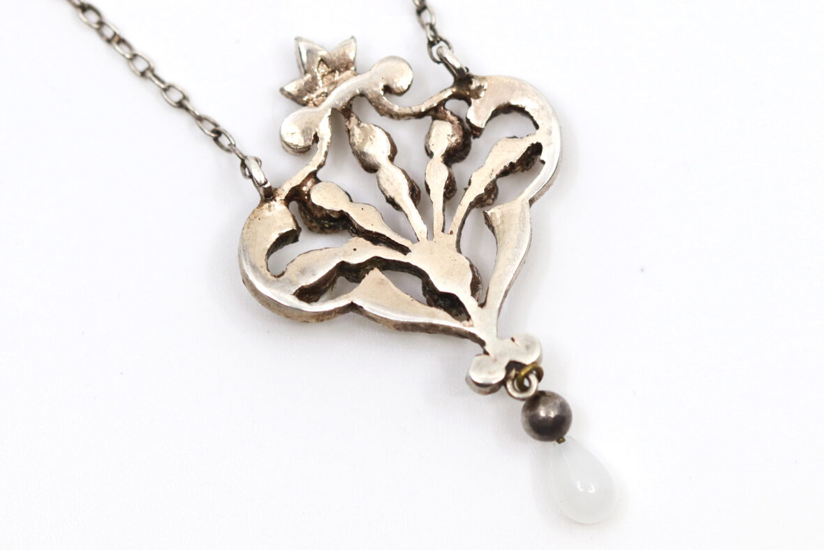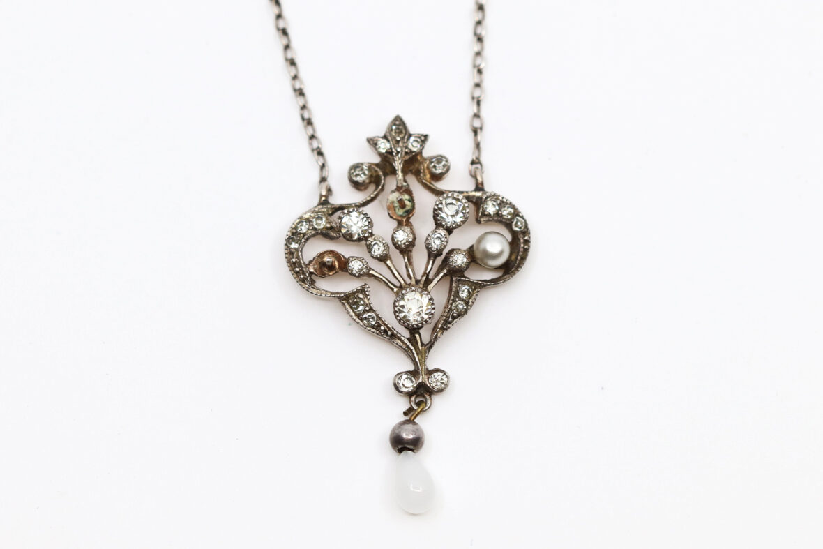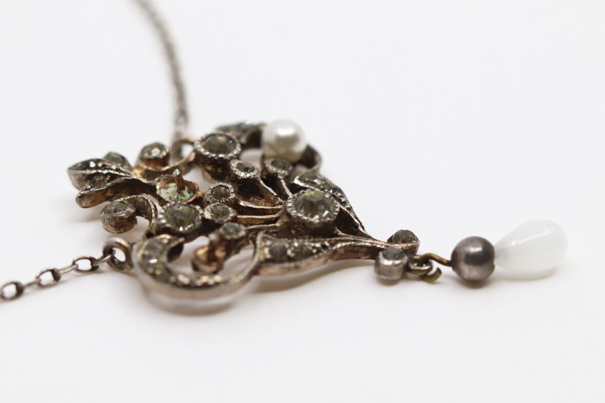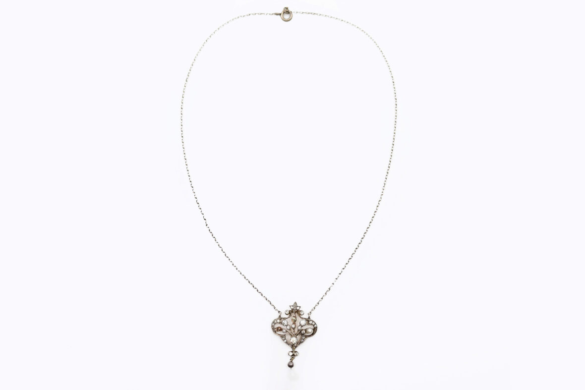 Collier en argent formé d’une chaîne retenant un pendentif à décor ajouré de rinceaux ornés de petites pierres blanches taillées (manques) et d’un motif de goutte en chute.