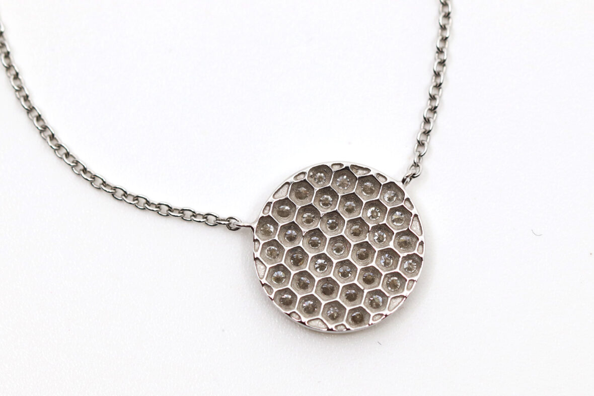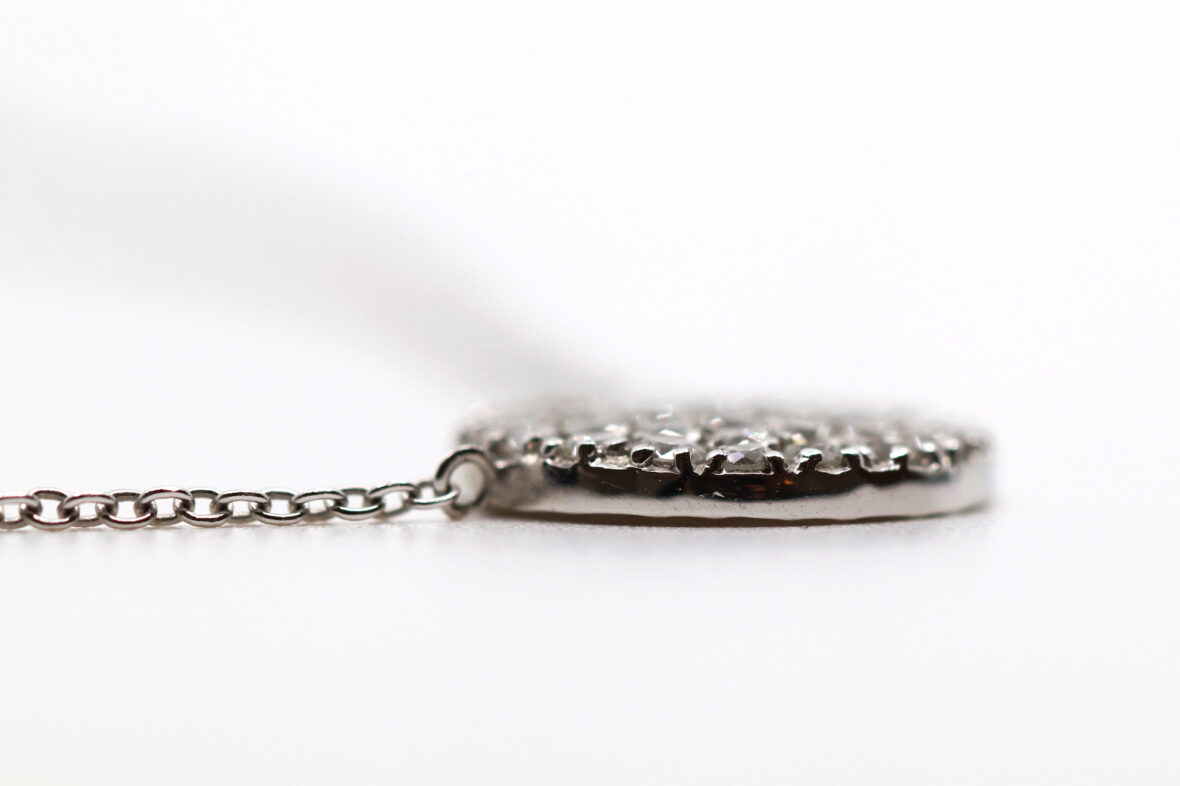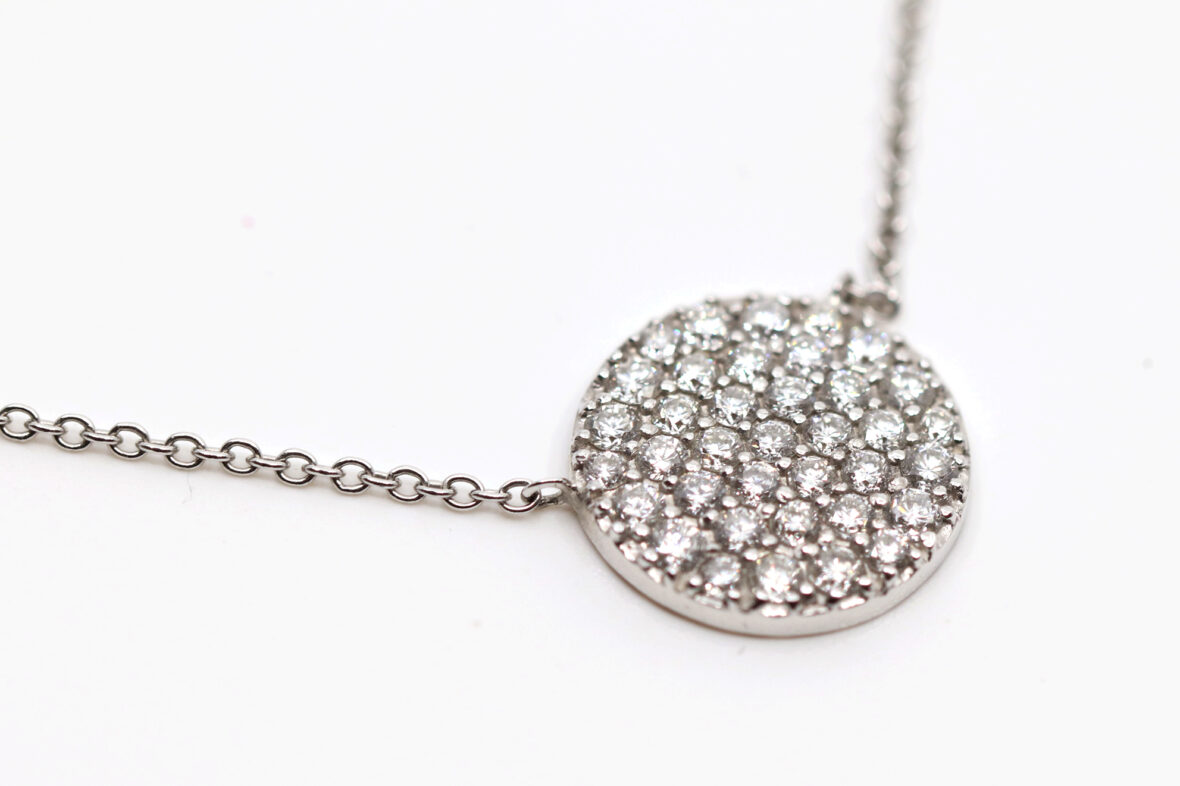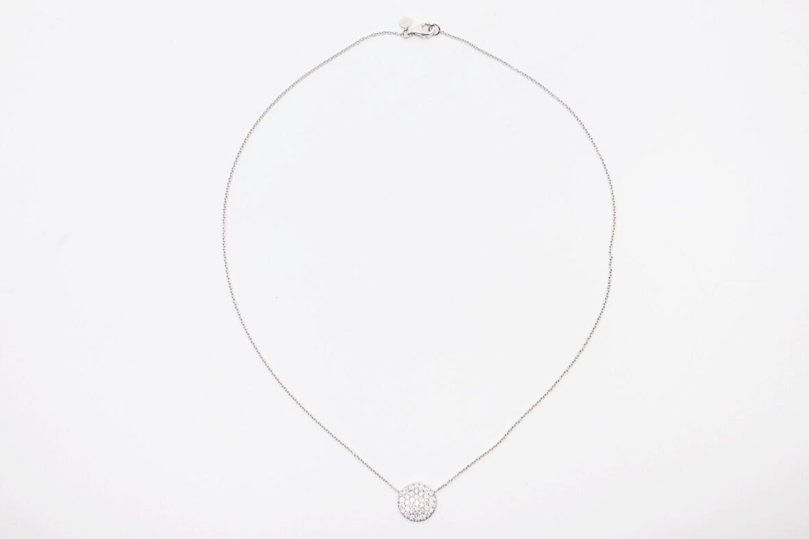 Collier en or gris orné d’un disque pavé de petits brillants.