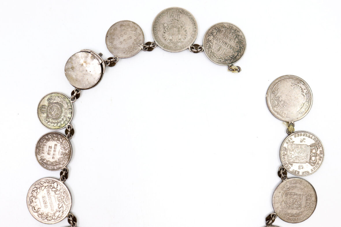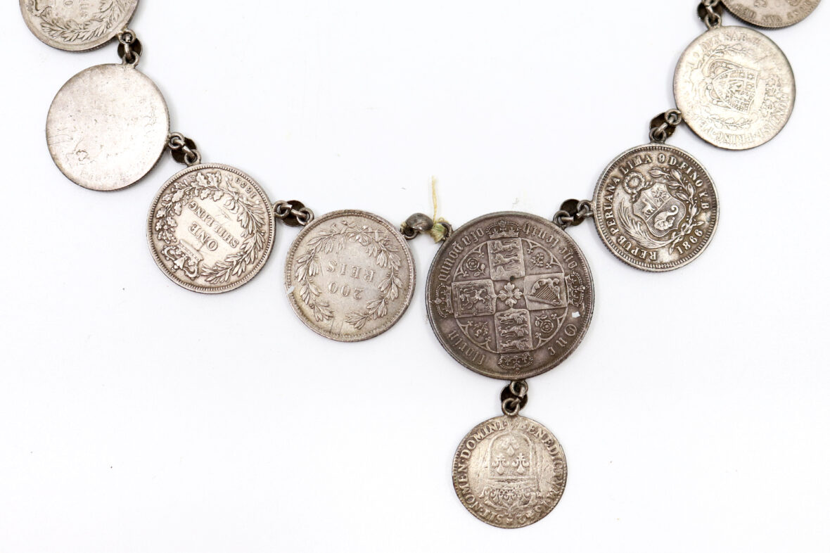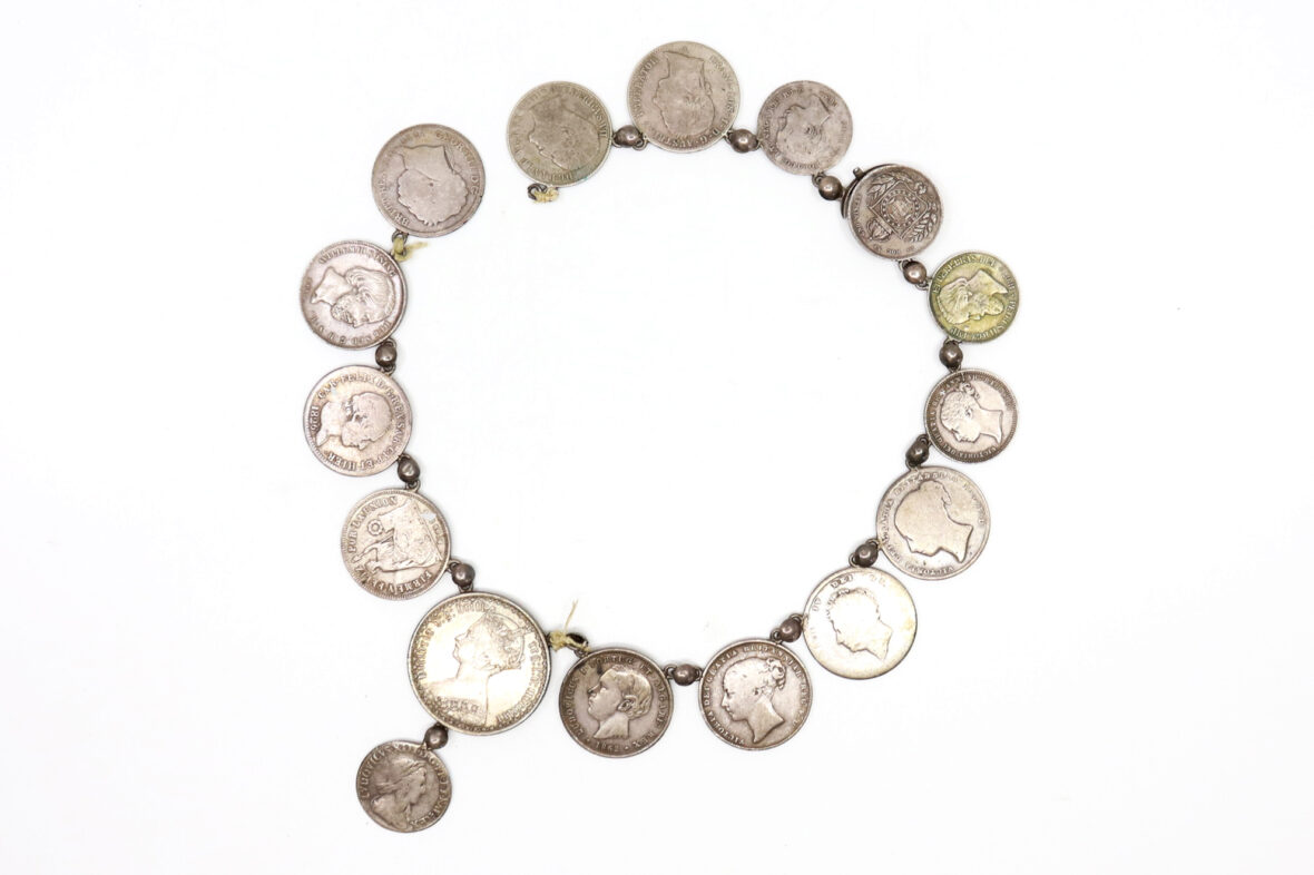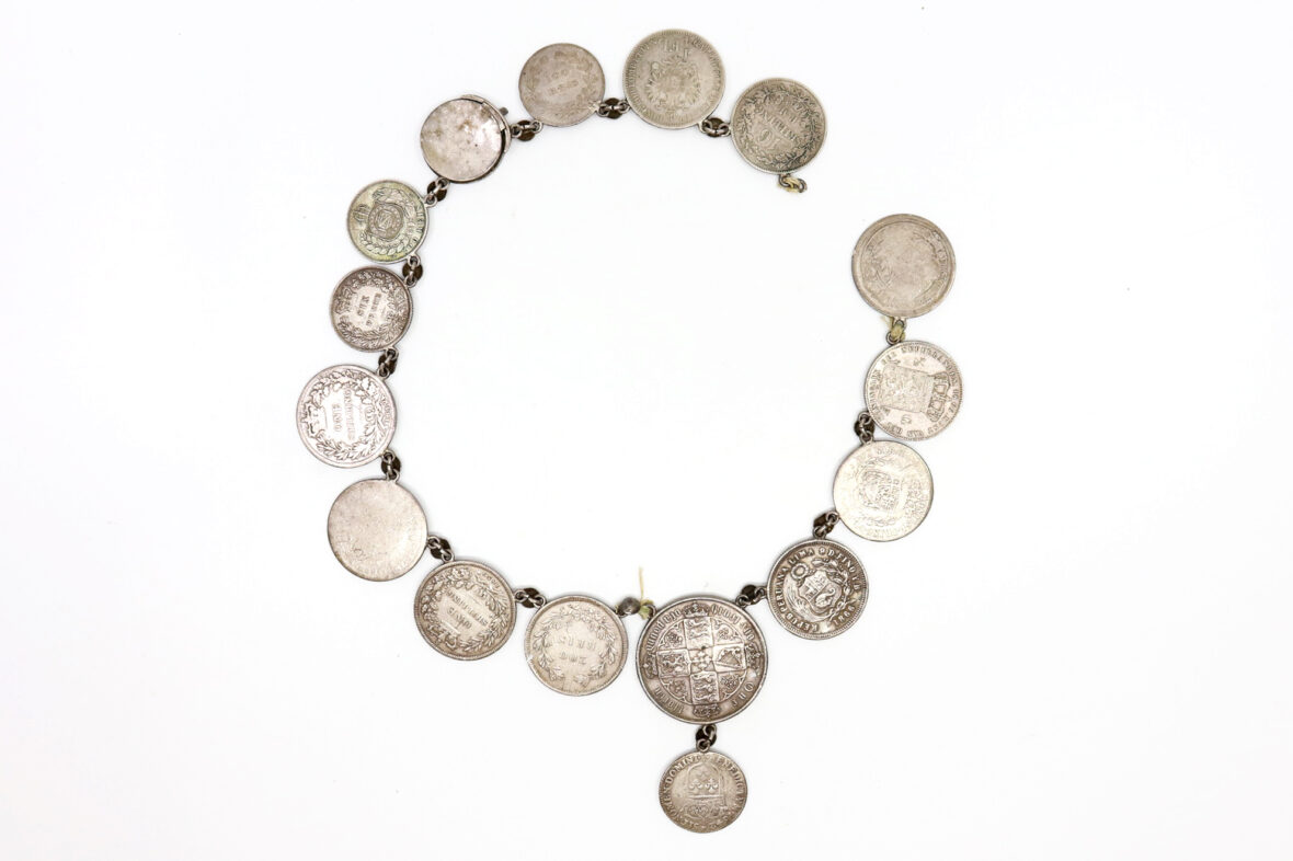 Collier réalisé avec des monnaies en argent diverses, Angleterre, Espagne, Autriche,…