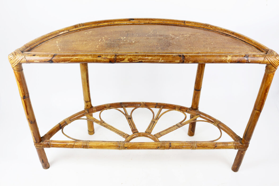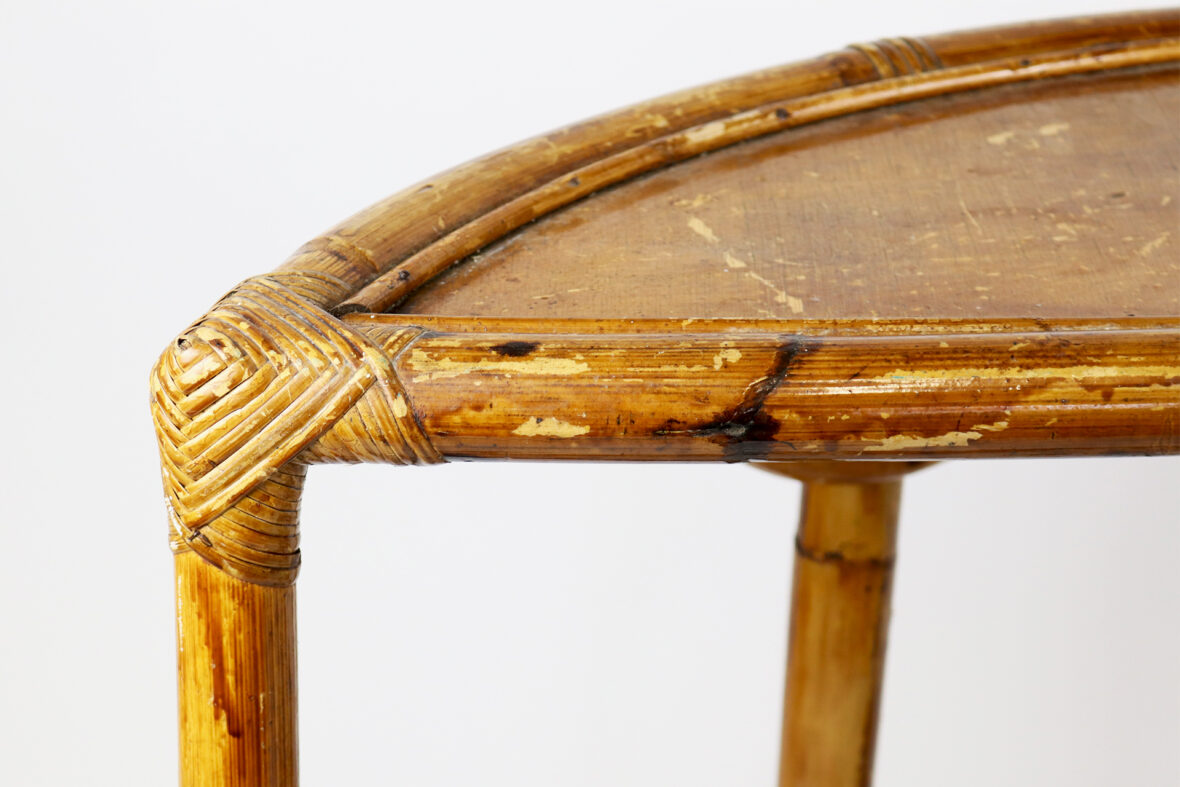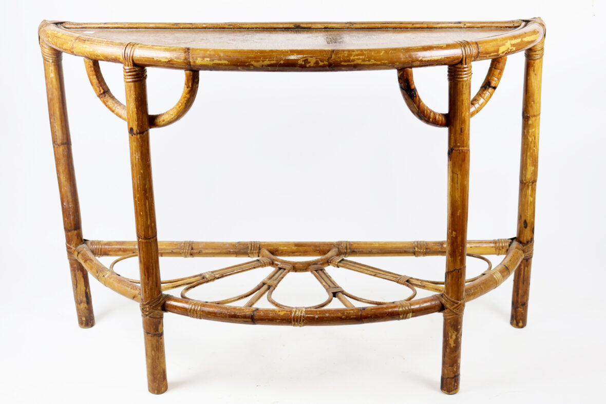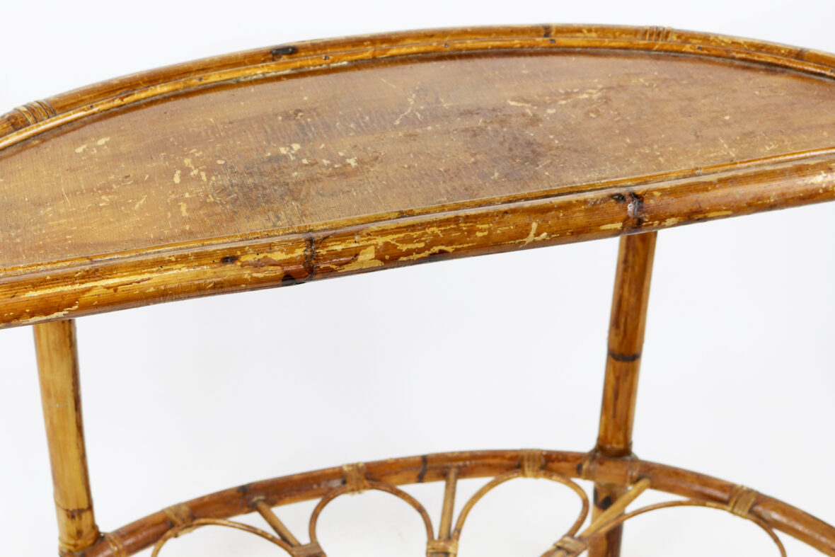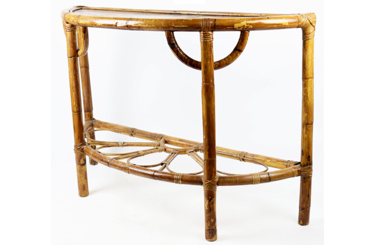 Console demi-lune en rotin, le plateau inférieur à décor ajouré.