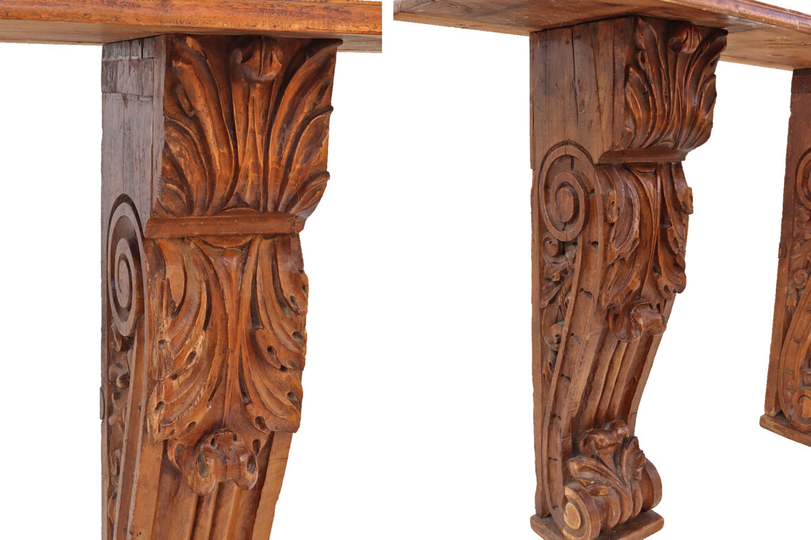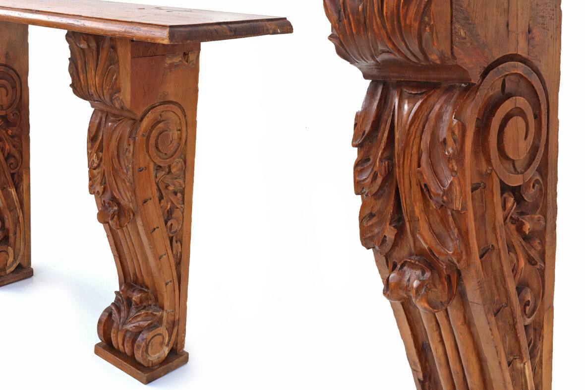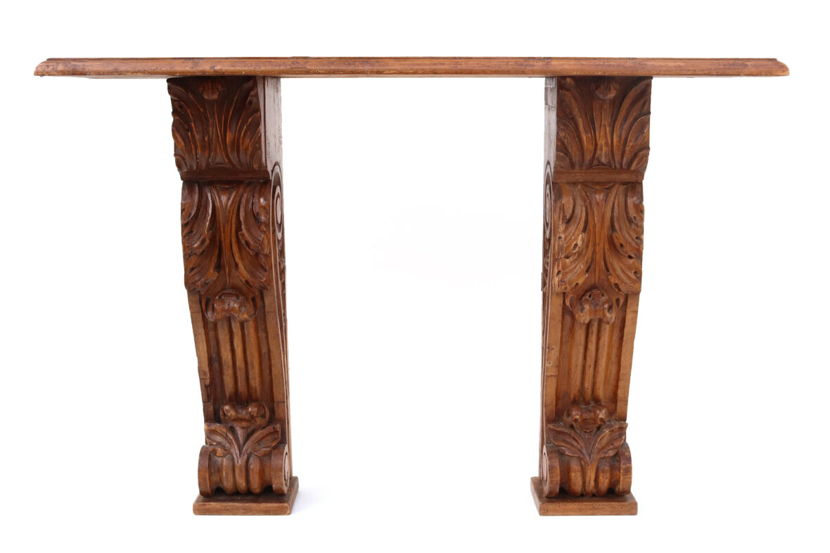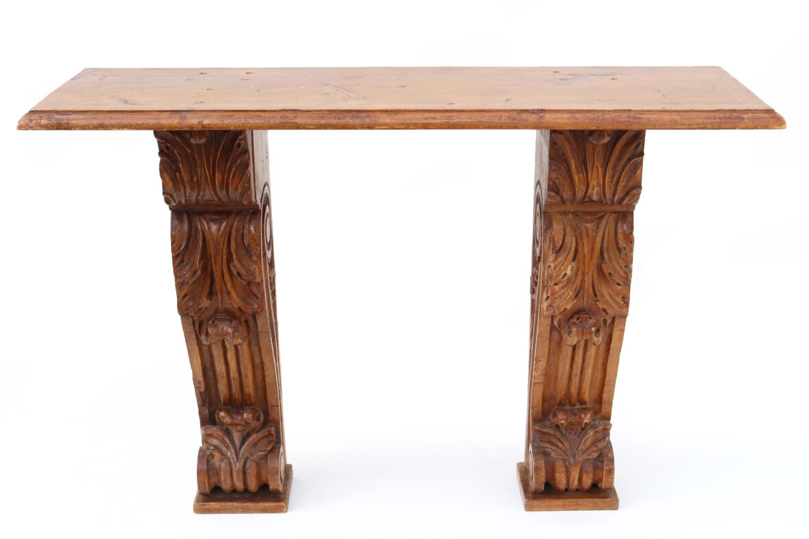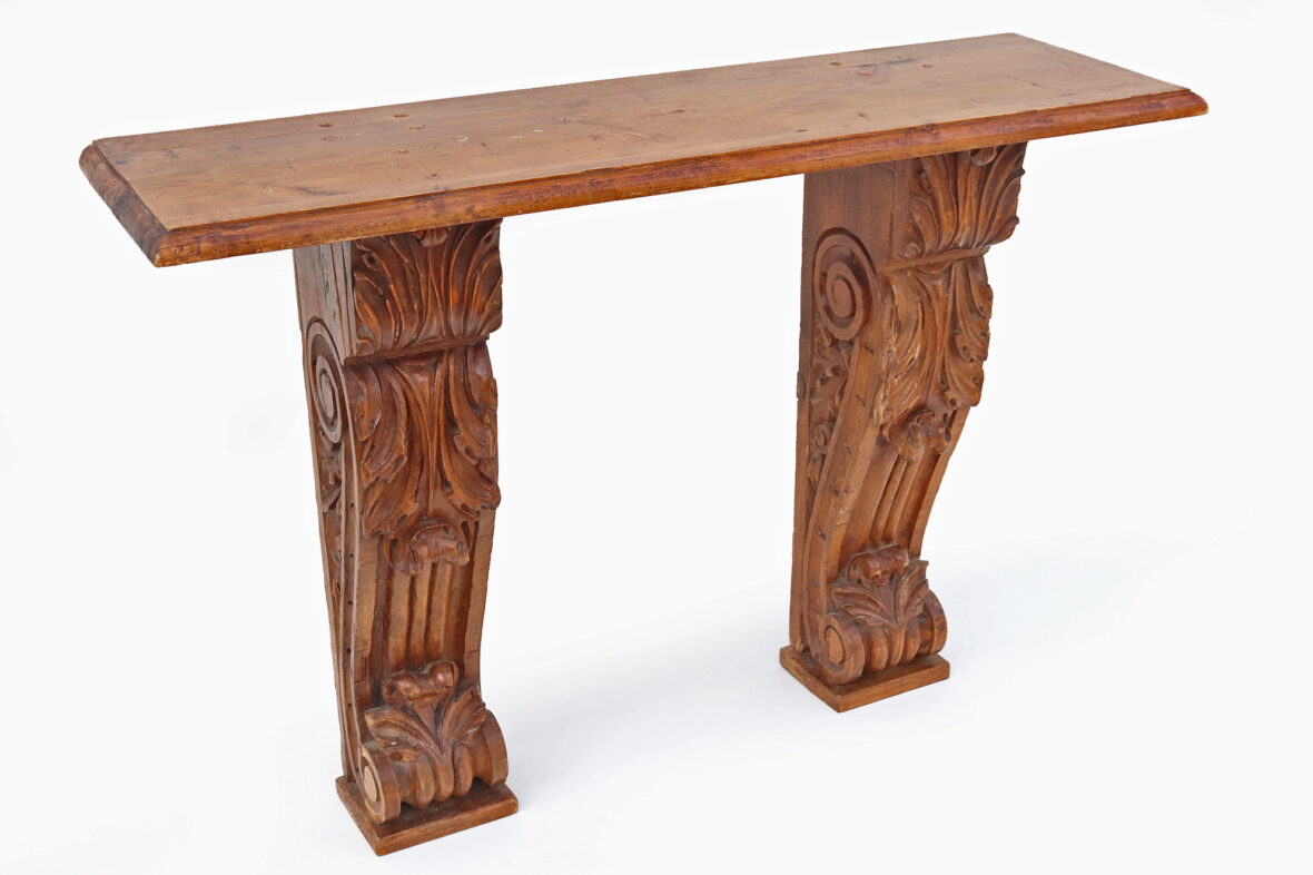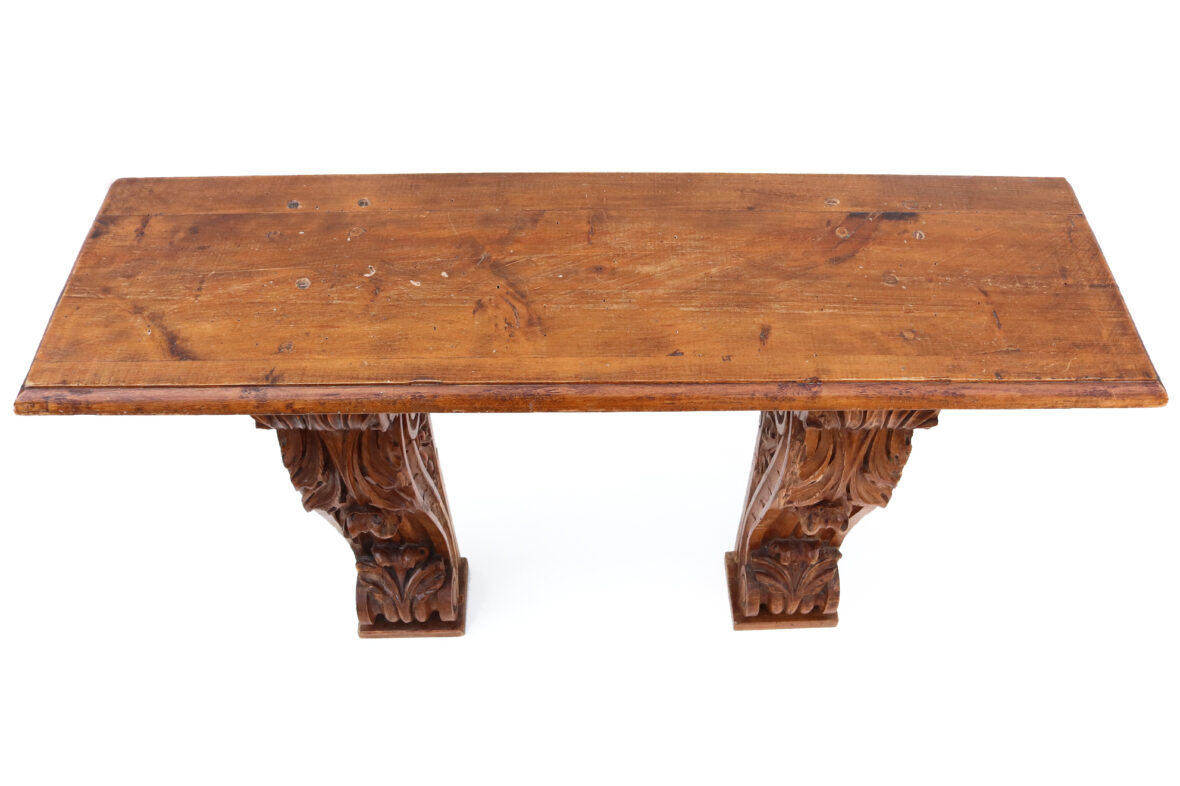 Console formée d’un plateau de bois naturel reposant sur deux pieds en console (éléments anciens).