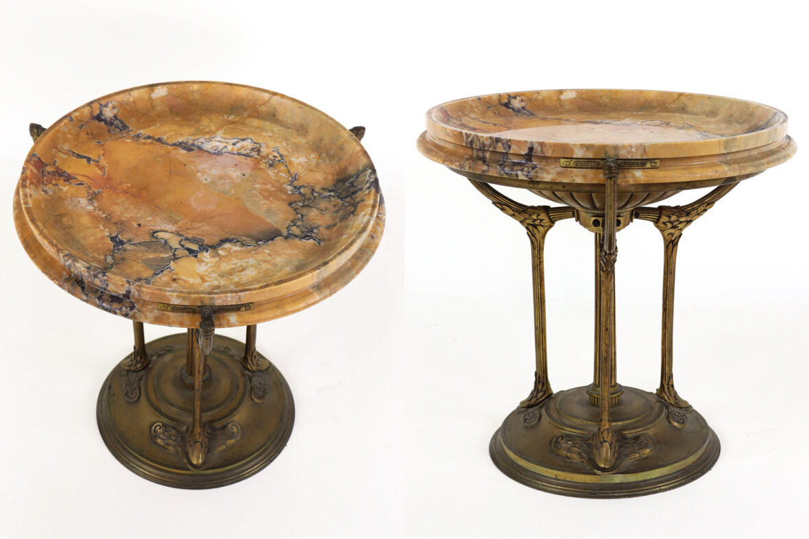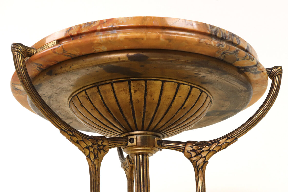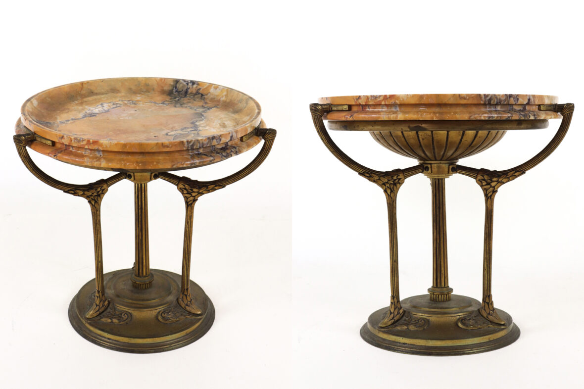 Coupe en marbre et bronze doré, le piètement à décor sculpté de cannelures et feuillage stylisé. Signée Behrmann sur la terrasse.