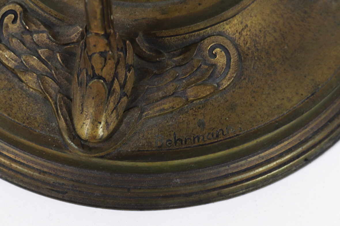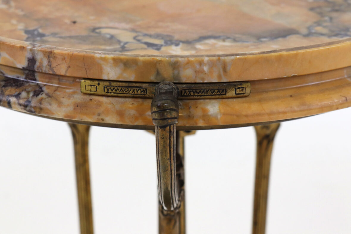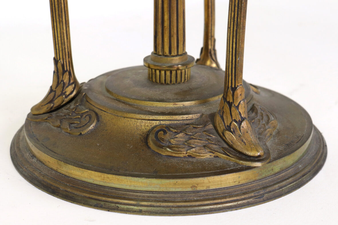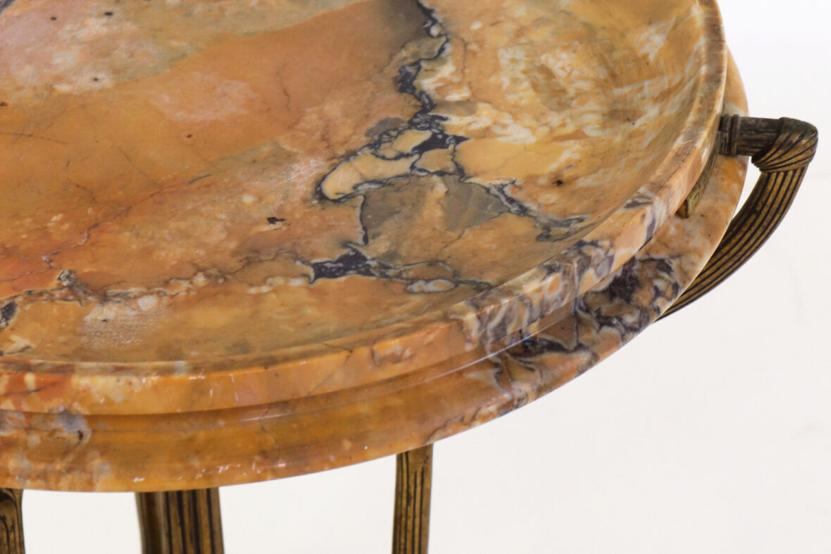 Coupe en marbre et bronze doré, le piètement à décor sculpté de cannelures et feuillage stylisé. Signée Behrmann sur la terrasse.