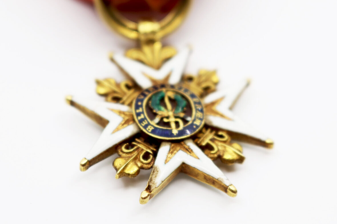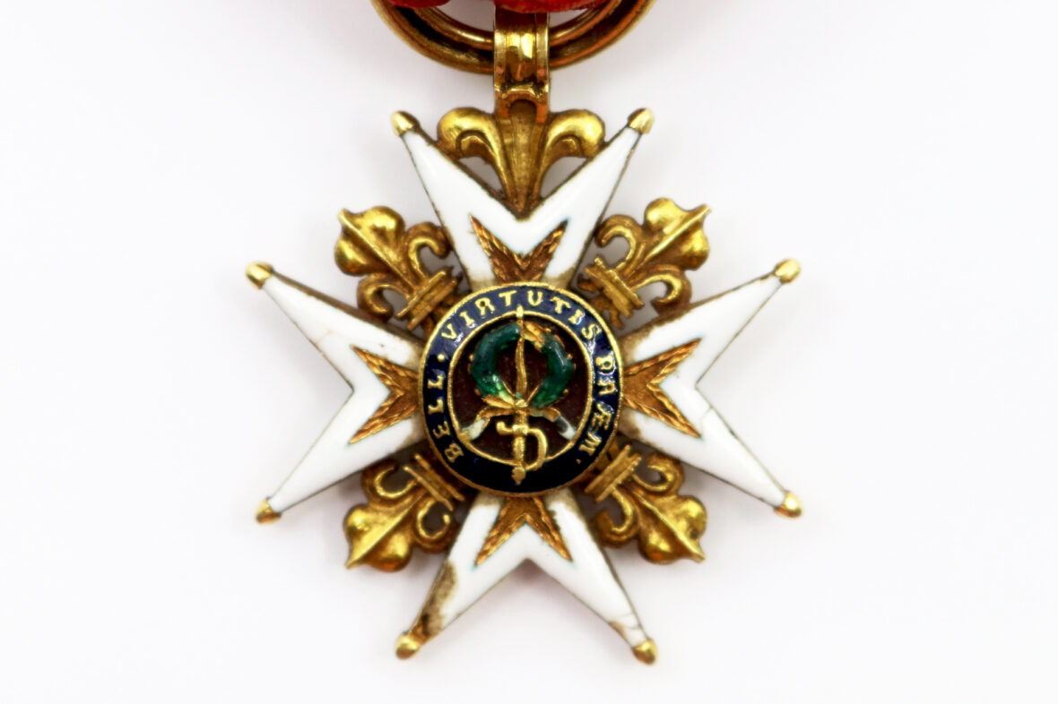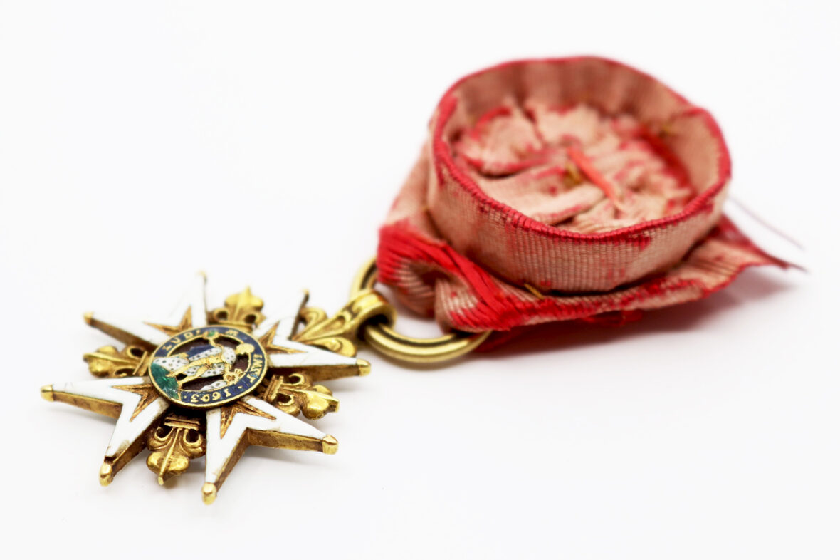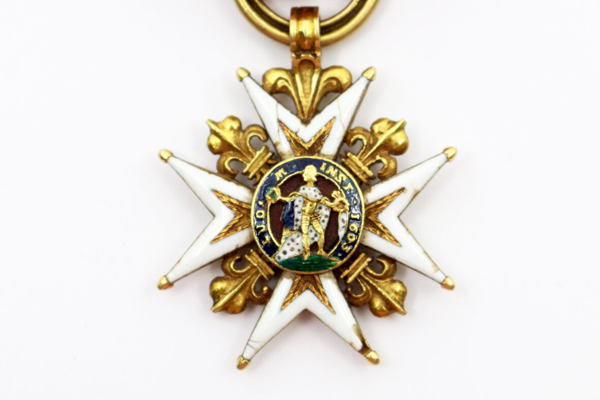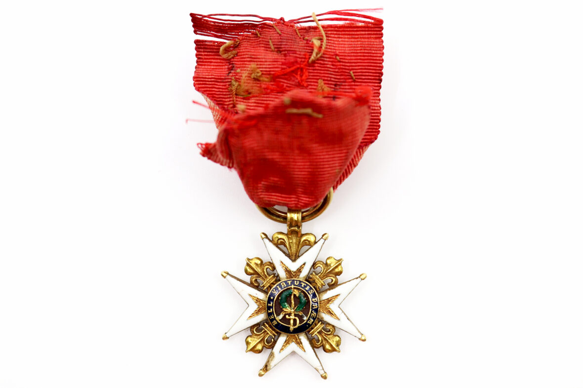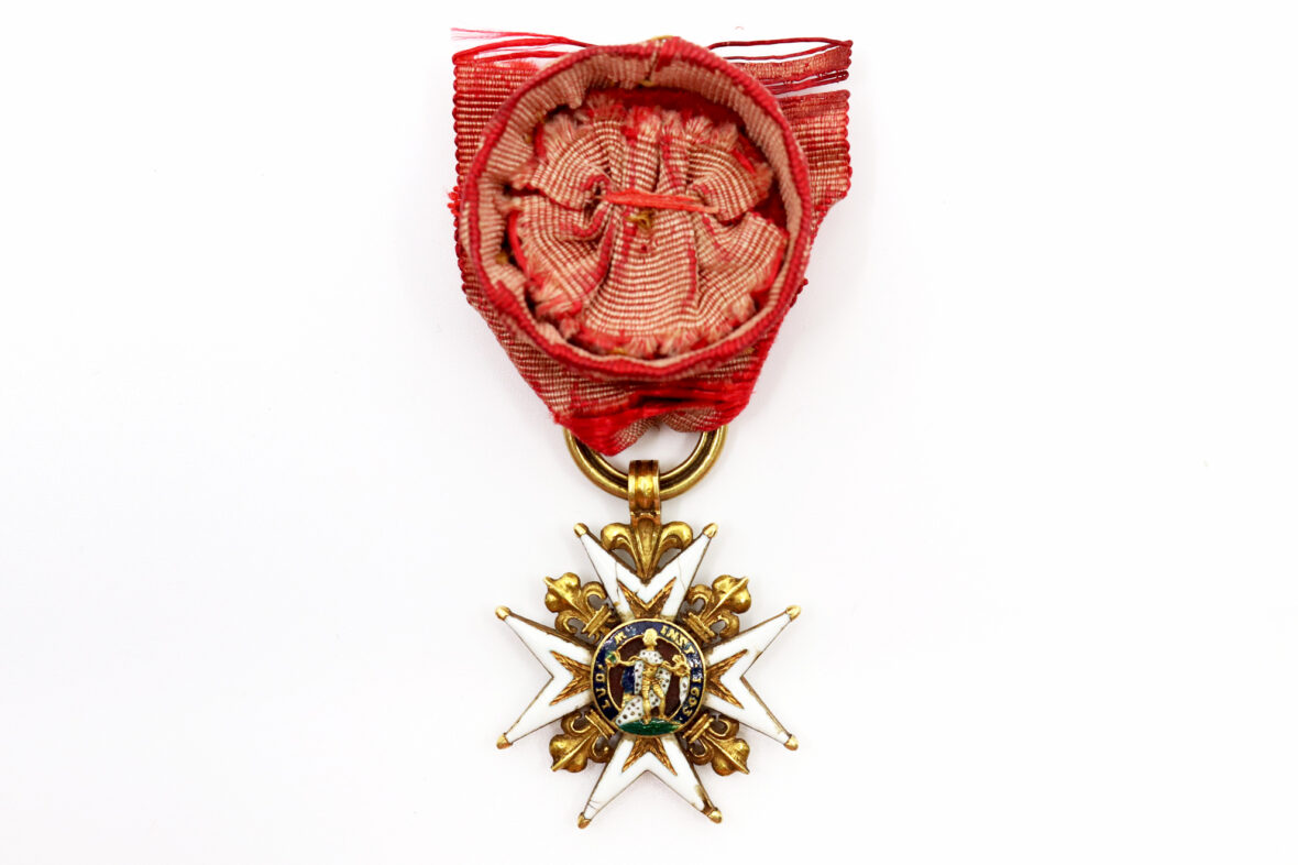 Croix de Saint Louis, époque Restauration. Beau bijou en or et émail, anneau canelé, pointes non pommetées cantonnées de fleurs de lys quelques infimes fels et manque à la branche inférieure droite au revers. Centre avers émaux polychromes avec texte doré « LUD. M. INST.1693 », revers texte « BELL.VIRTUTIS. PRAEM. » Avec son ruban à bouffette insolé. Taille 34,34 mm x 28,5 mm.