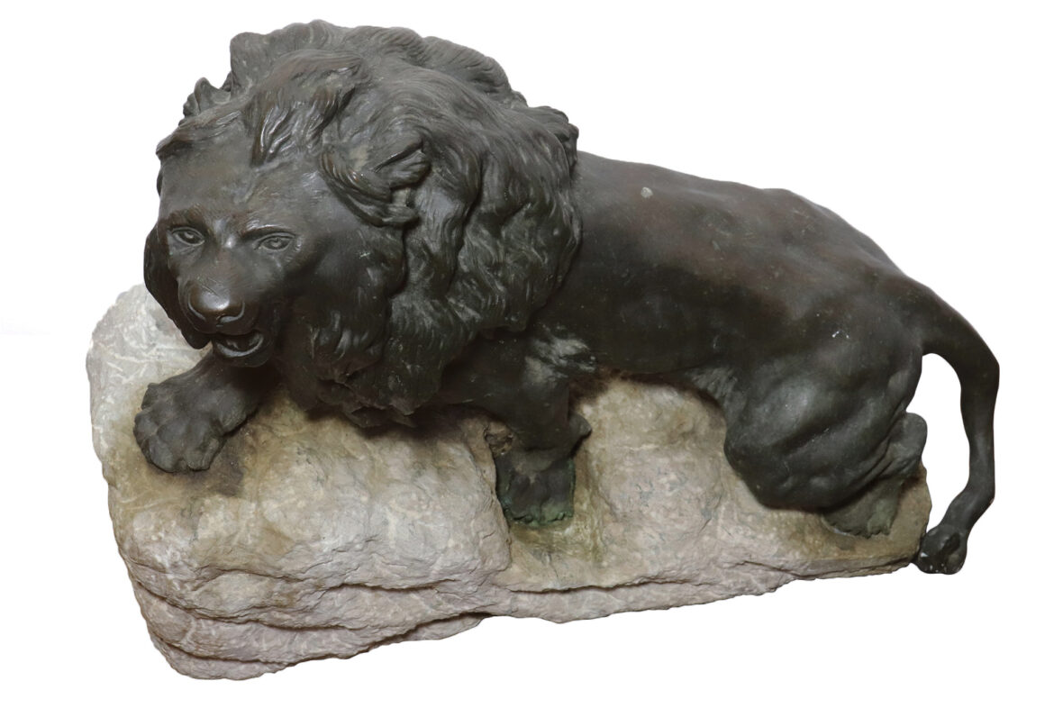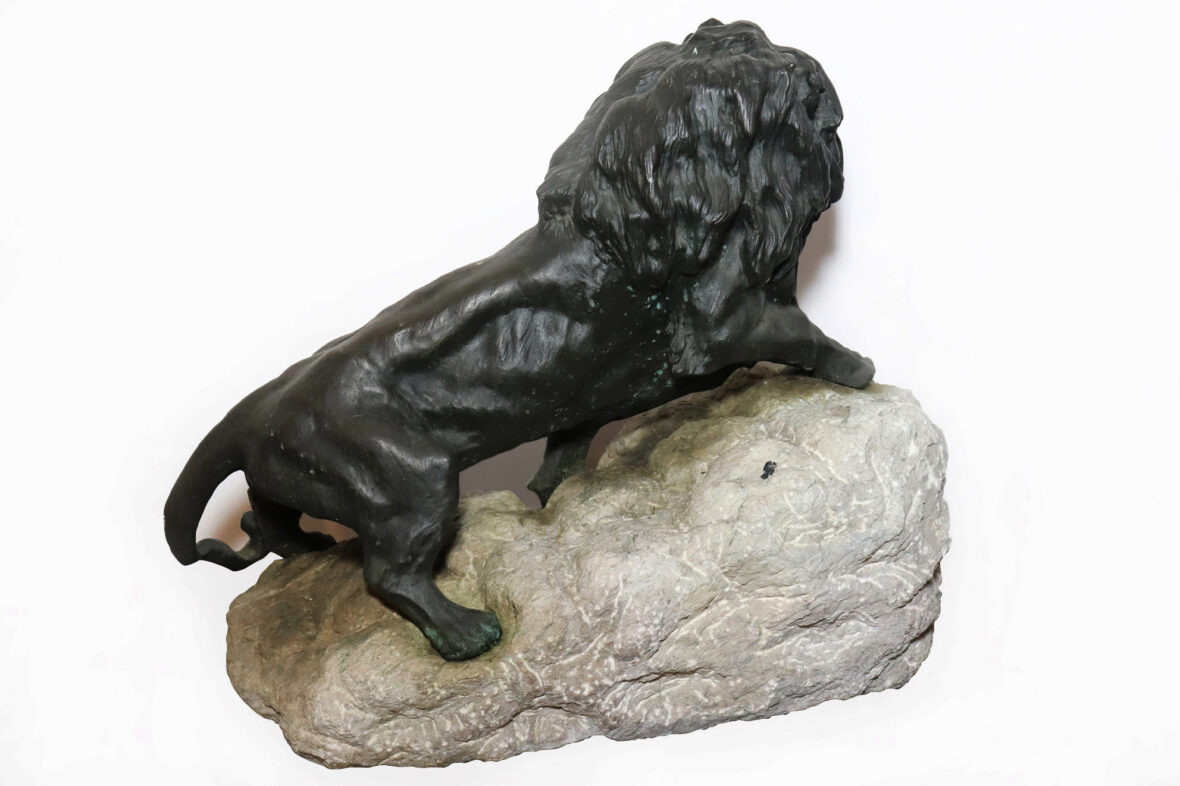Épreuve en bronze à patine verte sur un socle de pierre.