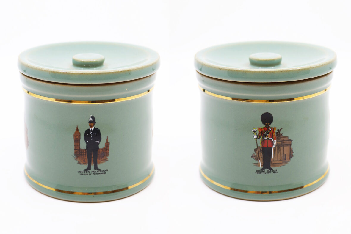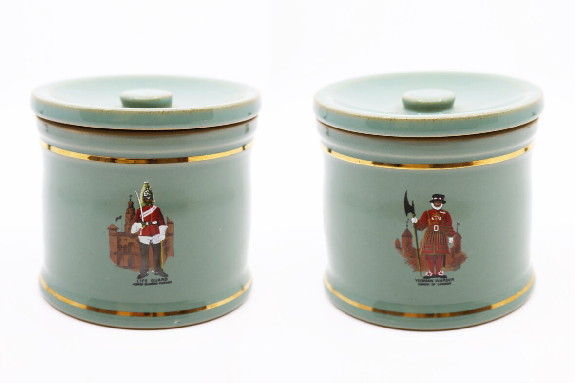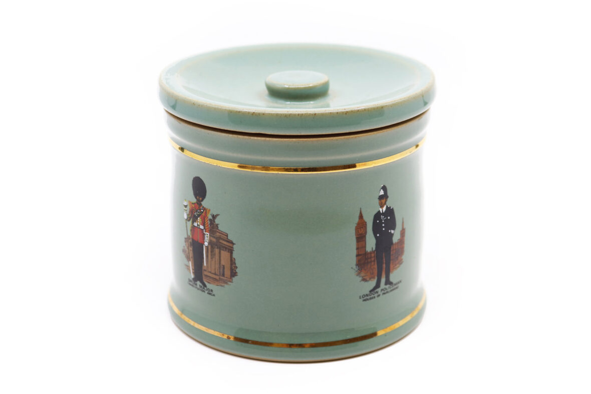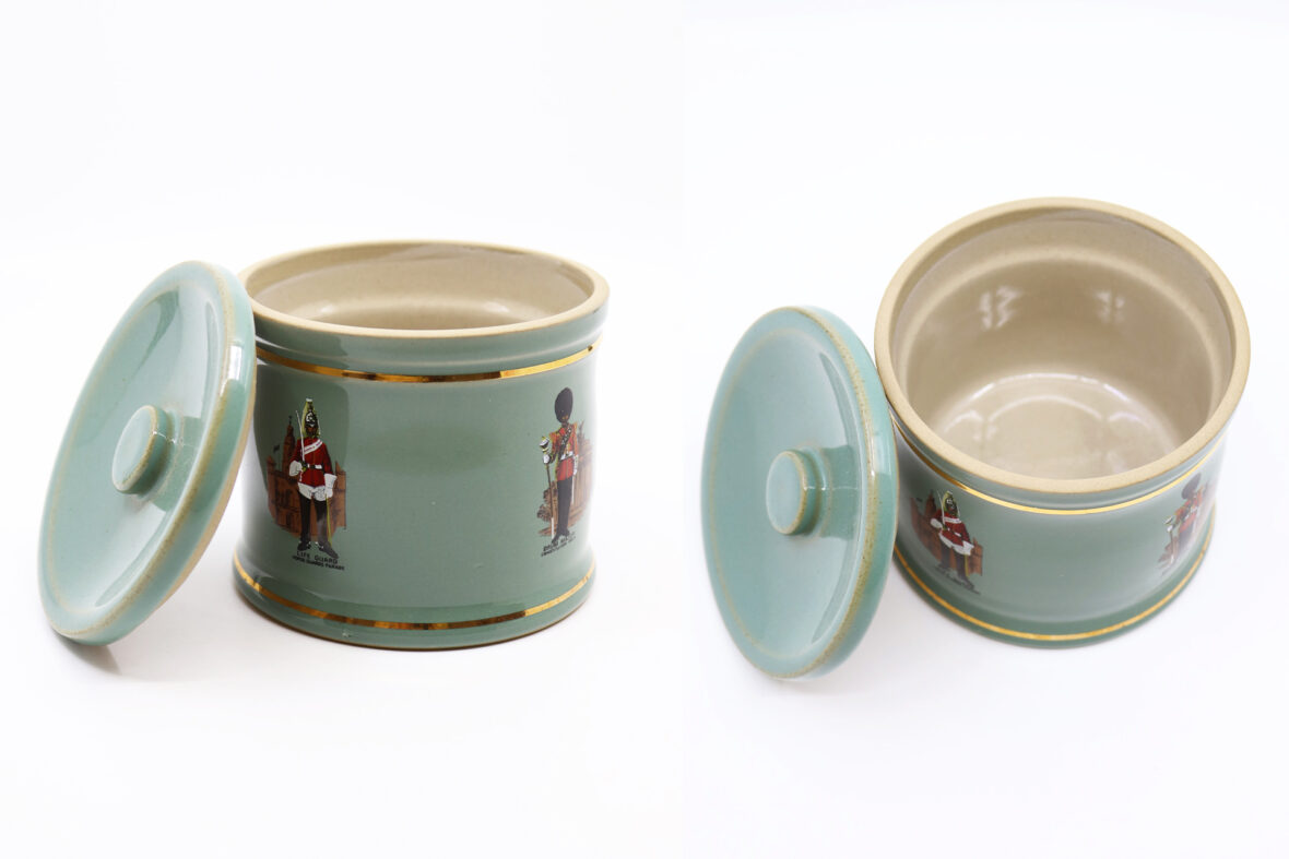 Sucrier couvert en grès émaillé à décor polychrome de personnages en uniforme sur un fond vert.