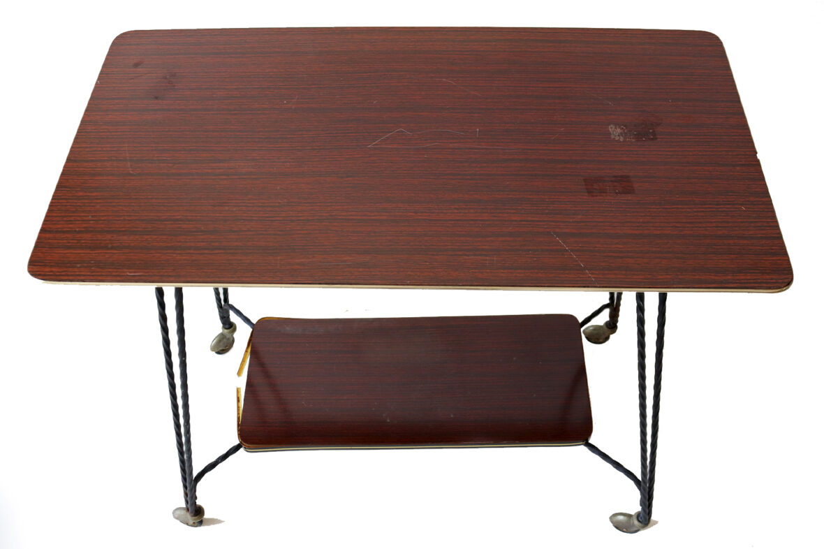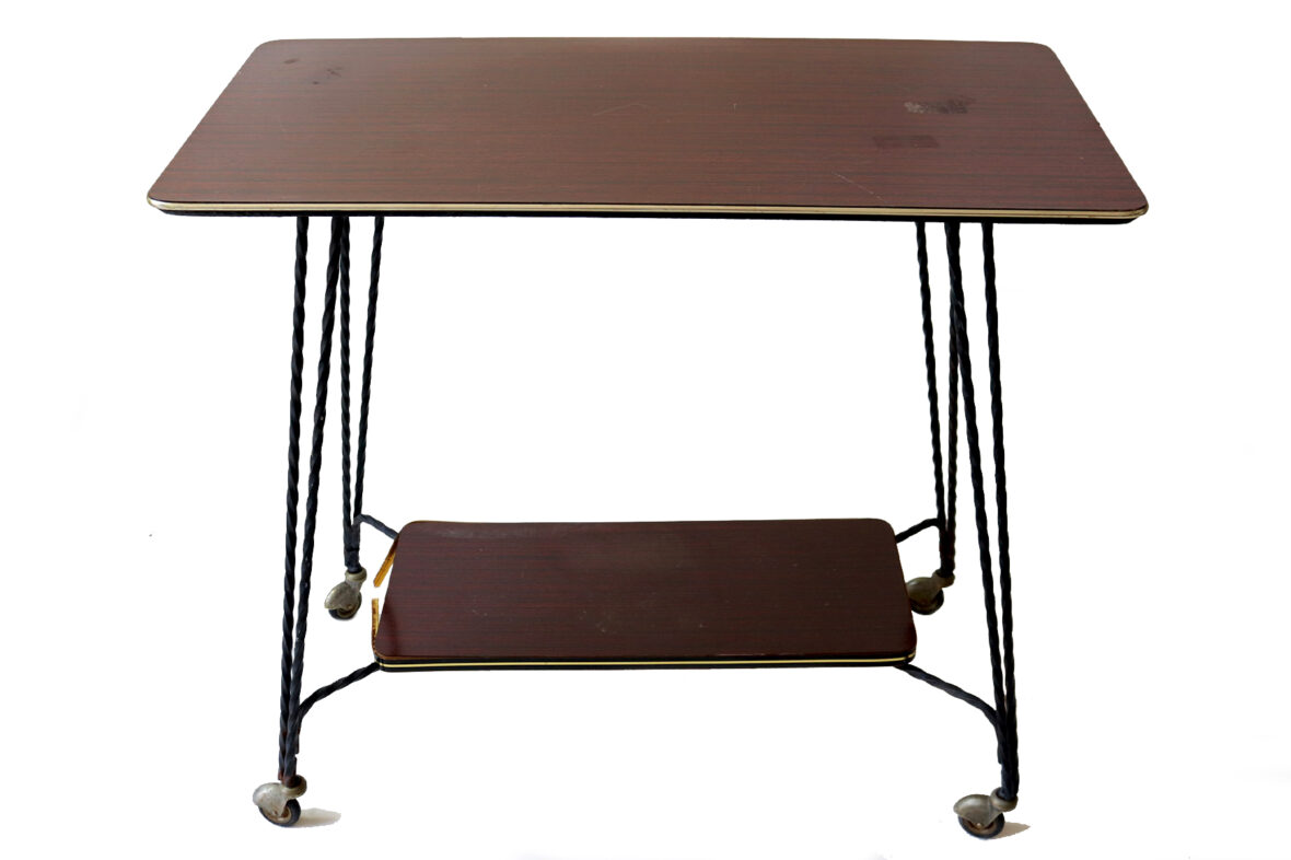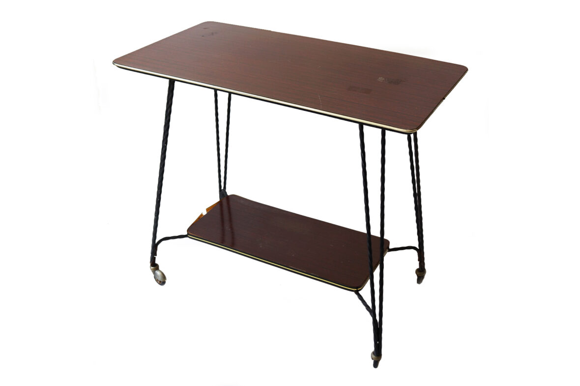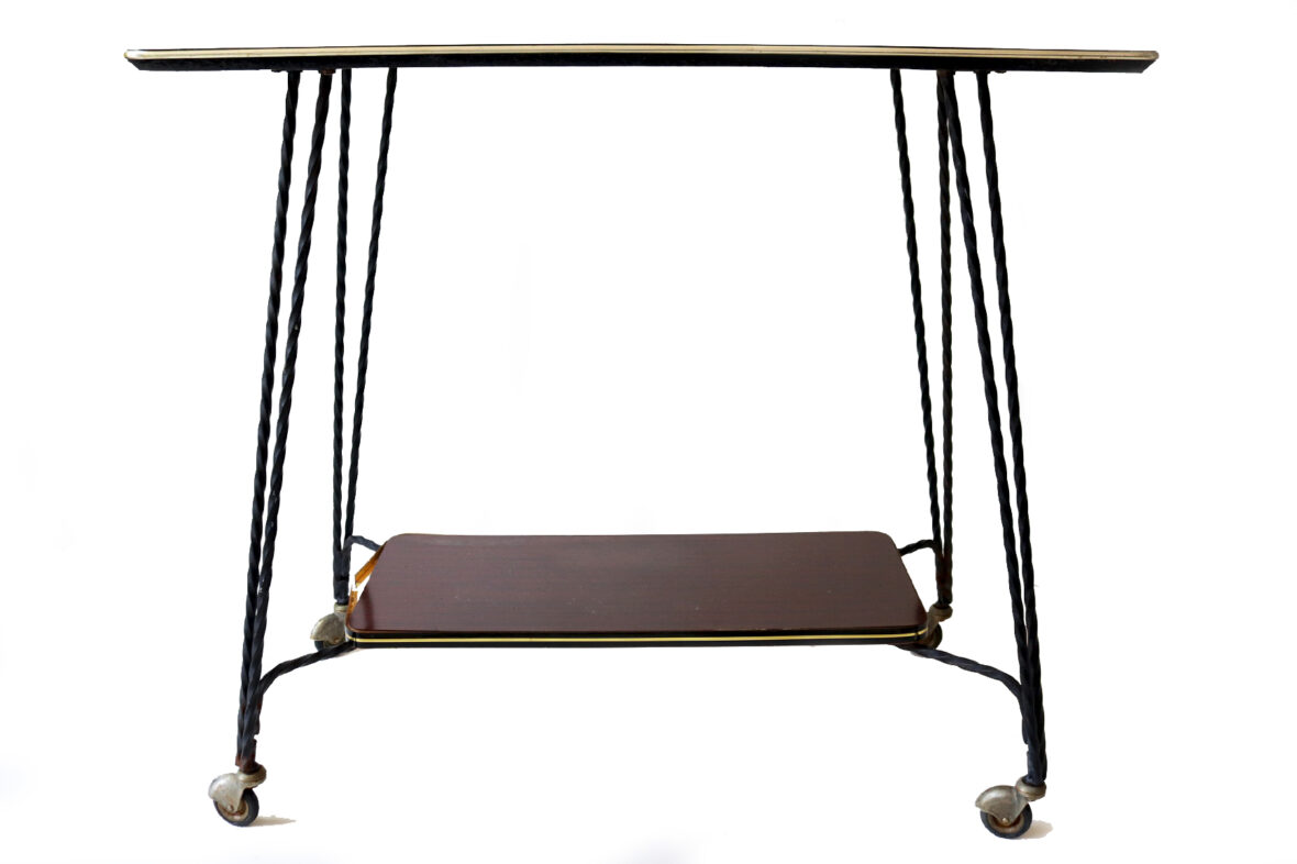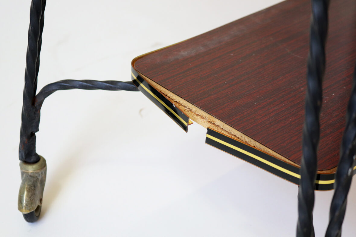 Desserte roulante en placage imitant l’acajou, à deux plateaux, le piètement en métal torse laqué noir.