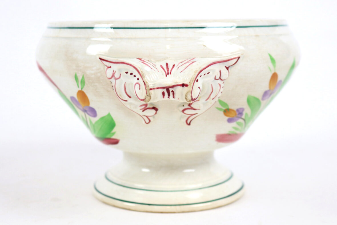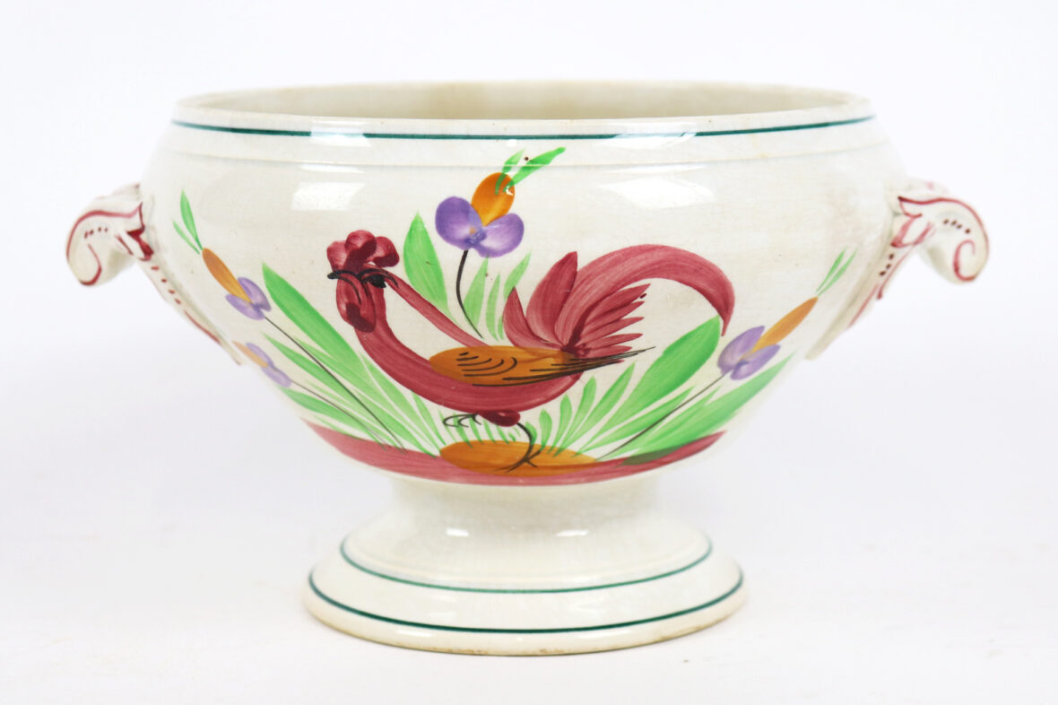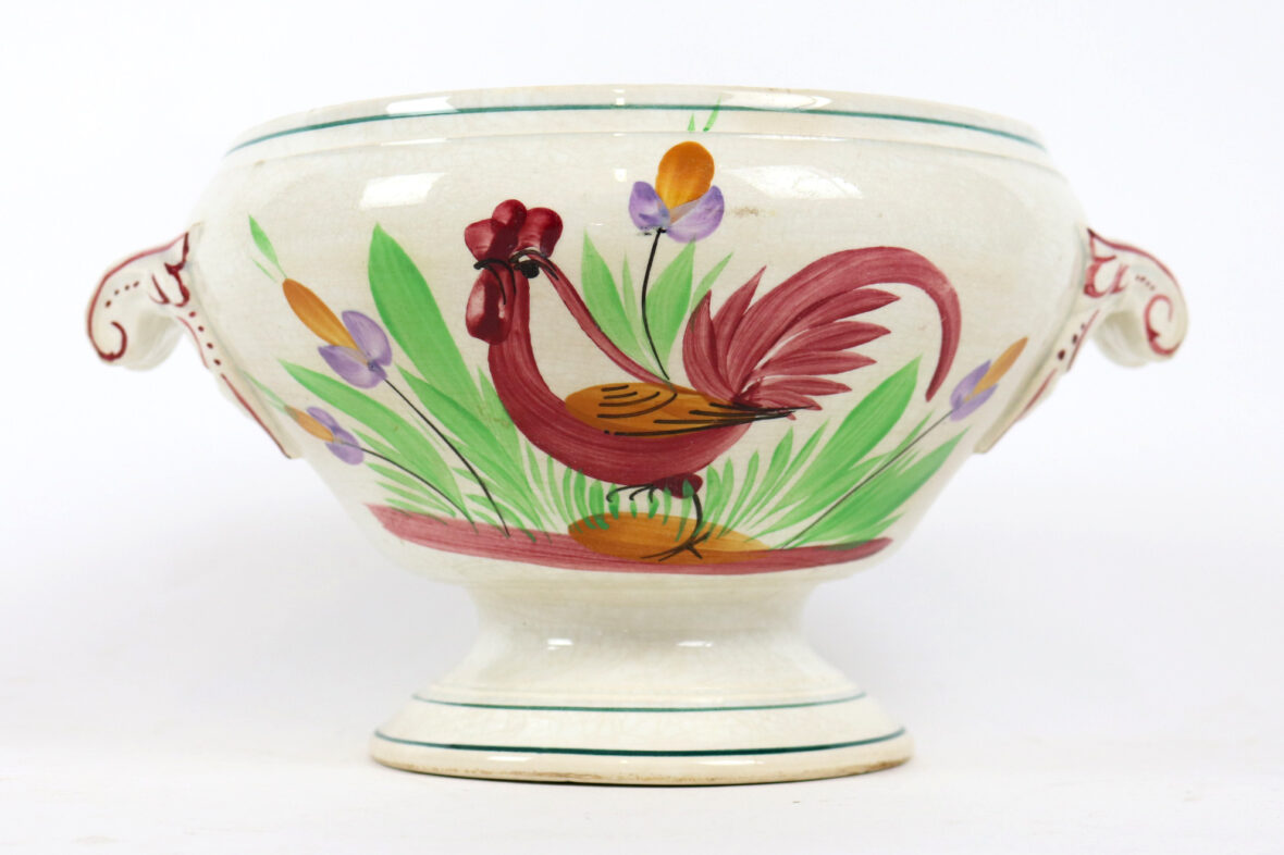 Soupière sur piédouche en faïence émaillée à décor de coq.