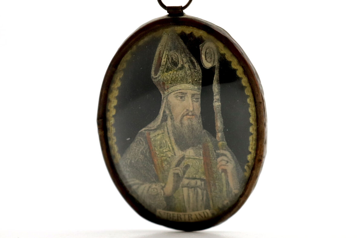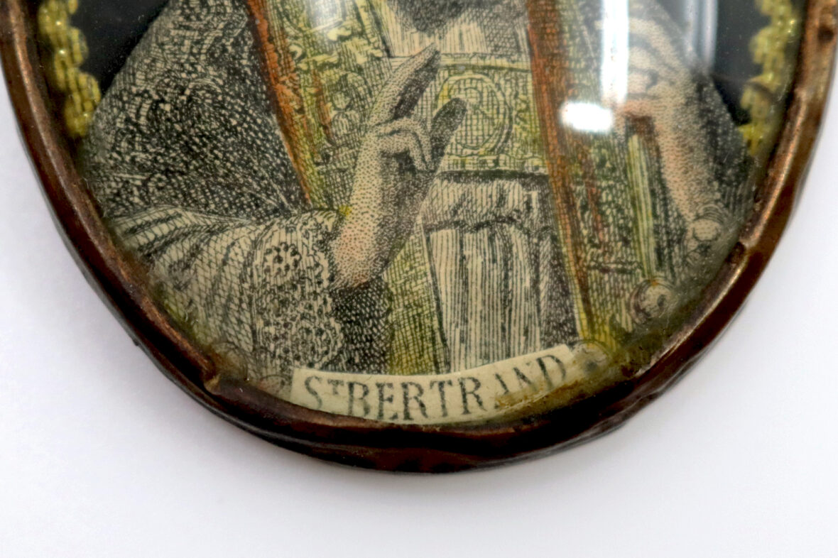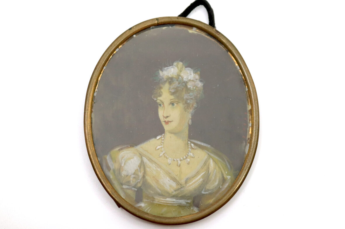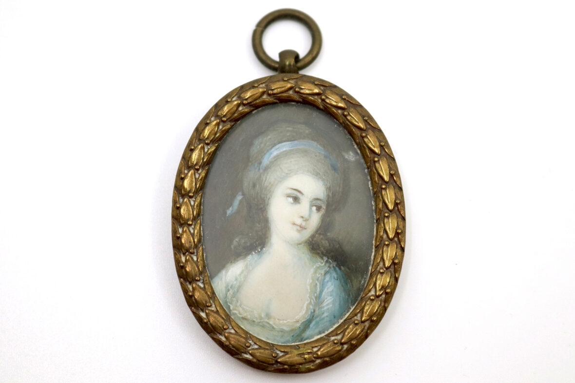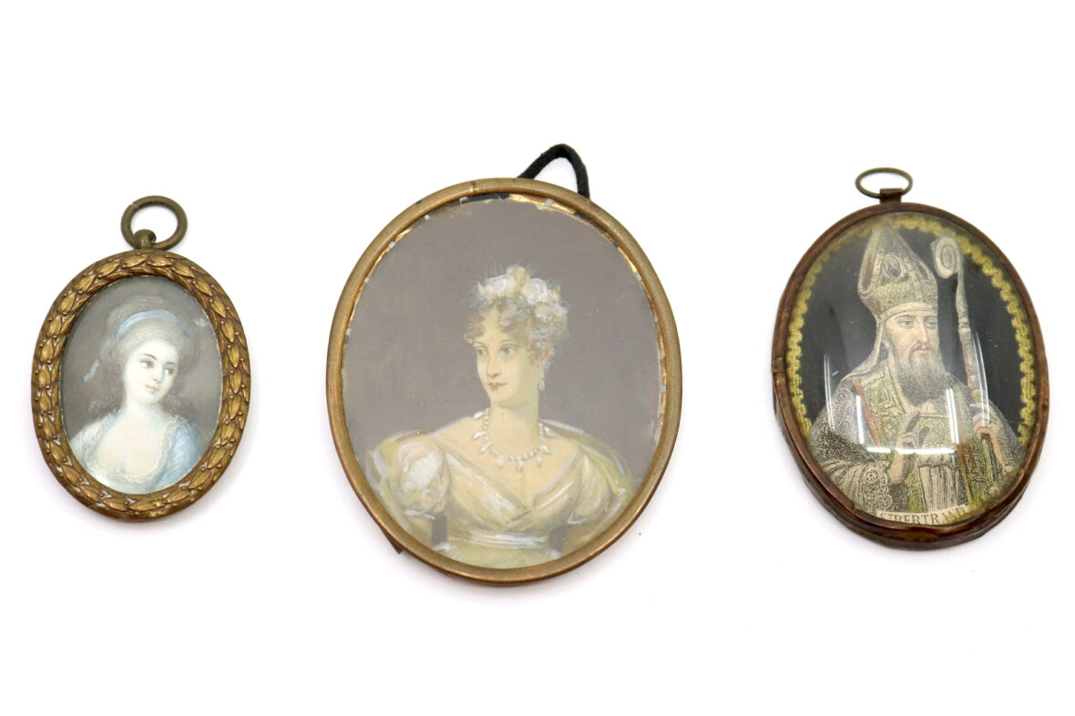 Ensemble de trois miniatures montées en pendentif, deux sur ivoire figurant des élégantes, l’autre bombée ornée d’une gravure de Saint Bertrand.