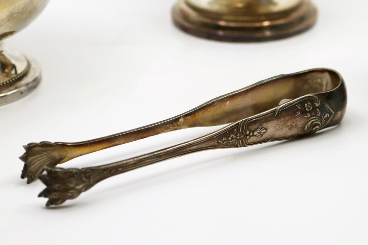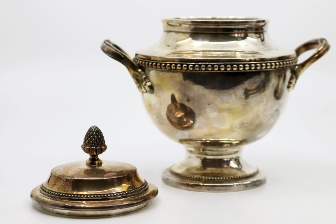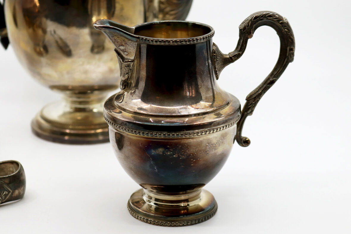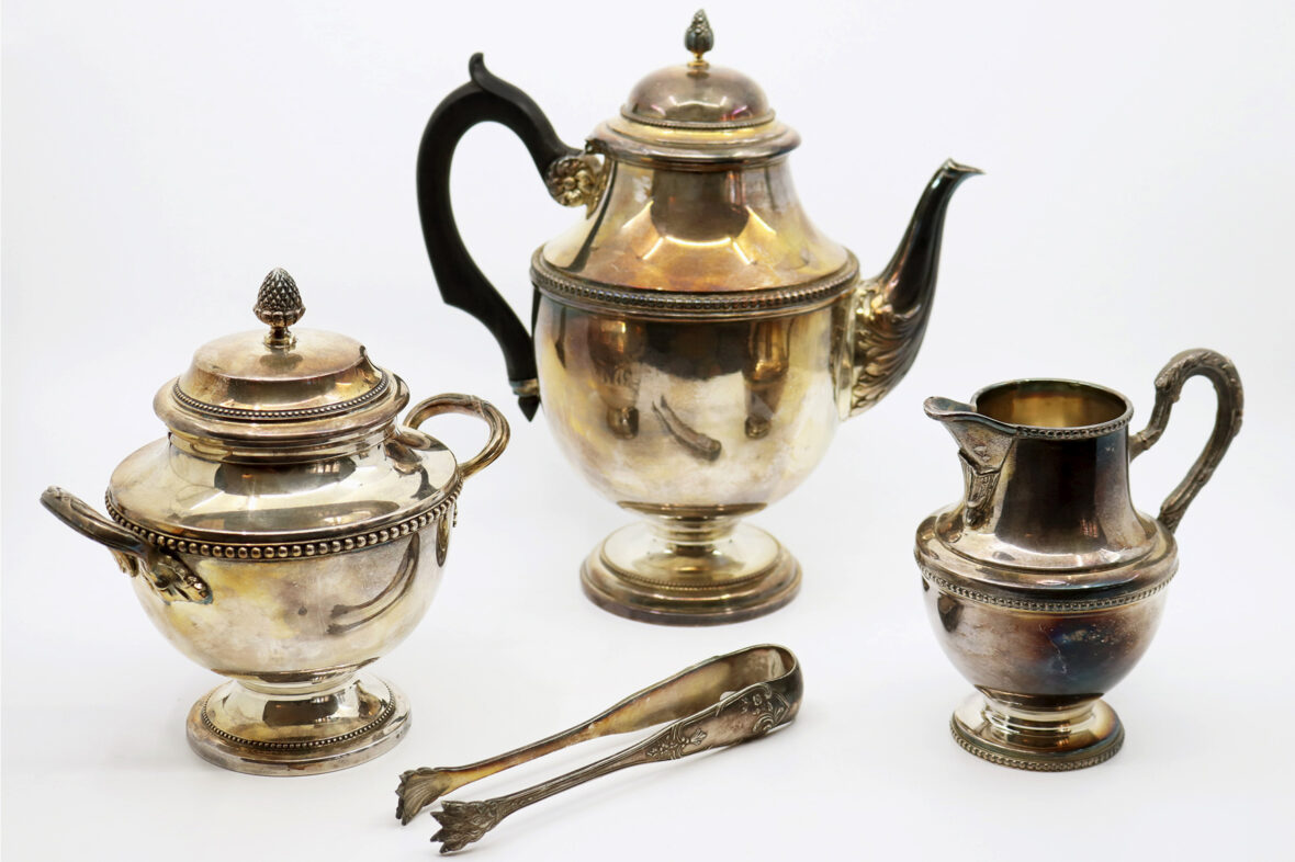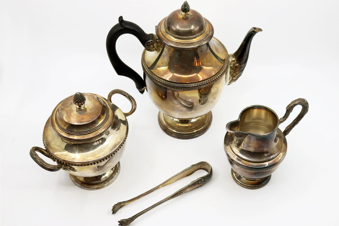 Ensemble assorti (mais dépareillé) comprenant une cafetière, un pot à lait, un sucrier et une pince à sucre en métal argenté à décor de feuillage stylisé et frises de perles.