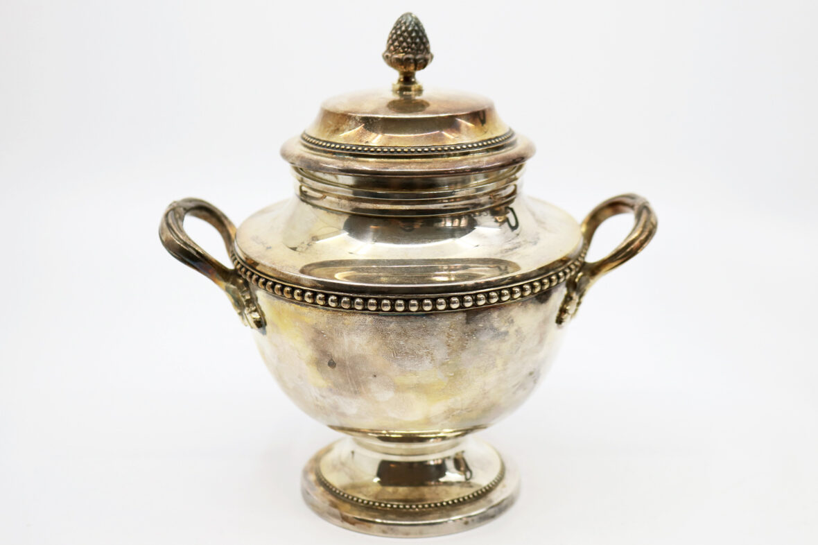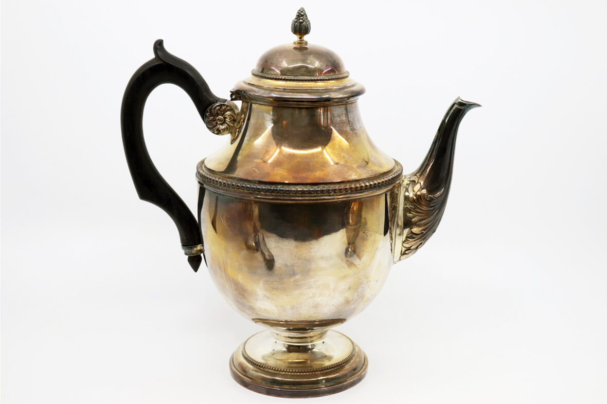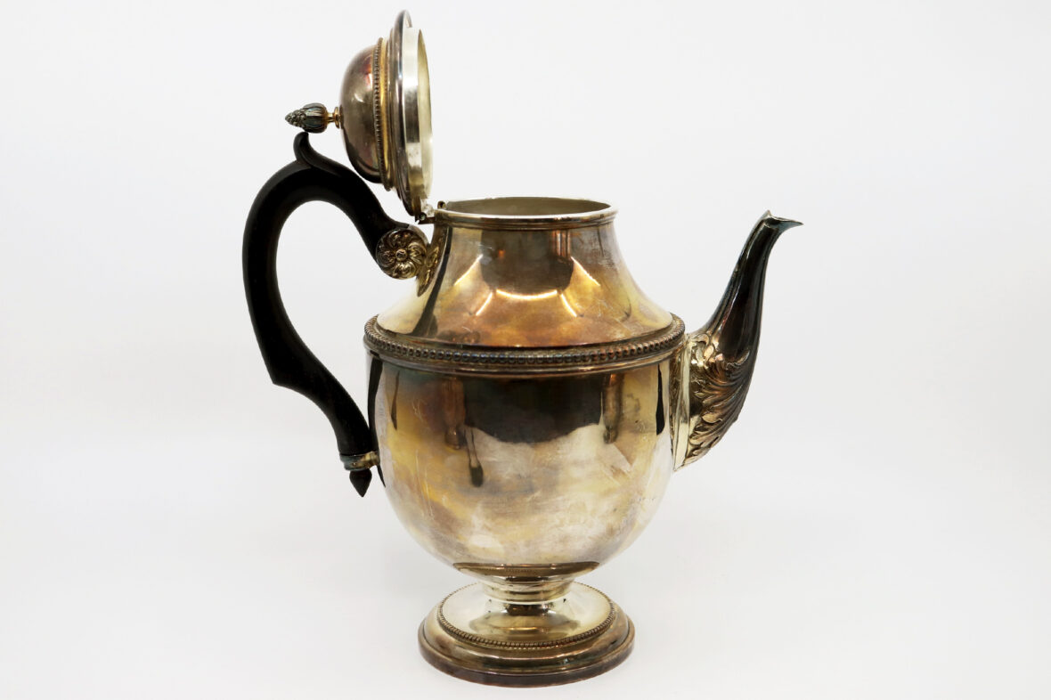Ensemble assorti (mais dépareillé) comprenant une cafetière, un pot à lait, un sucrier et une pince à sucre en métal argenté à décor de feuillage stylisé et frises de perles.