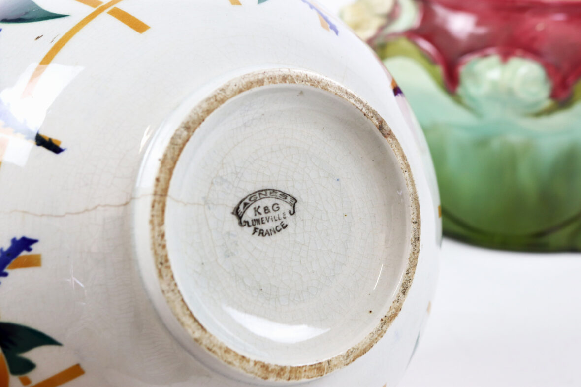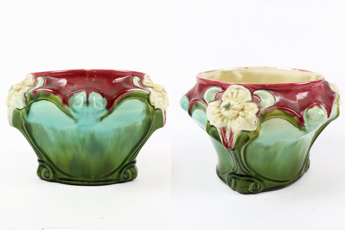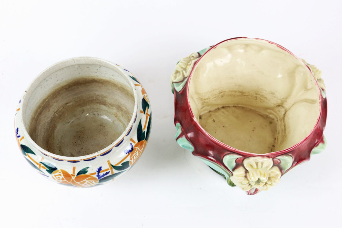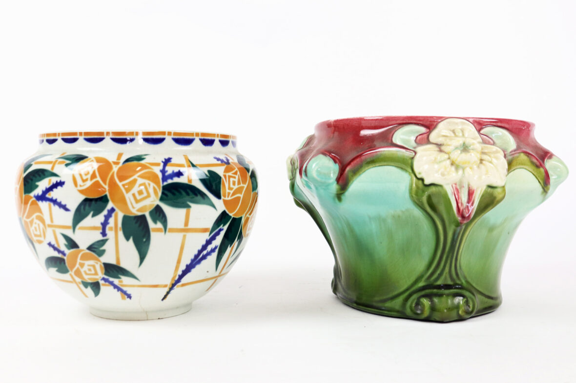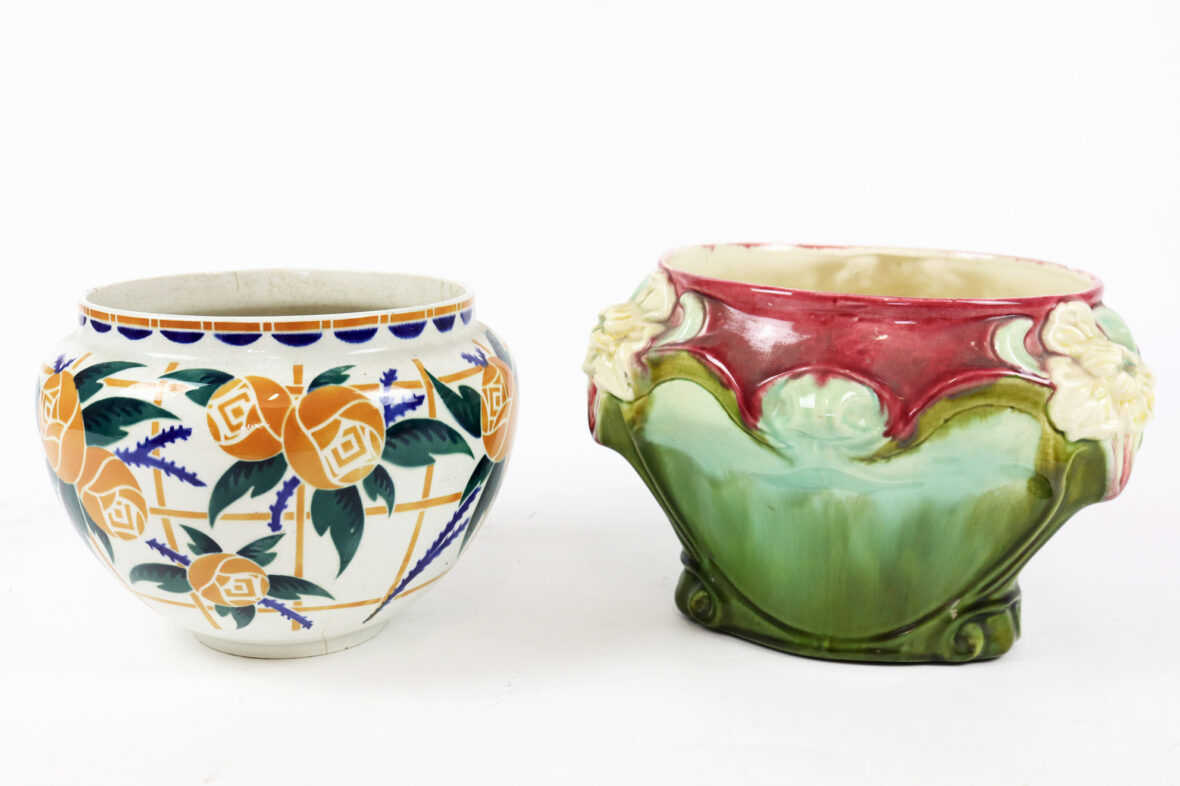 Ensemble comprenant deux caches-pots, l’un en céramique à décor polychrome de roses stylisées (K&G Lunéville), le second en barbotine à décor d’iris sur fond rouge et vert.