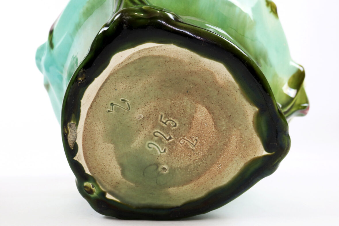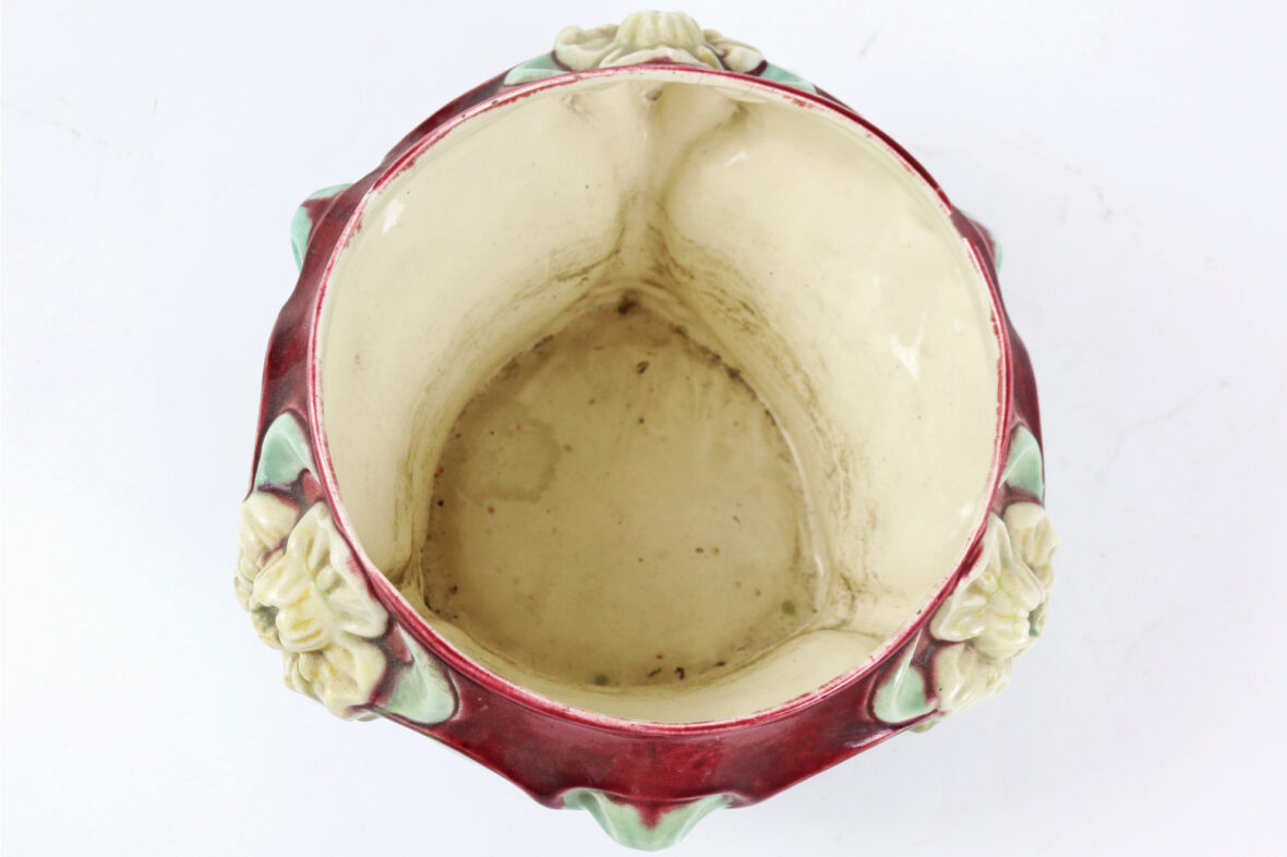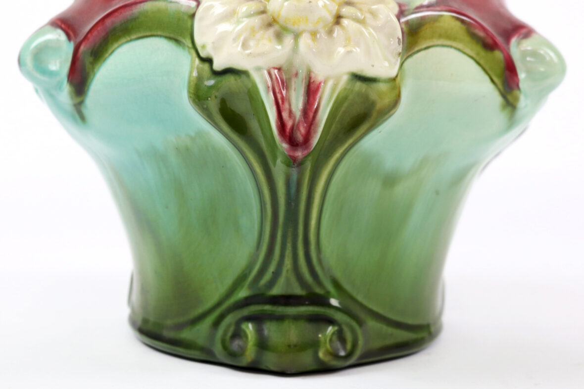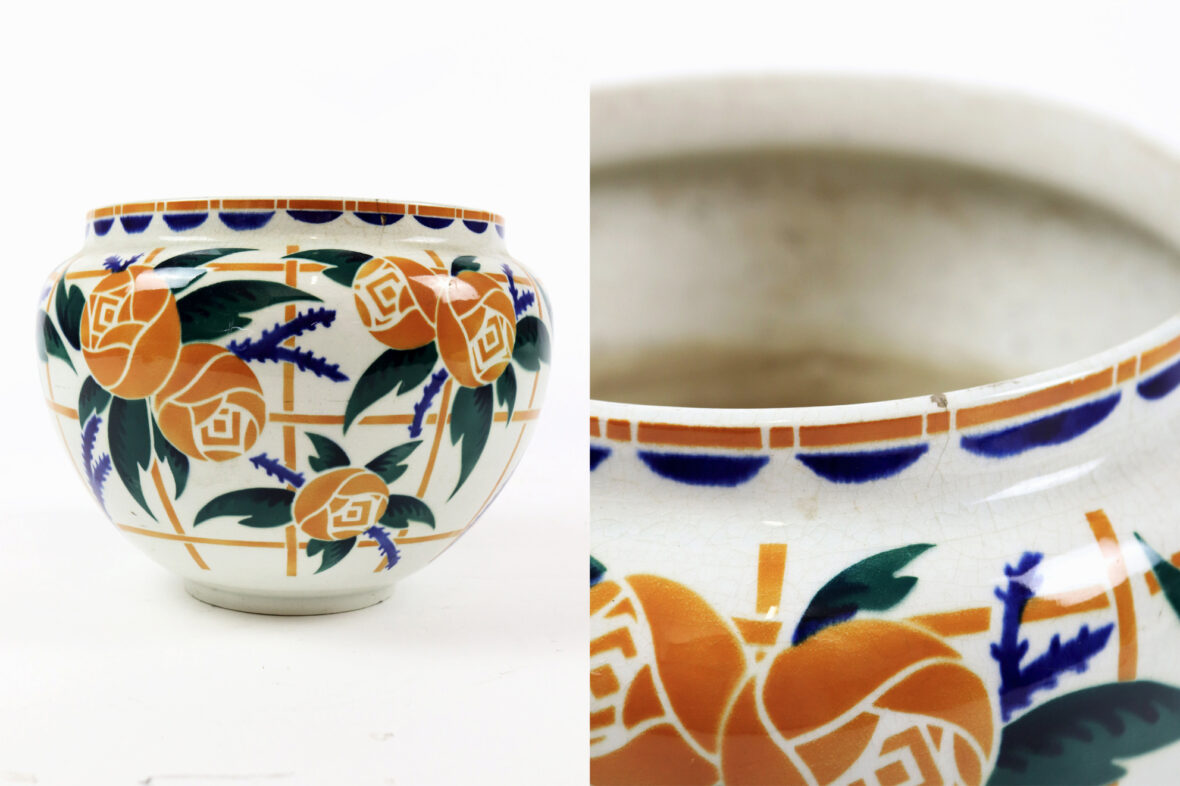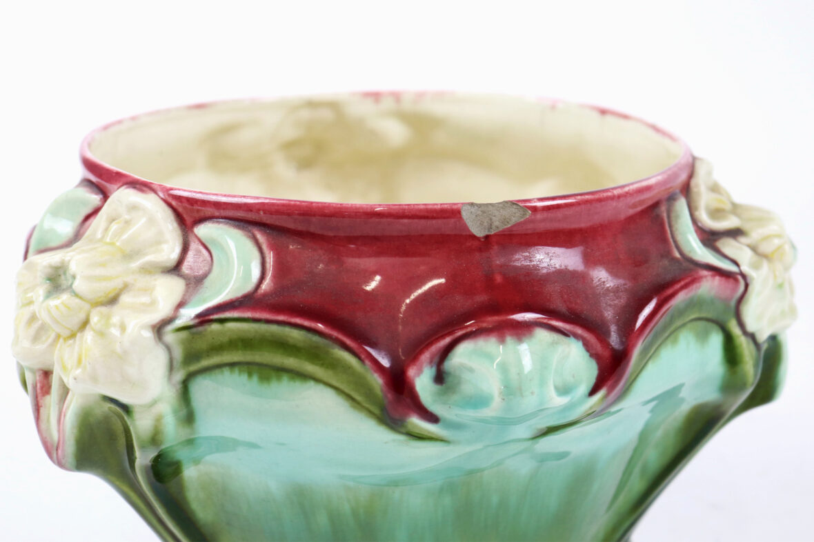 Ensemble comprenant deux caches-pots, l’un en céramique à décor polychrome de roses stylisées (K&G Lunéville), le second en barbotine à décor d’iris sur fond rouge et vert.