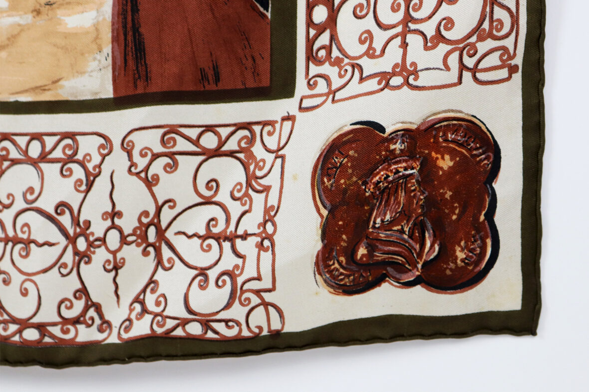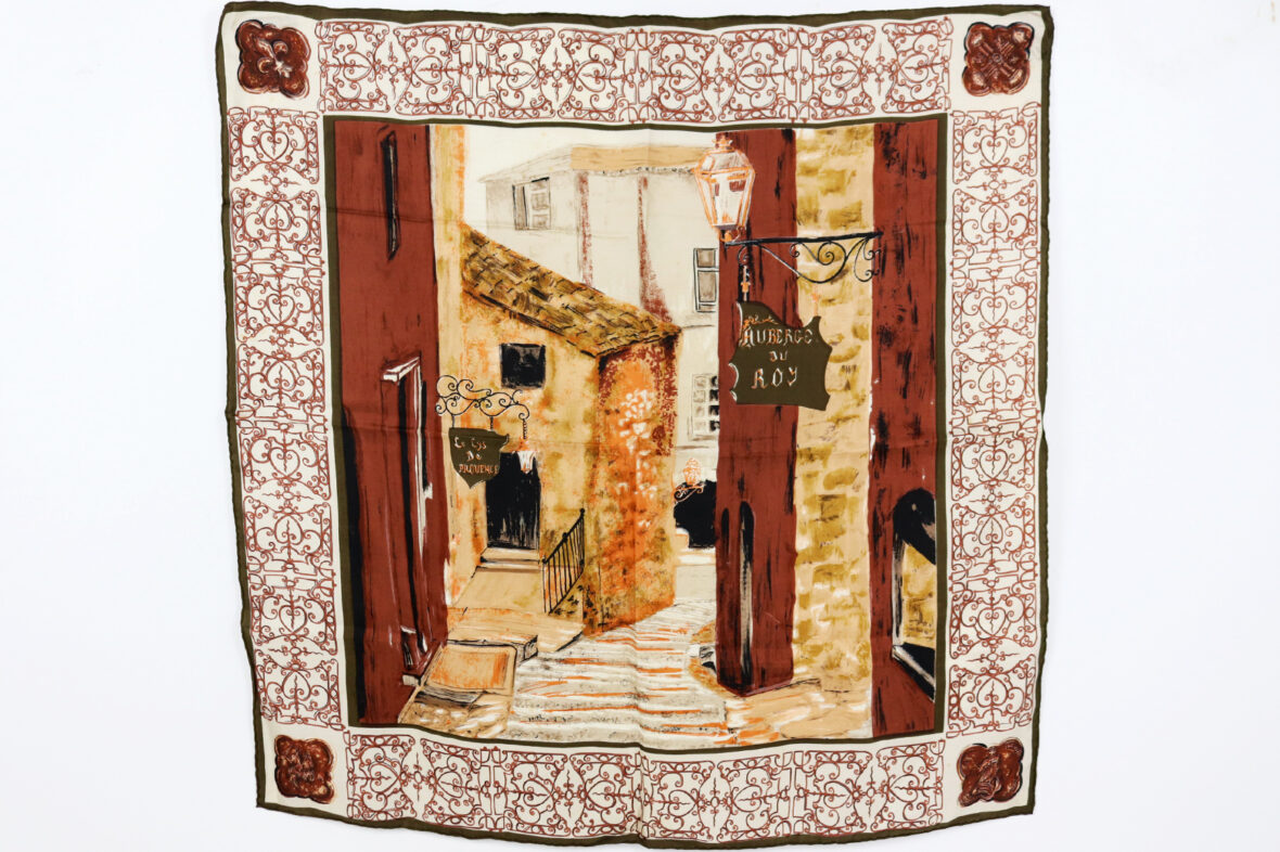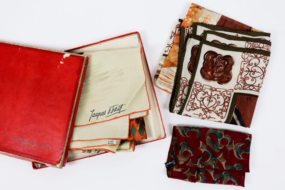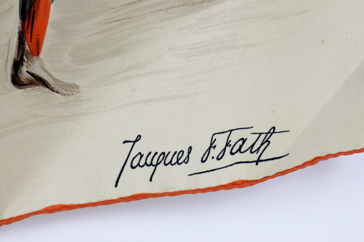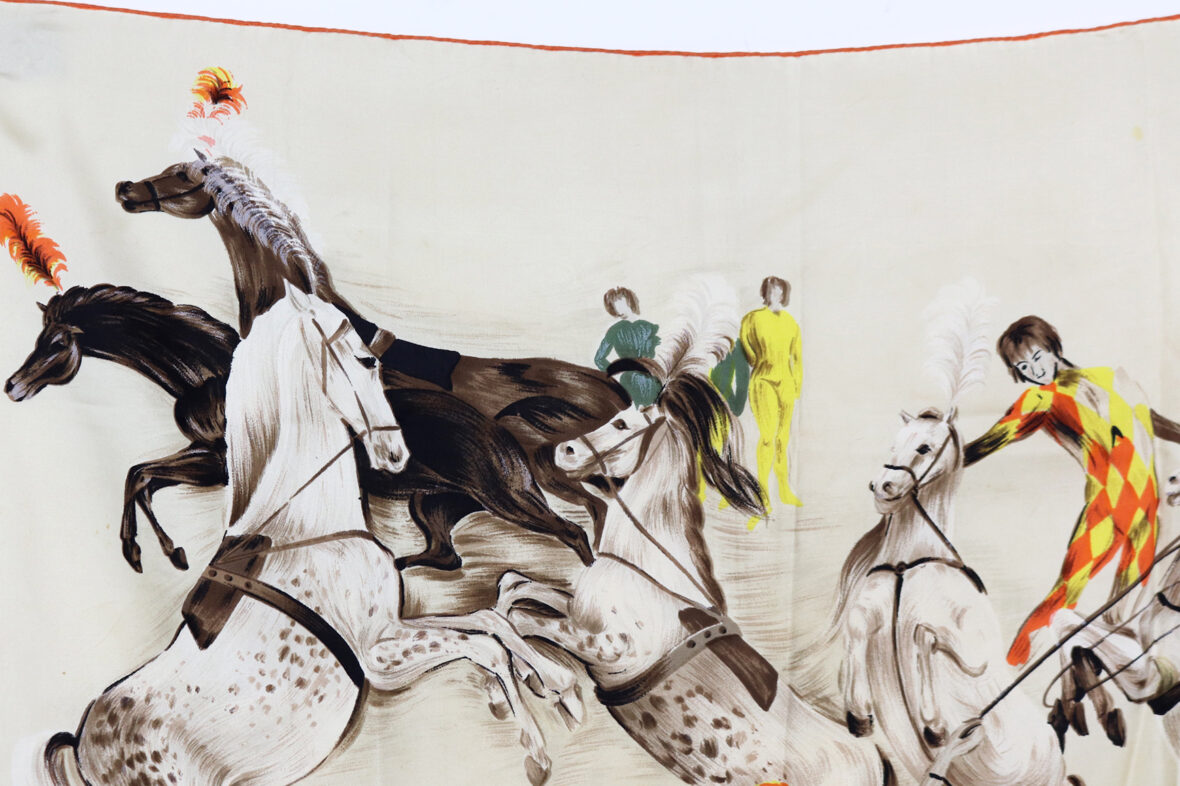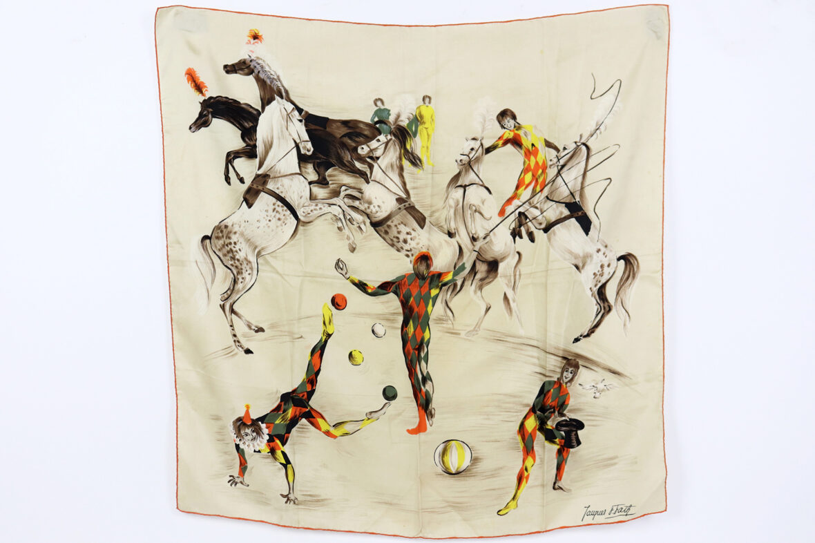 – Jacques F. Fath, carré en twill de soie à décor d’un spectacle de cirque. Dans son coffret.