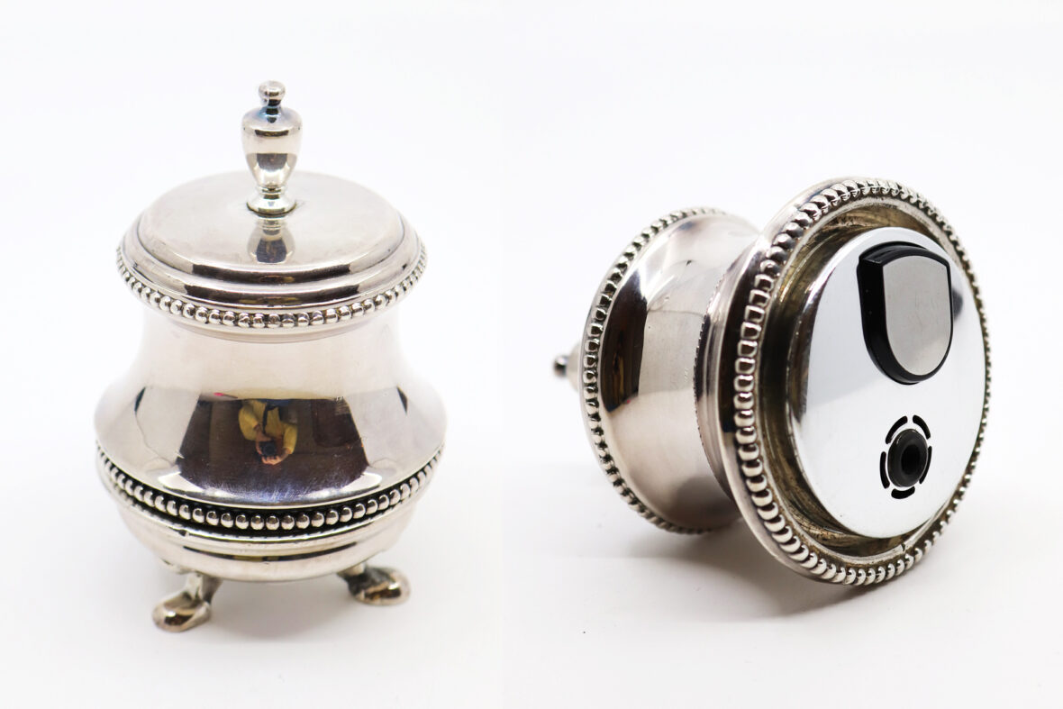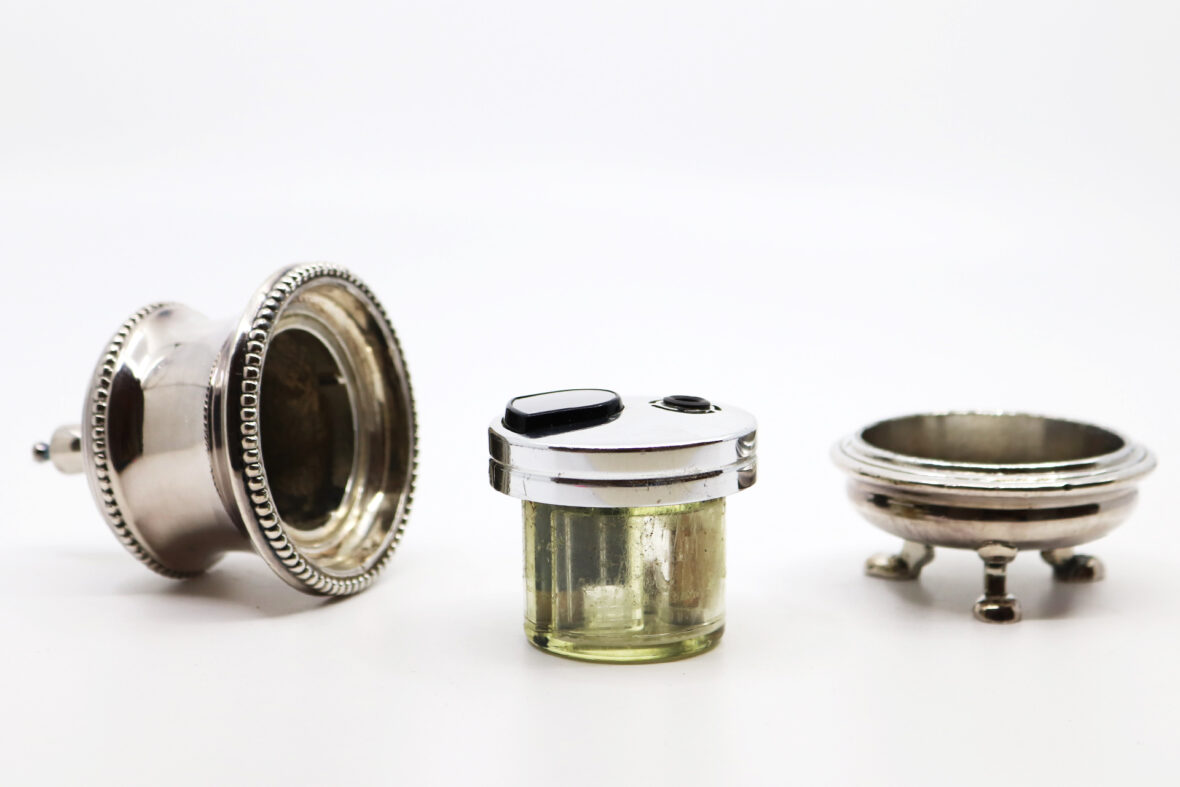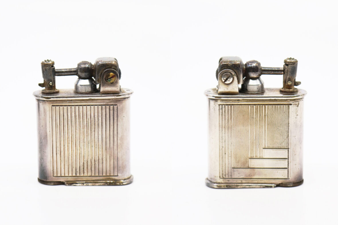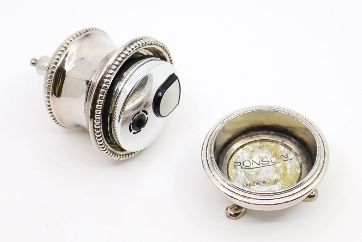 – RONSON. Briquet de table en métal argenté de frome balustre à décor de frises de perles.