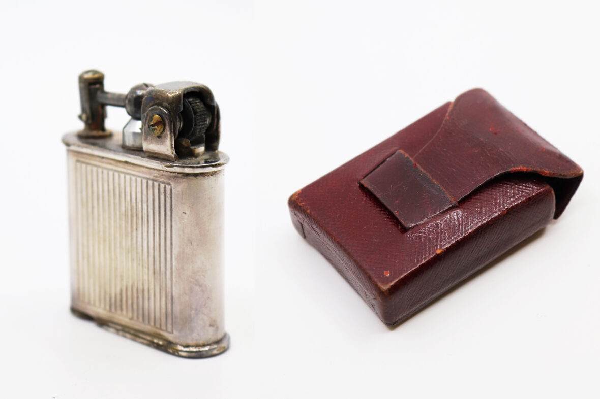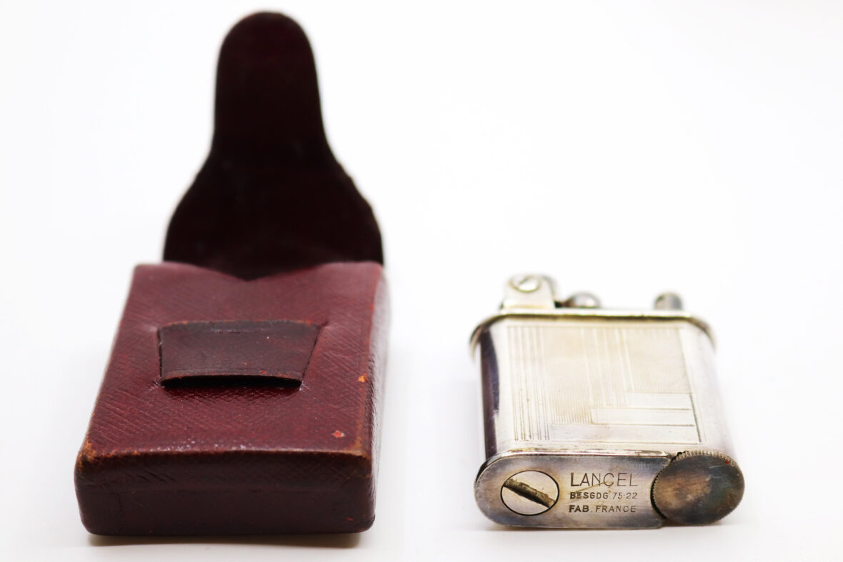 – LANCEL. Briquet en métal argenté dans son étui en cuir rouge. (Usures)