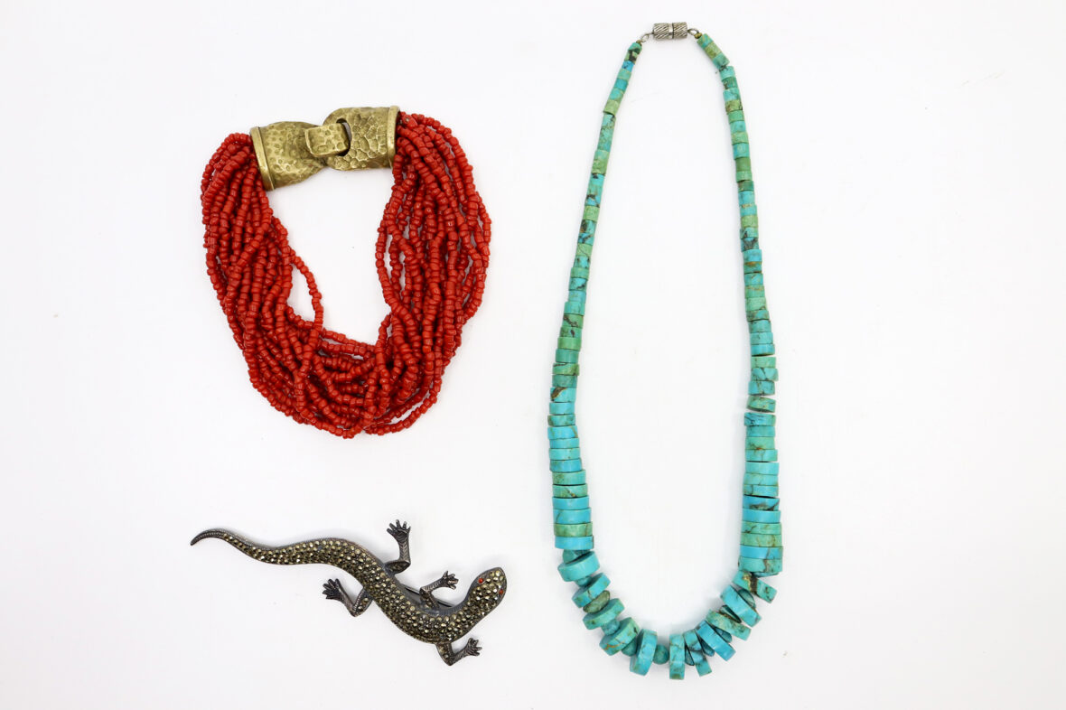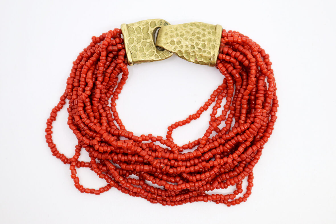 – un bracelet formé de 16 rangs de perles corail, le fermoir en métal doré.