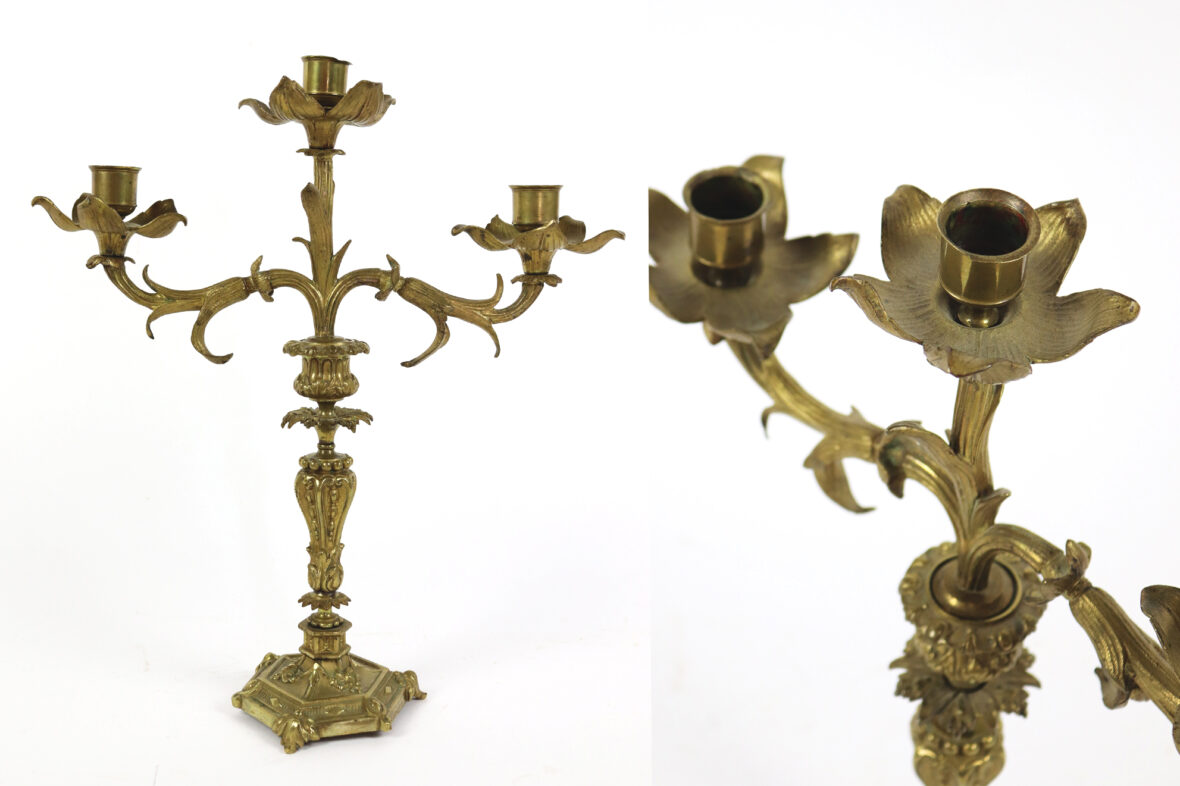– un chandelier à 3 lumières en bronze ciselé et doré à décor de feuillage.