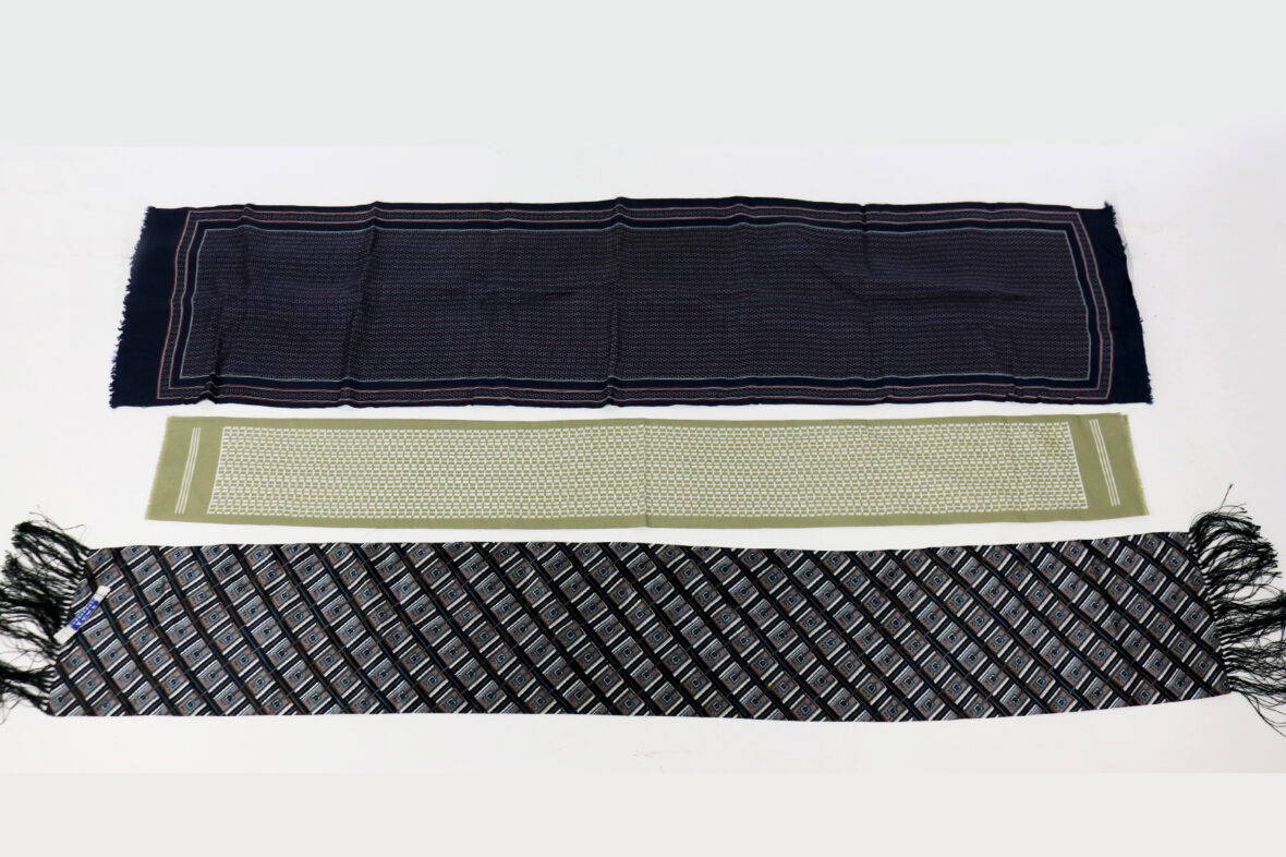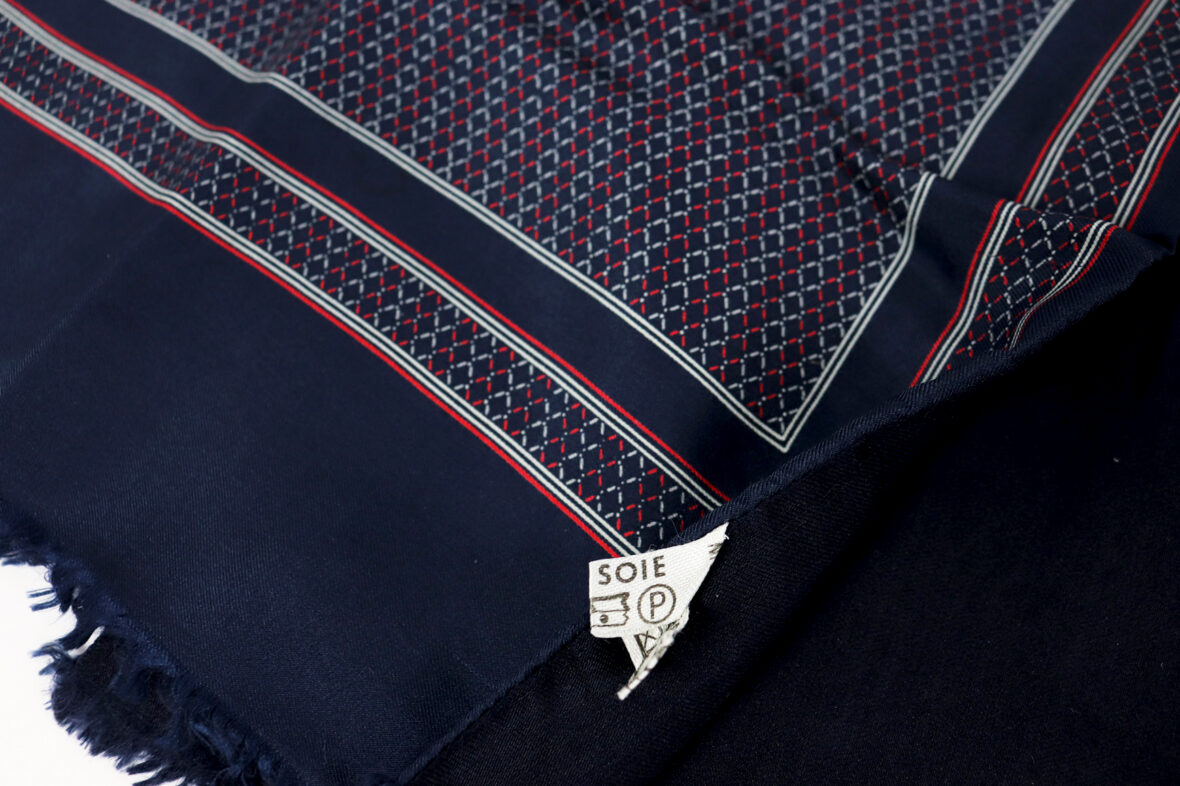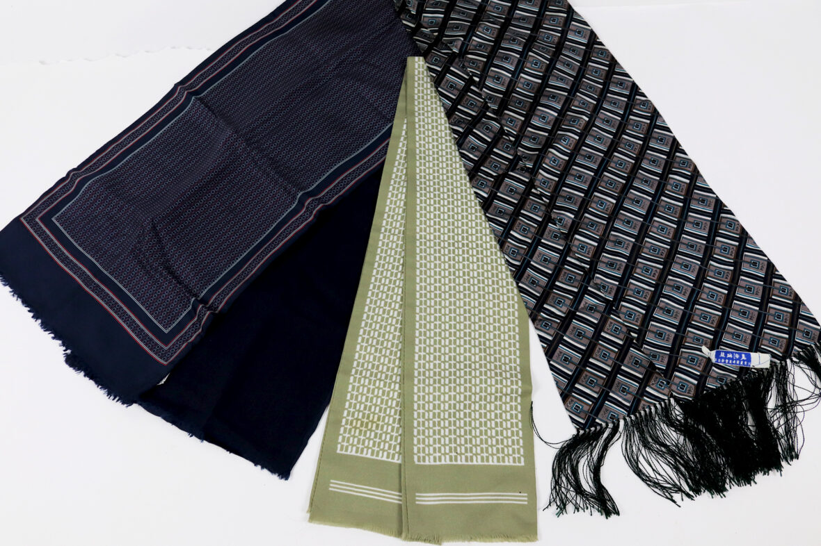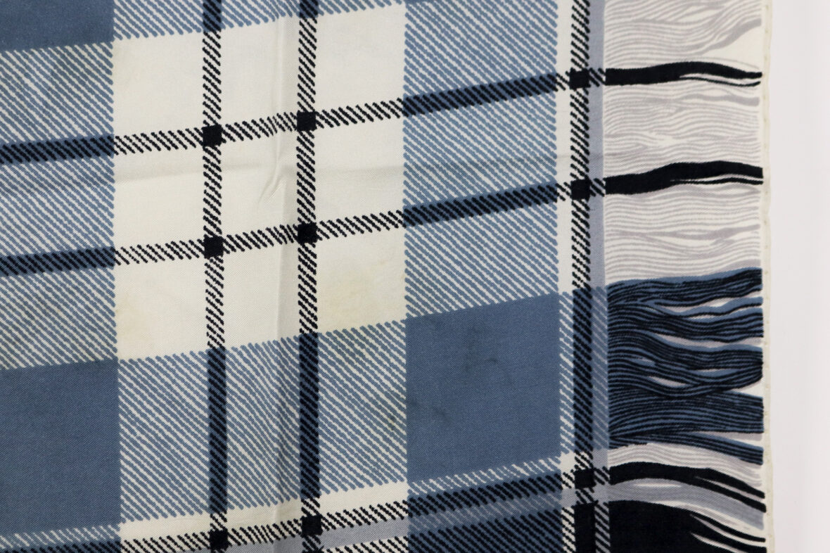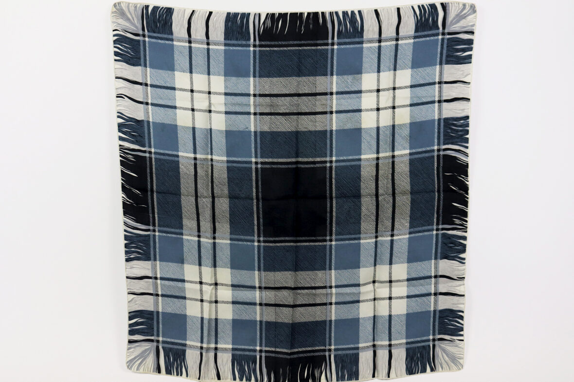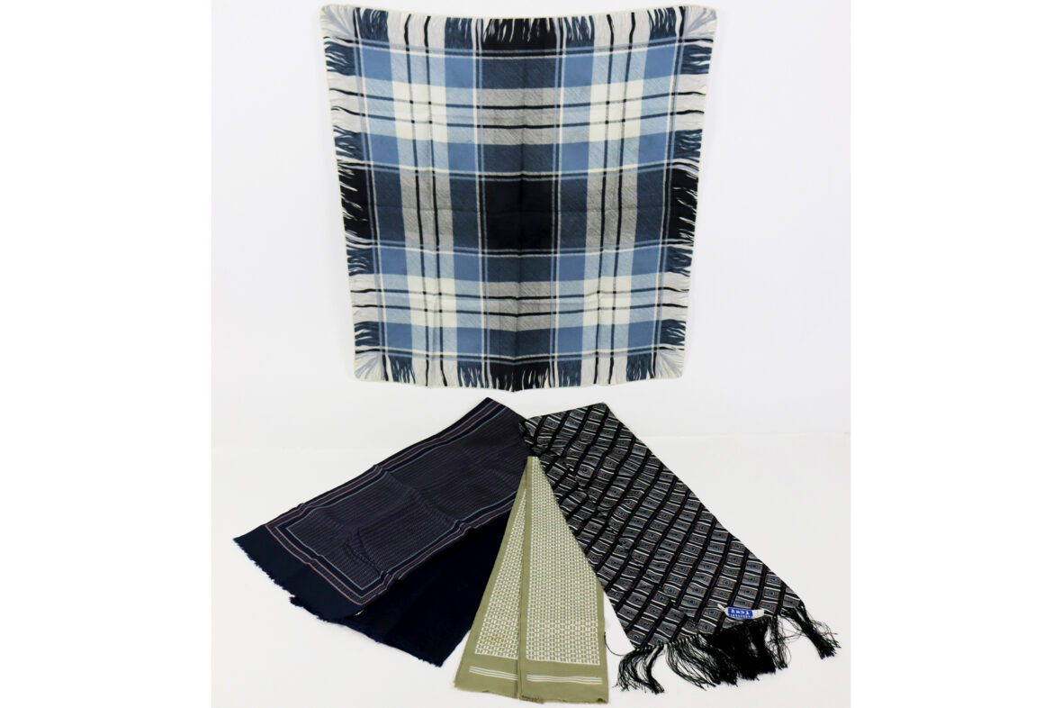 Ensemble comprenant un foulard à carreaux bleus et noirs et trois écharpes en soie.