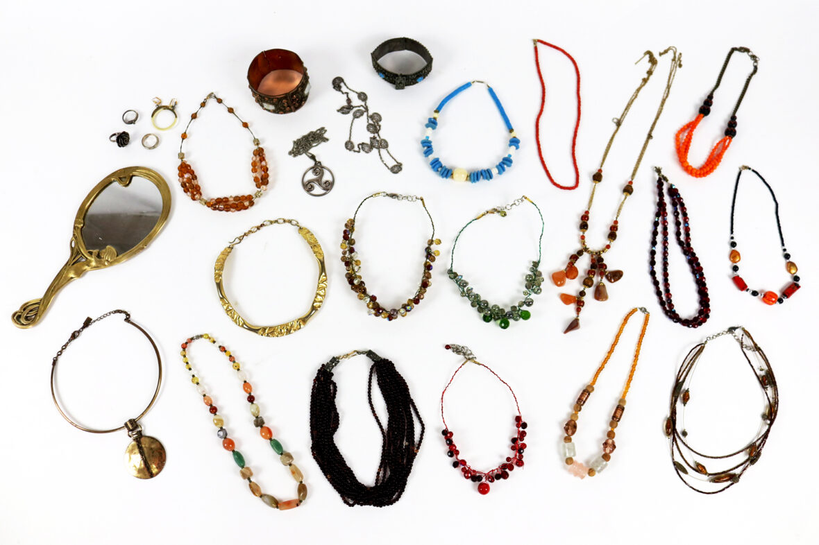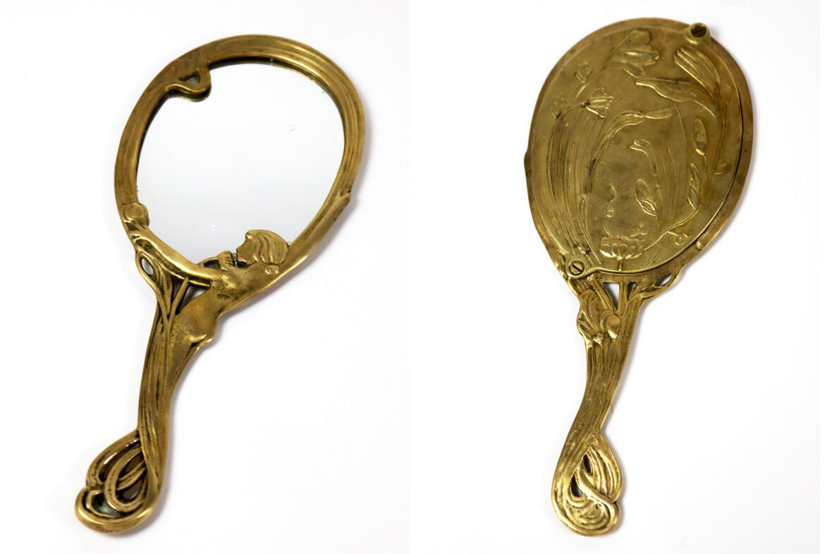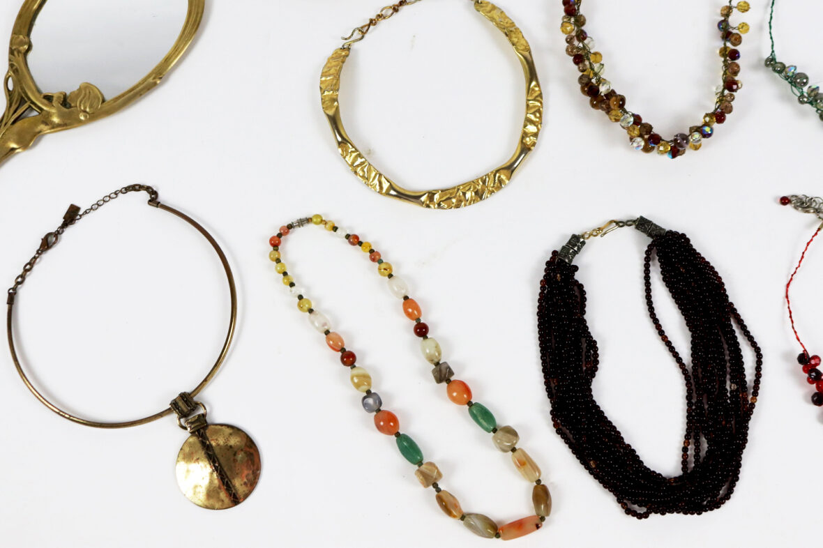 Ensemble comprenant un lot de bijoux de fantaisie, deux bracelets joncs articulés en métal travail d’Europe centrale, un miroir à main en bronze doré à décor de style art nouveau.