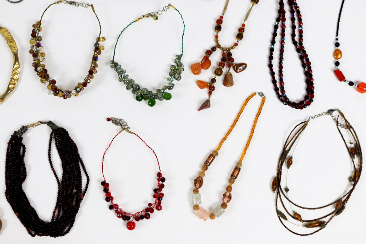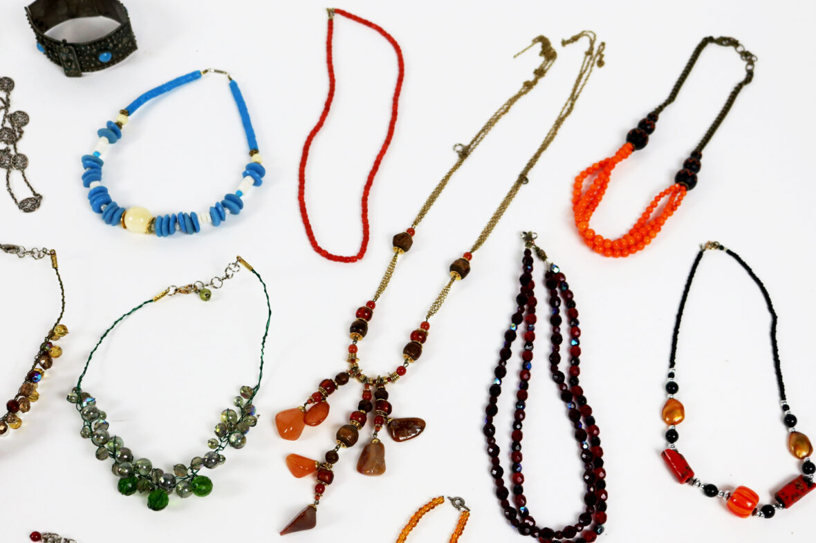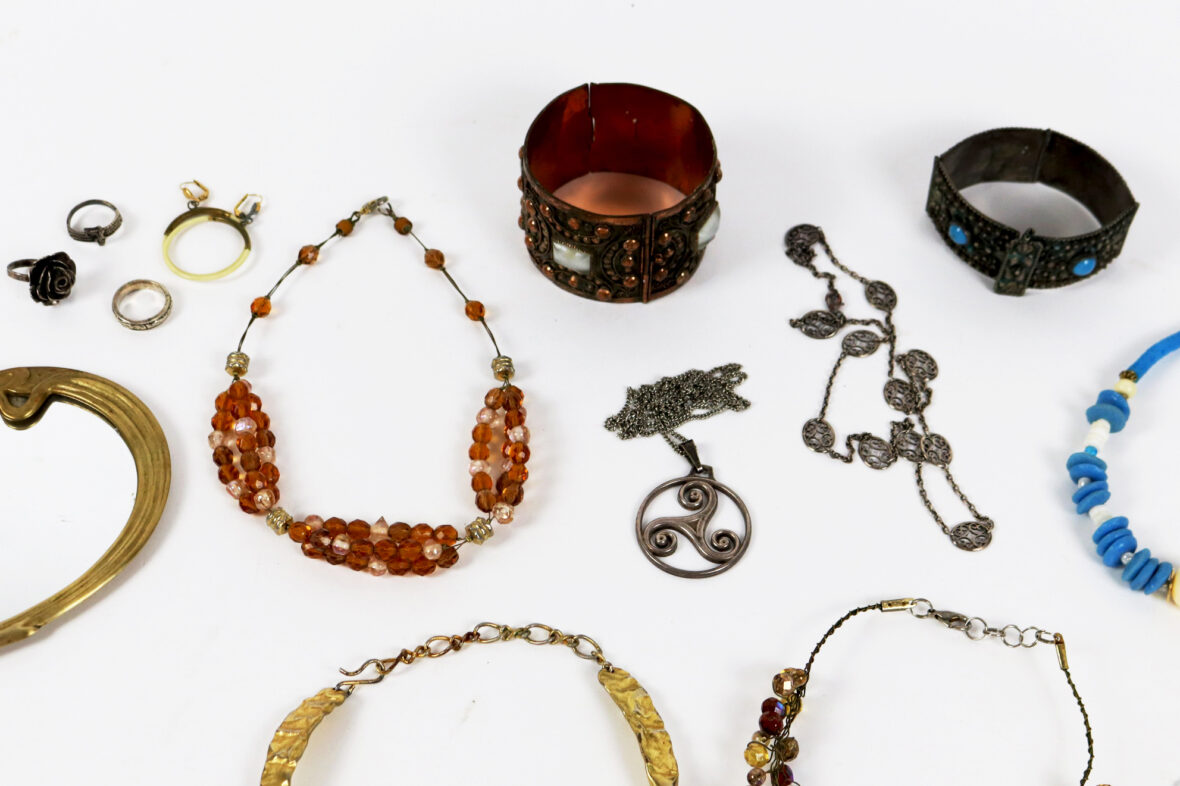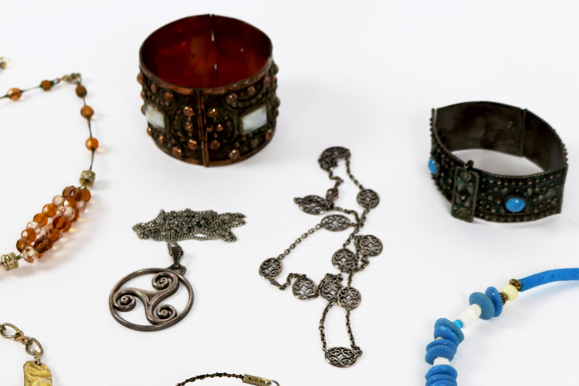 Ensemble comprenant un lot de bijoux de fantaisie, deux bracelets joncs articulés en métal travail d’Europe centrale, un miroir à main en bronze doré à décor de style art nouveau.