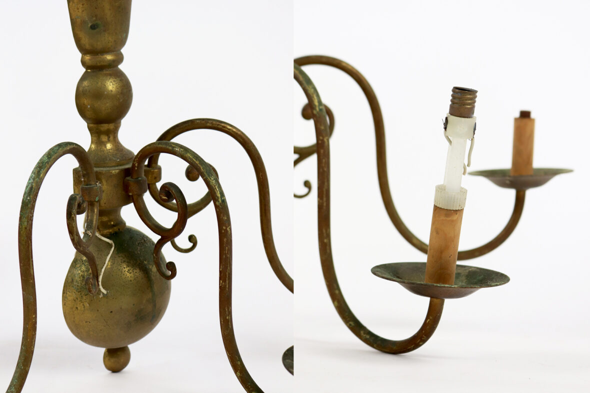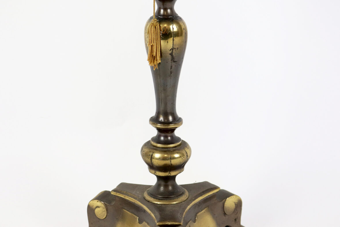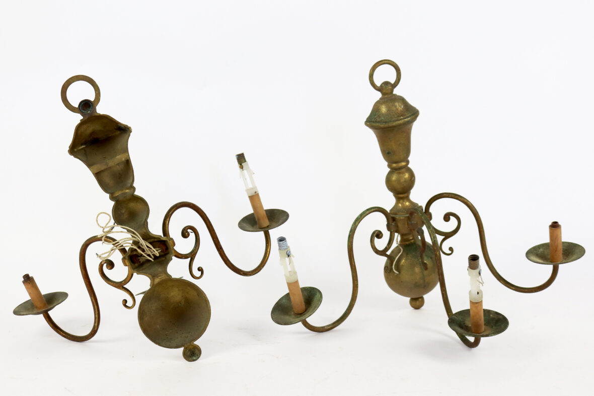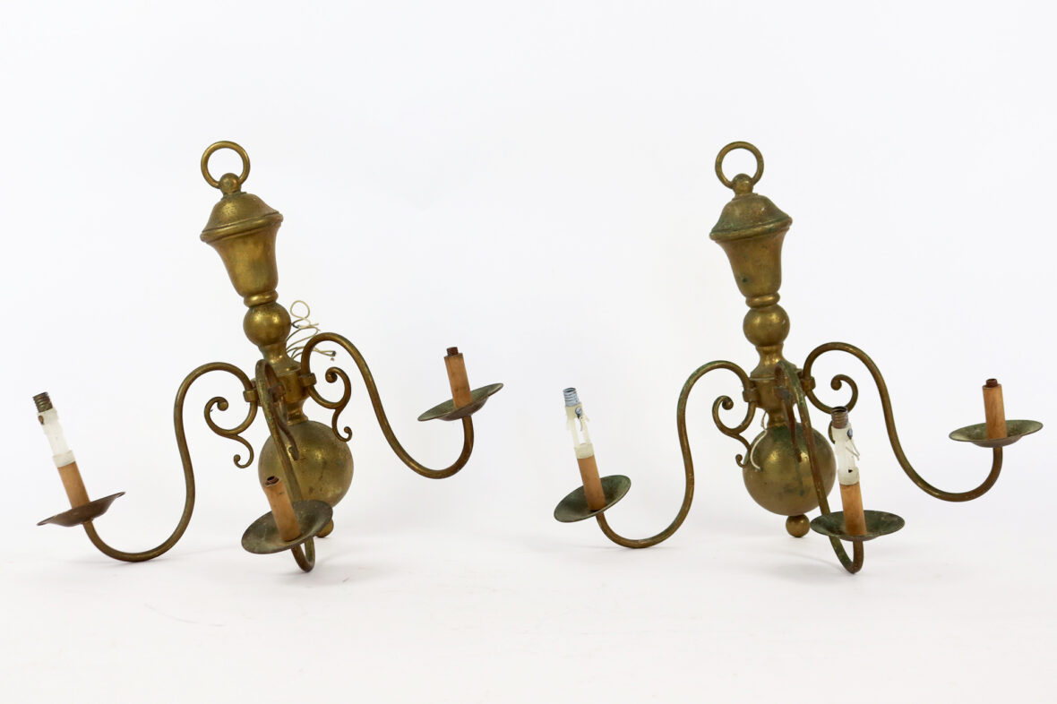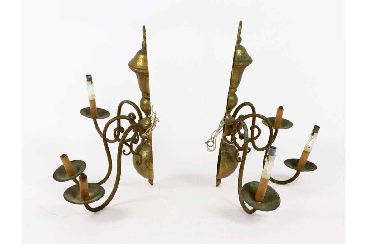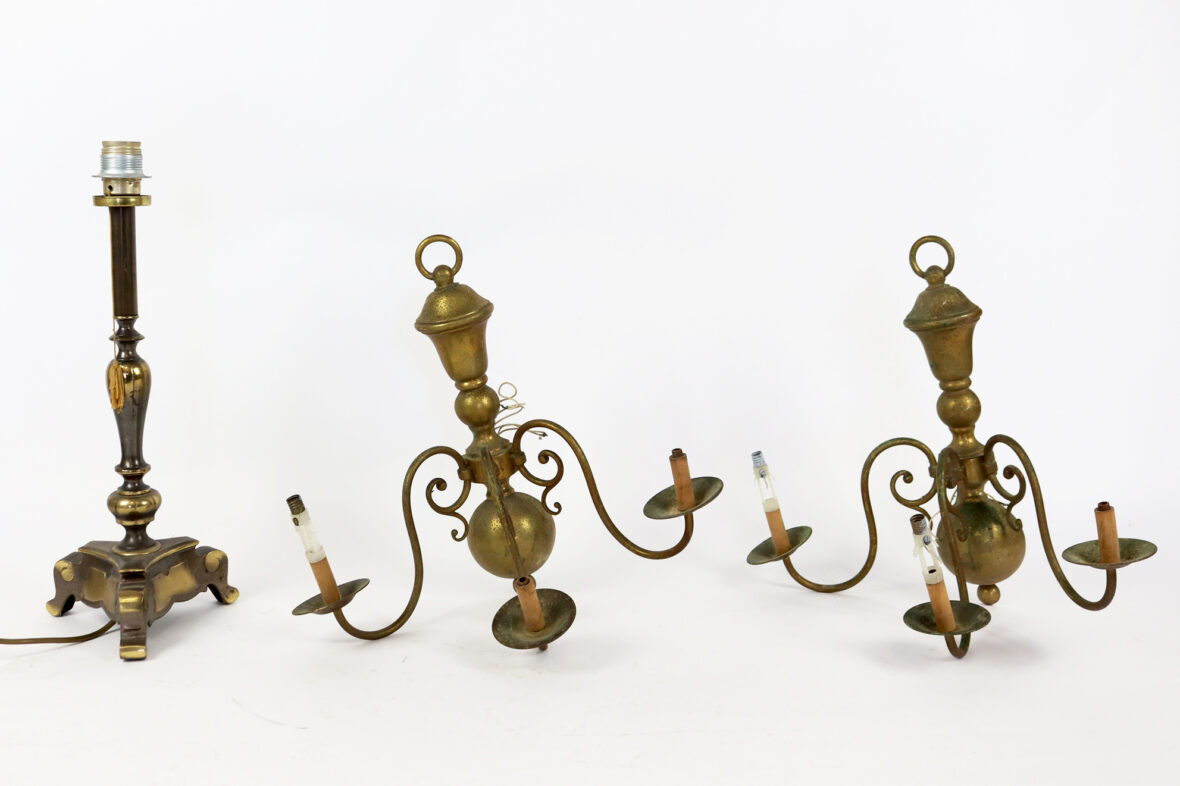 Ensemble comprenant un pied de lampe de forme balustre en métal à patine brune, piètement tripode et une paire d’appliques de style hollandais à trois lumières.