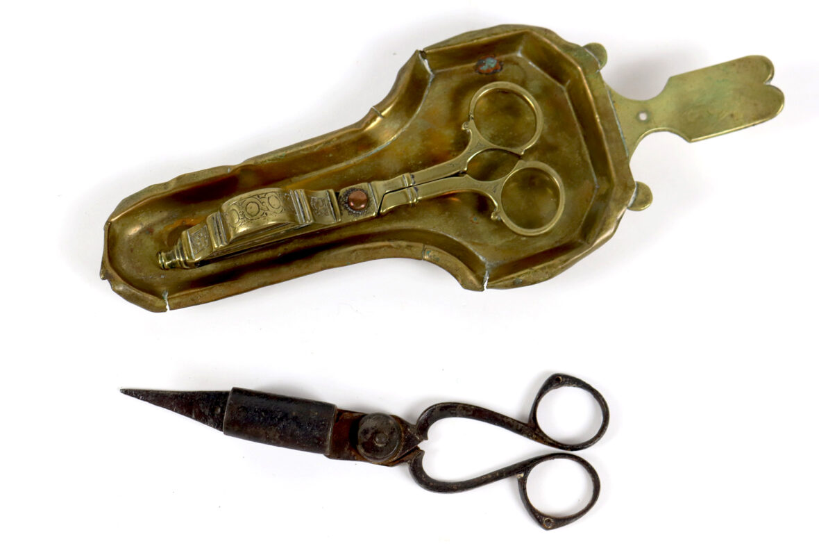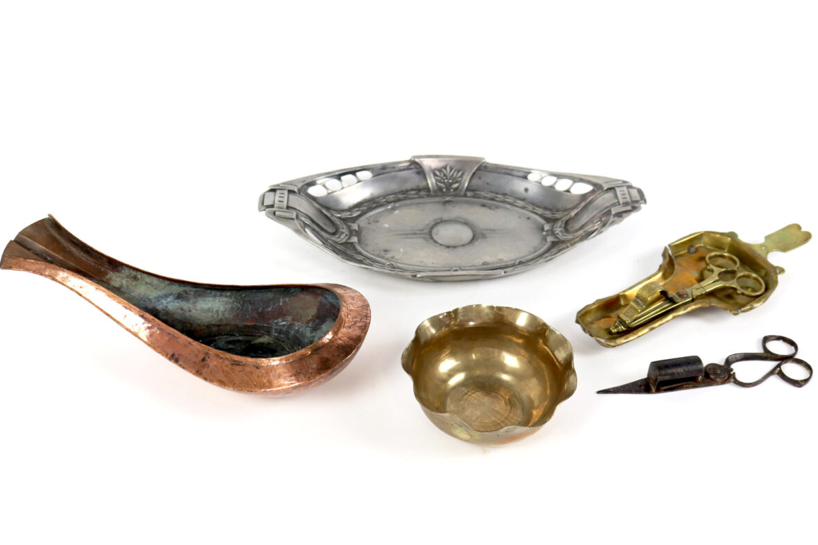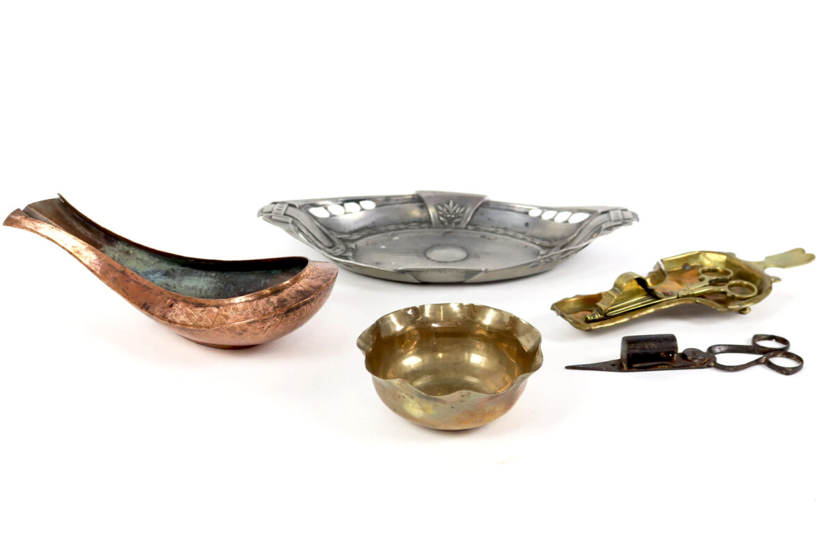 Ensemble comprenant un plateau ovale en métal argenté, un petit bol en métal doré, un récipient (yoni) religieux indou en cuivre, deux paires de mouchettes et un petit plateau.