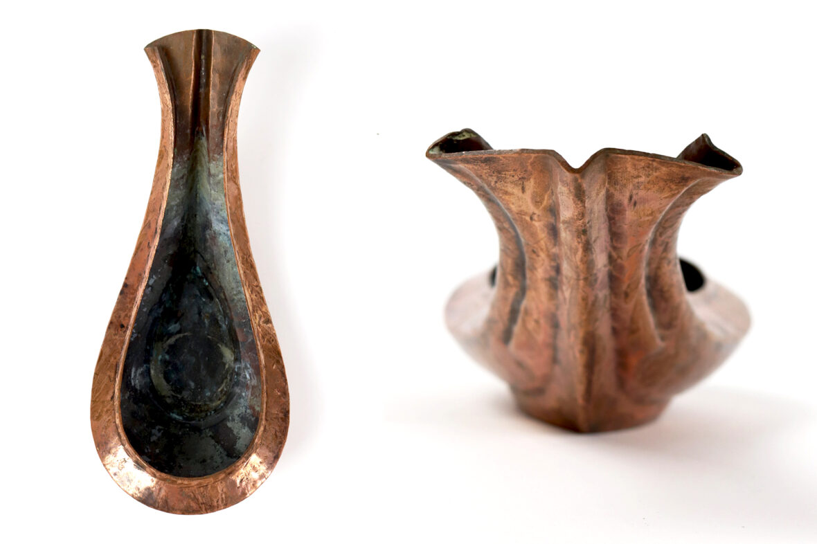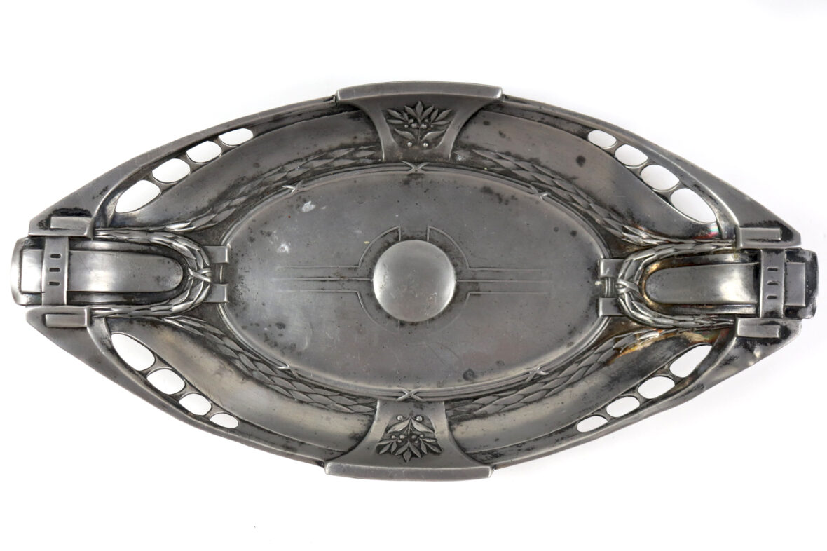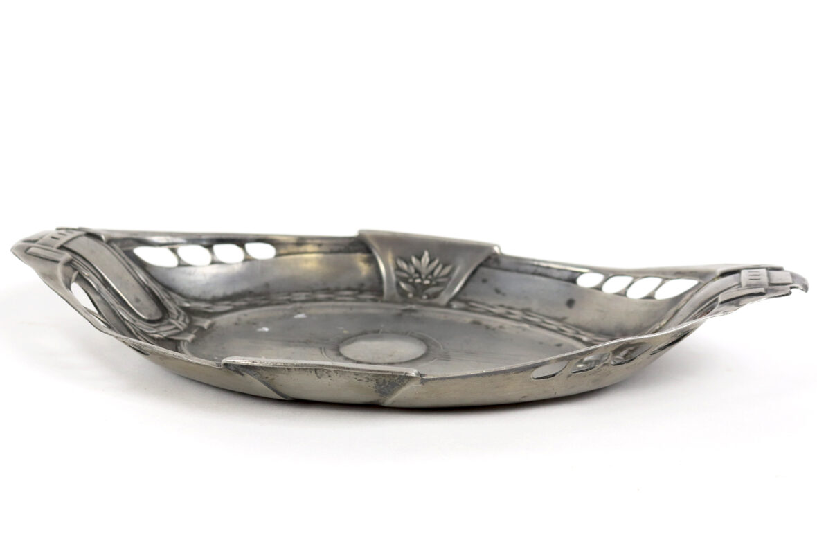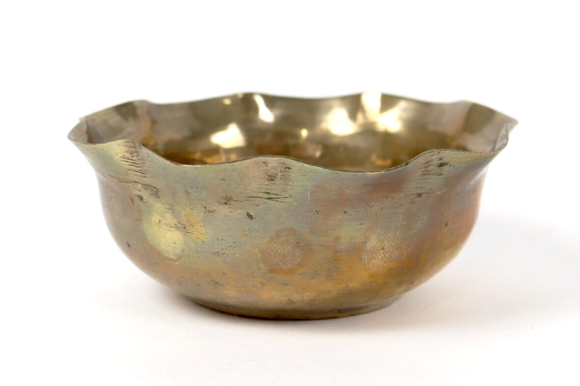 Ensemble comprenant un plateau ovale en métal argenté, un petit bol en métal doré, un récipient (yoni) religieux indou en cuivre, deux paires de mouchettes et un petit plateau.