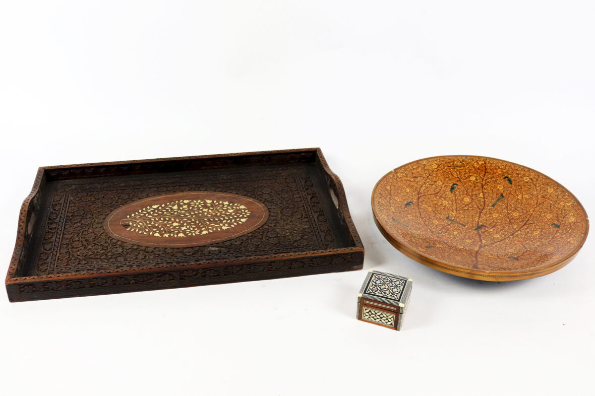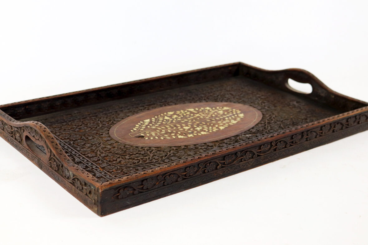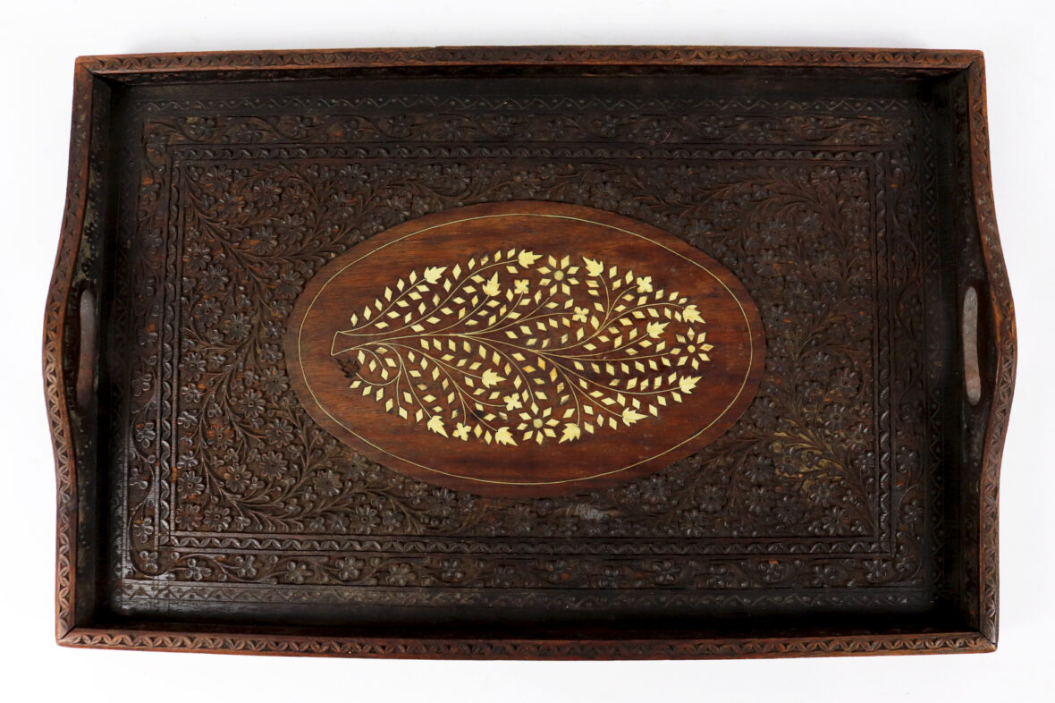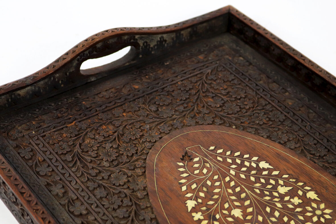 – Un plateau rectangulaire en bois sculpté et marqueterie. Travail oriental.