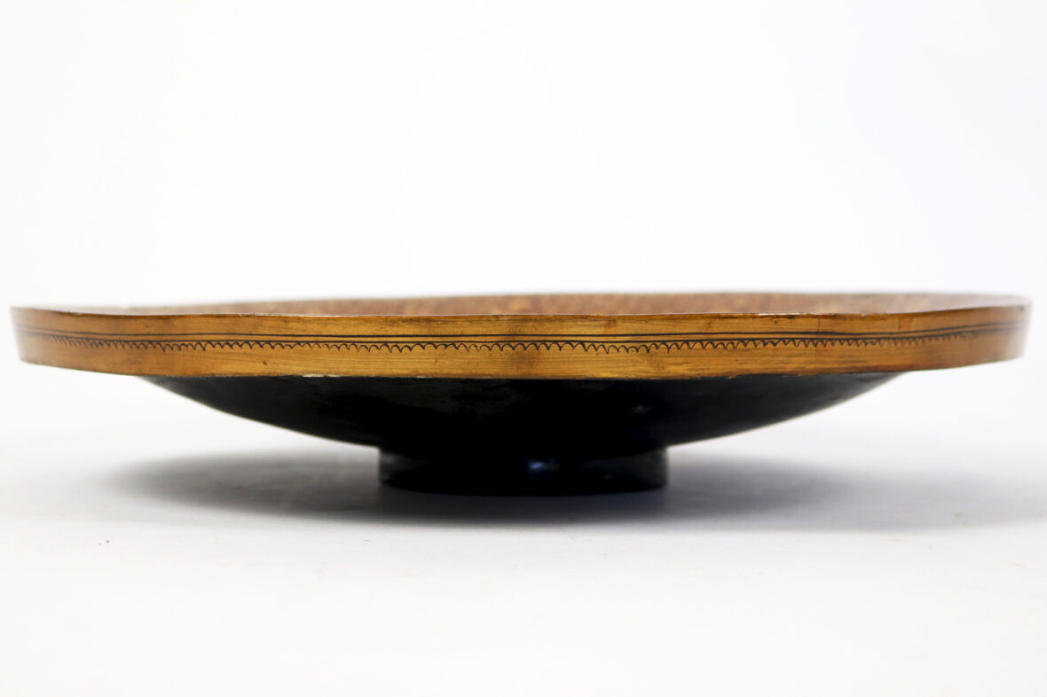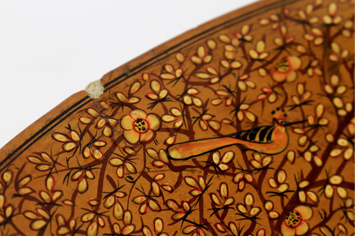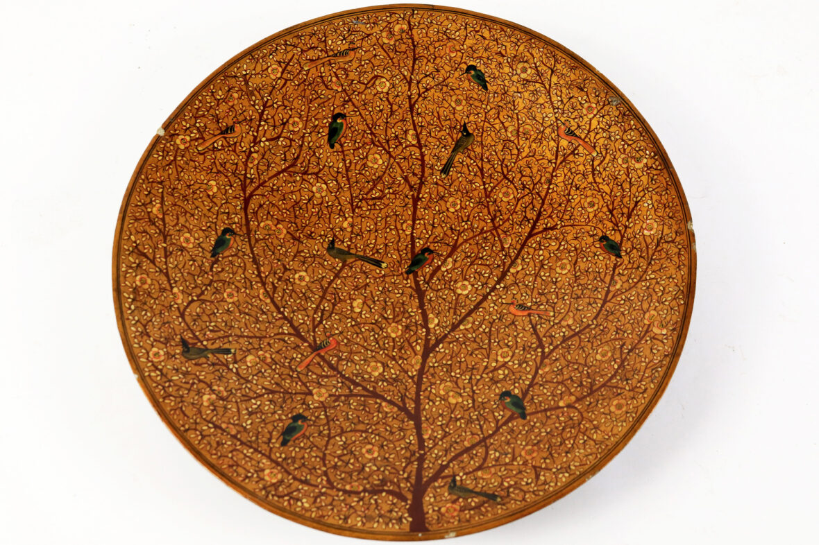 – Un plateau circulaire en bois peint à décor d’oiseaux sur un arbre. (Accident).