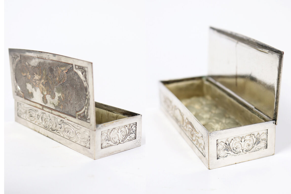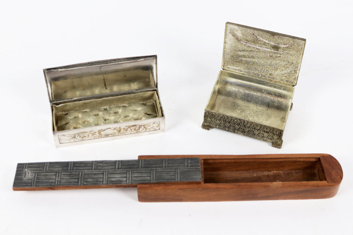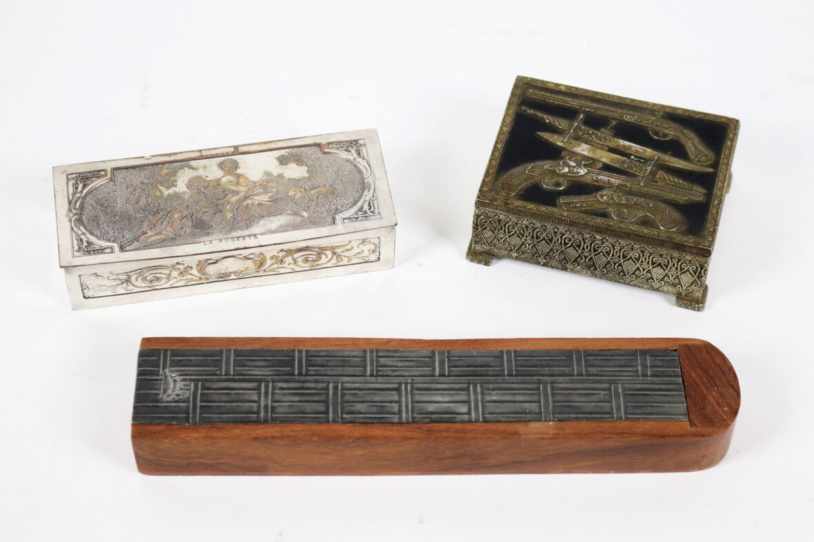 Ensemble comprenant un plumier en bois et couvercle coulissant en métal (Haut. : 2,5 cm – Long. : 21,7 cm); une boîte à bijoux en métal à décor d’une scène galante d’après Boucher, signée B WICKER GR (Haut. : 3 cm – Long. : 13 cm – Prof. : 5,3 cm) et une ancienne boîte à cigarettes à décor d’armes en métal doré (Haut. : 3,5cm – Long. : 9,5 cm – Prof. : 7,5 cm).